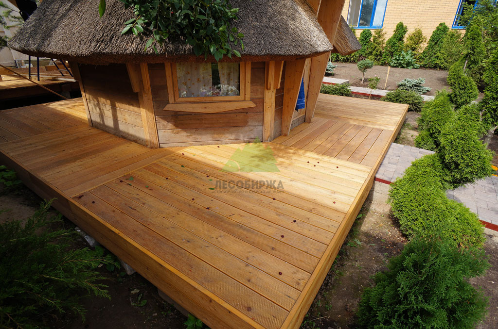 - Стойкость к морозу и влаге: Терраса постоянно подвергается циклам замораживания и оттаивания. Лиственница демонстрирует высокую инертность к влажности после термальной сушки и сохраняет свои прочностные характеристики в любых погодных условиях.