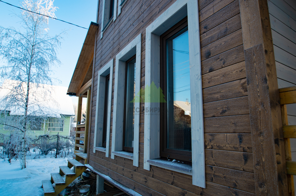 Скошенный планкен, использованный для основной части фасада, был смонтирован таким образом, чтобы создать эффект нахлеста, формируя визуально монолитную, но при этом "дышащую" поверхность. Это решение придает дому благородный и современный вид, схожий с отделкой имитацией бруса, но с более выразительной геометрией. Прямой планкен был применен для оформления углов дома и обрамления оконных и дверных проемов, создавая четкие линии и завершенный образ. Такой подход к комбинированию профилей позволяет добиться гармонии в экстерьере, подчеркивая архитектурные особенности здания.