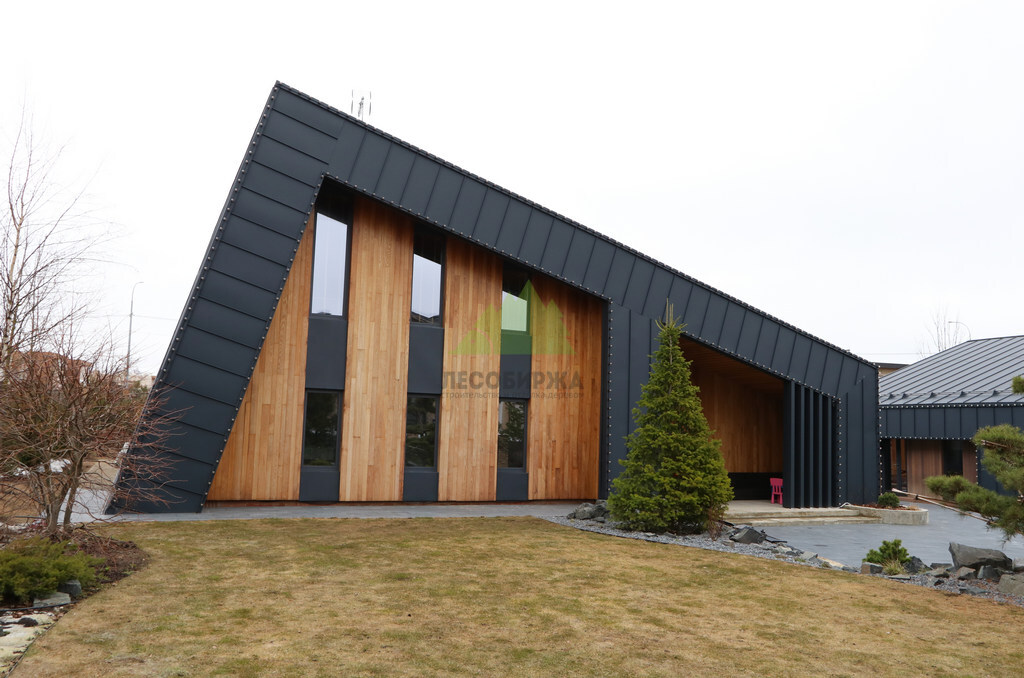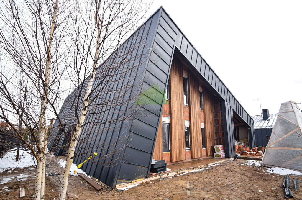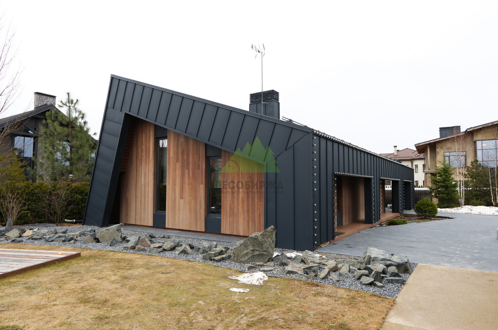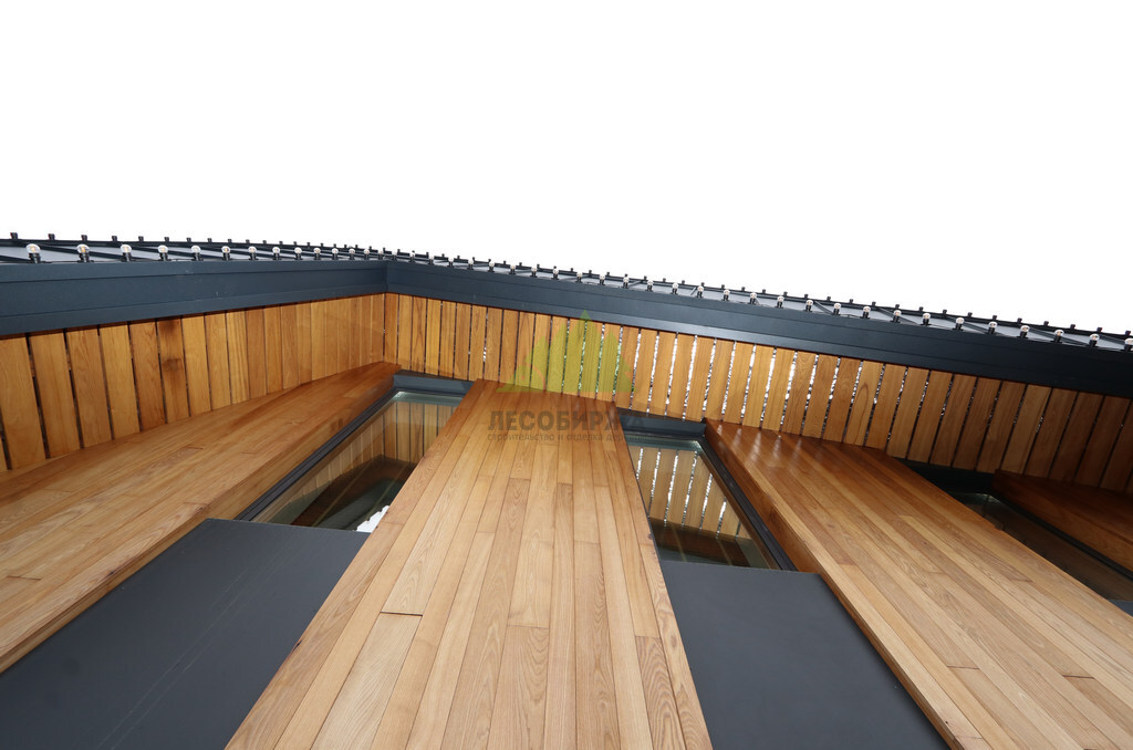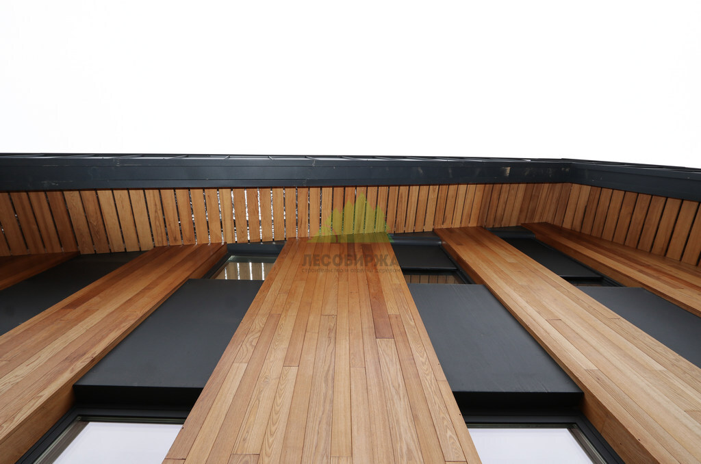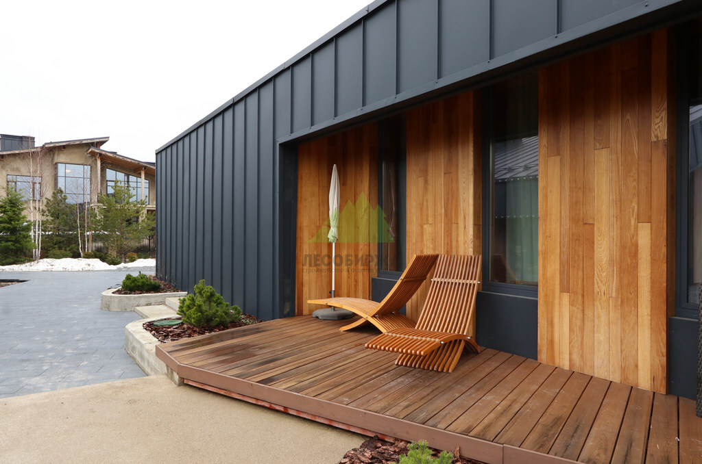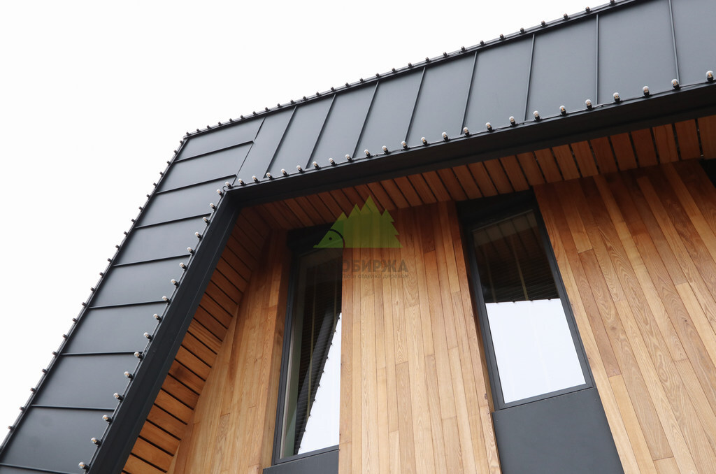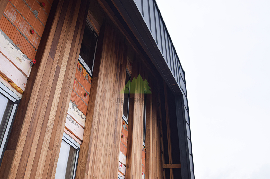 Основой для внешней отделки стали прямой планкен из термоясеня и фальцевые листы. Выбор термоясеня был продиктован его выдающимися эксплуатационными характеристиками и неповторимой текстурой. Планкен монтировался вертикально, "вразбежку", с использованием панелей различной длины и ширины, что добавило фасаду динамичности и оригинальности. Этот подход позволил создать нетривиальный рисунок, уходящий от стандартных решений и подчеркивающий индивидуальность дома.