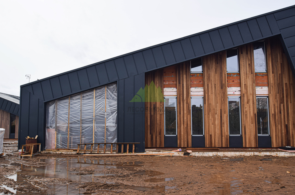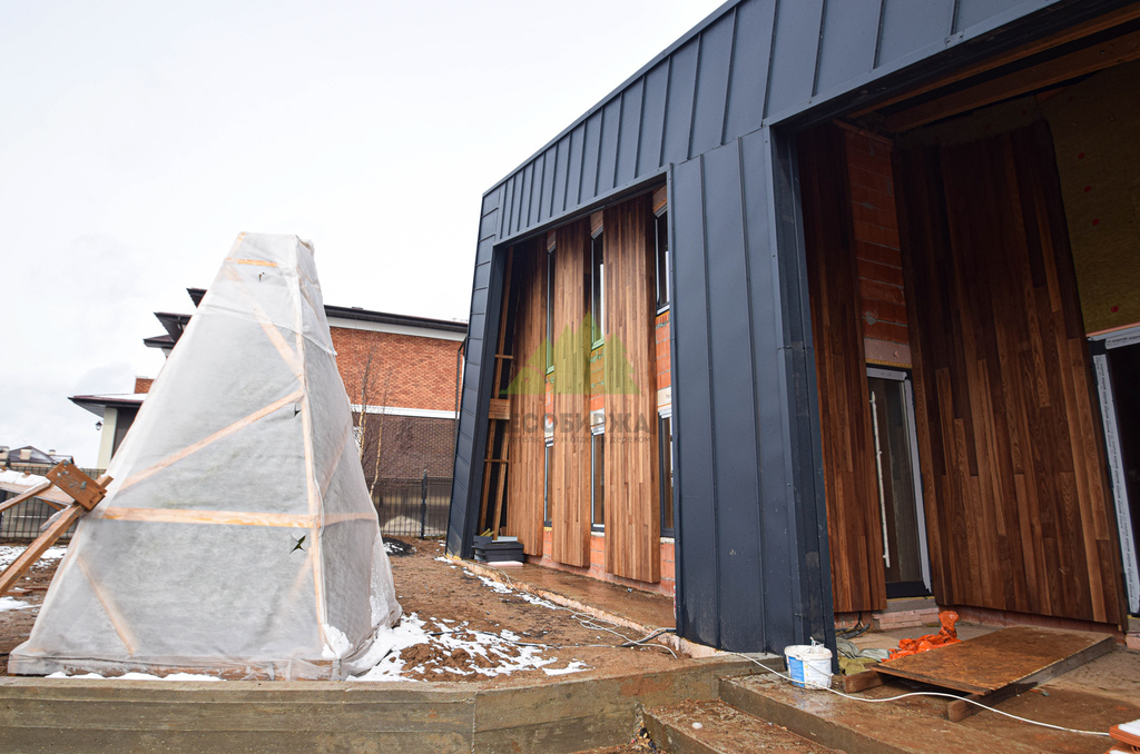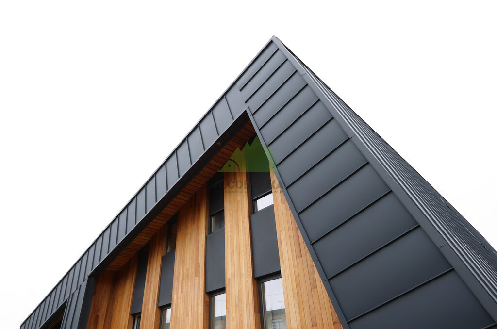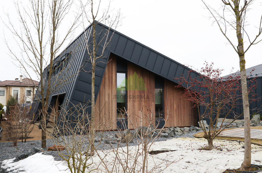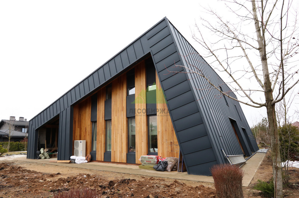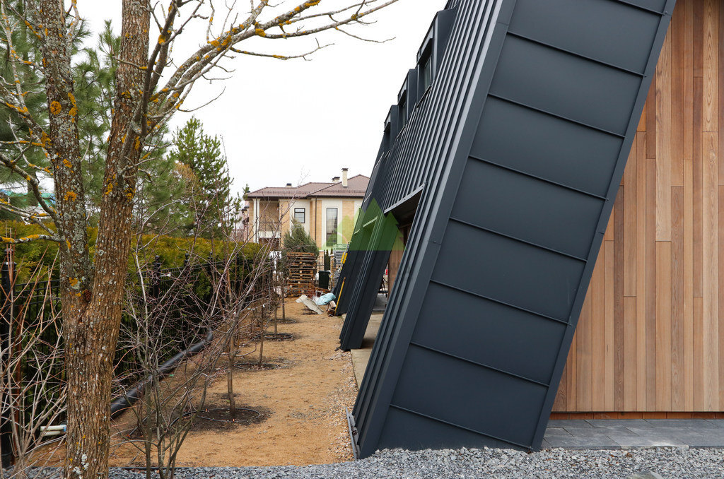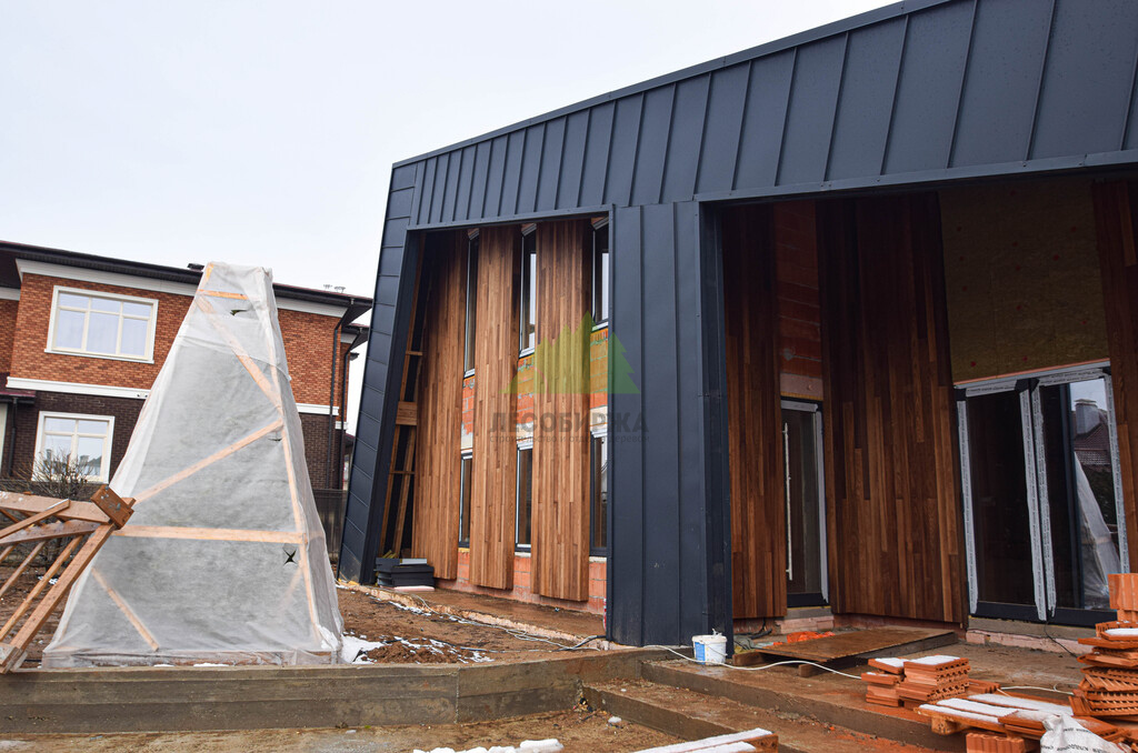 Основой для внешней отделки стали прямой планкен из термоясеня и фальцевые листы. Выбор термоясеня был продиктован его выдающимися эксплуатационными характеристиками и неповторимой текстурой. Планкен монтировался вертикально, "вразбежку", с использованием панелей различной длины и ширины, что добавило фасаду динамичности и оригинальности. Этот подход позволил создать нетривиальный рисунок, уходящий от стандартных решений и подчеркивающий индивидуальность дома.