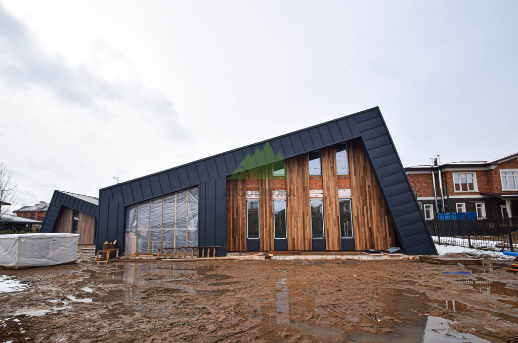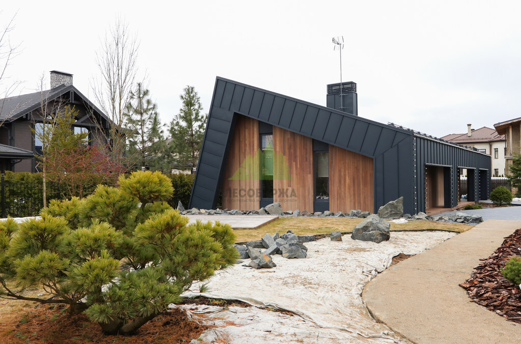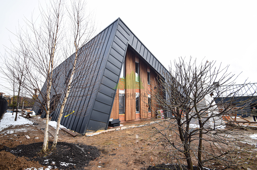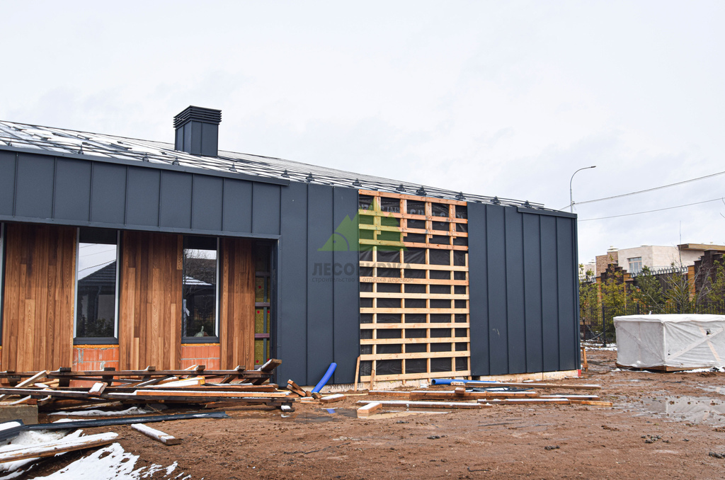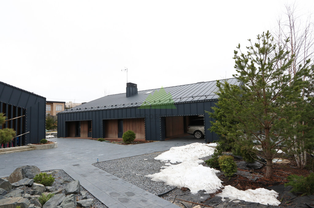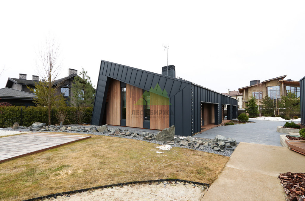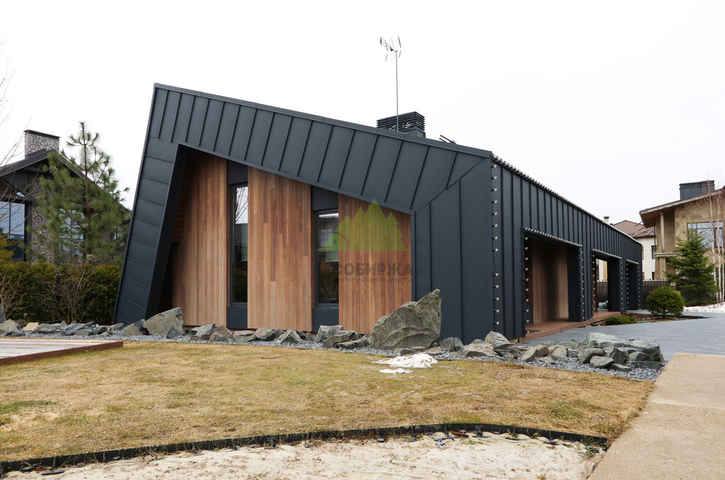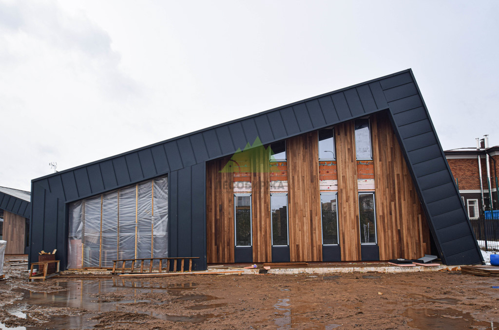 Основой для внешней отделки стали прямой планкен из термоясеня и фальцевые листы. Выбор термоясеня был продиктован его выдающимися эксплуатационными характеристиками и неповторимой текстурой. Планкен монтировался вертикально, "вразбежку", с использованием панелей различной длины и ширины, что добавило фасаду динамичности и оригинальности. Этот подход позволил создать нетривиальный рисунок, уходящий от стандартных решений и подчеркивающий индивидуальность дома.