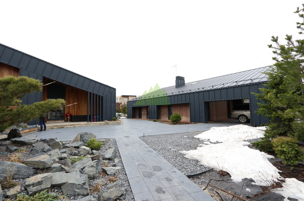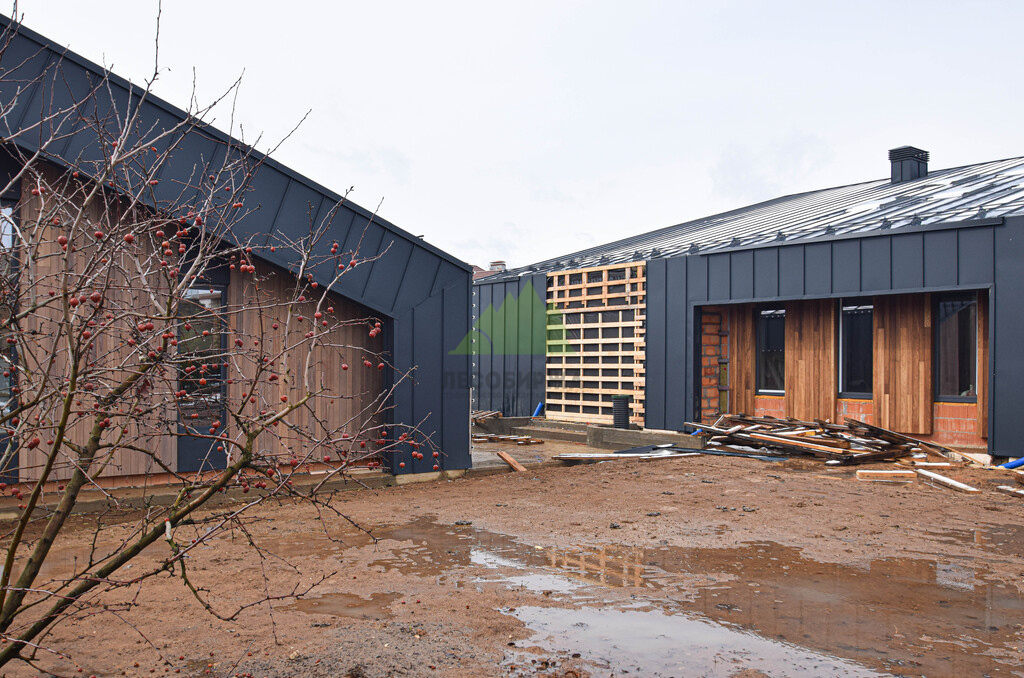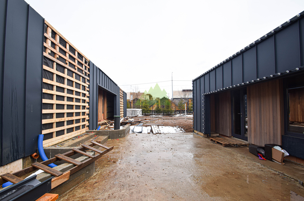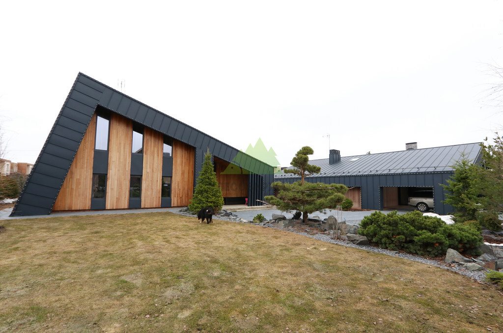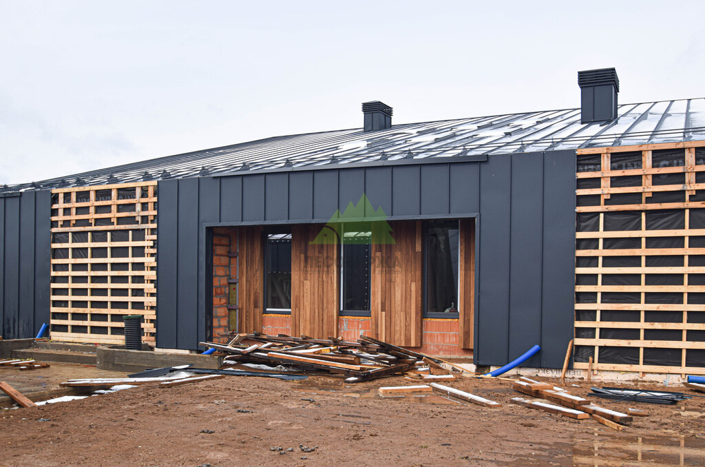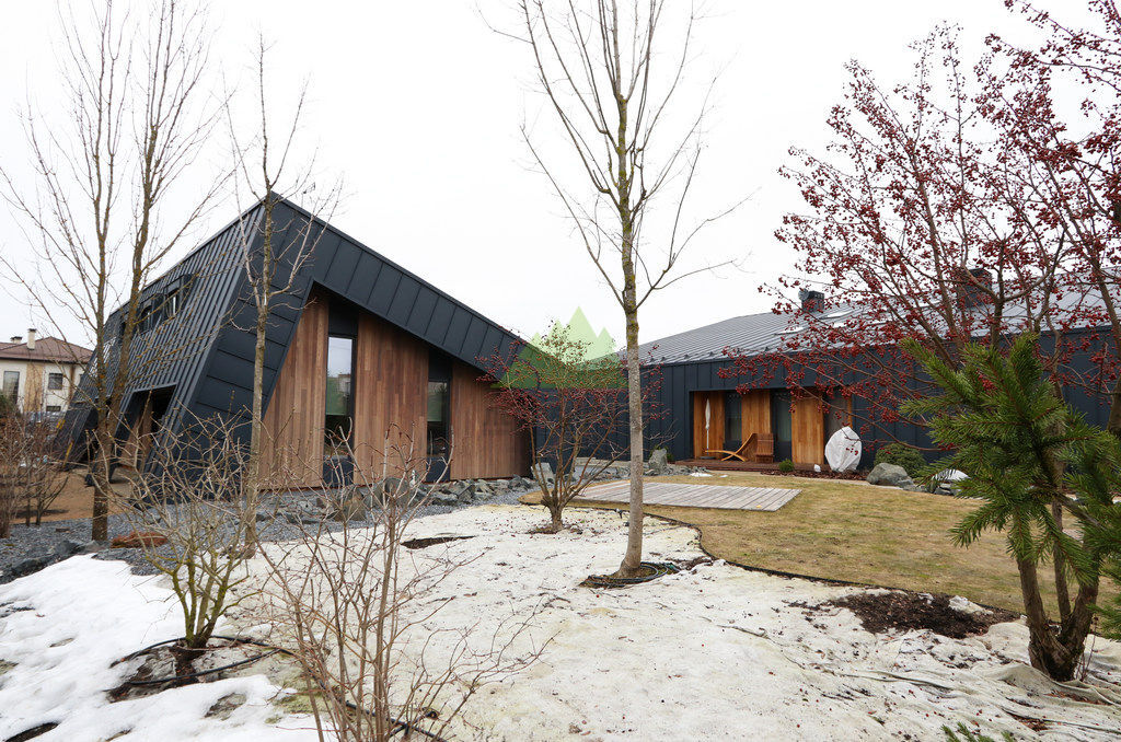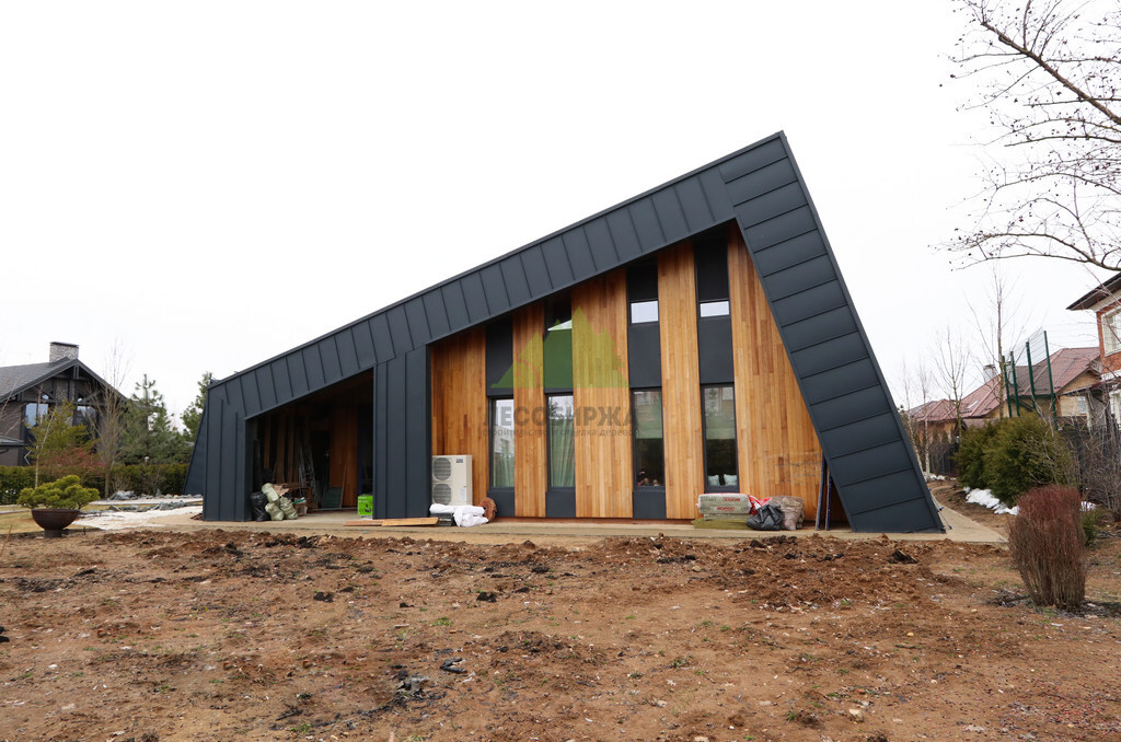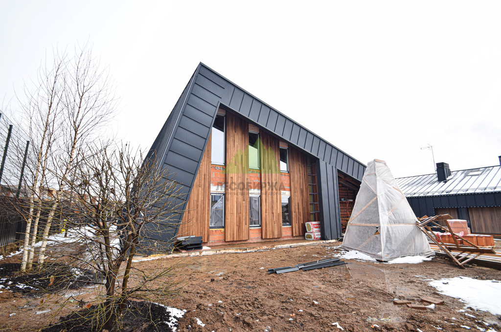 Основой для внешней отделки стали прямой планкен из термоясеня и фальцевые листы. Выбор термоясеня был продиктован его выдающимися эксплуатационными характеристиками и неповторимой текстурой. Планкен монтировался вертикально, "вразбежку", с использованием панелей различной длины и ширины, что добавило фасаду динамичности и оригинальности. Этот подход позволил создать нетривиальный рисунок, уходящий от стандартных решений и подчеркивающий индивидуальность дома.