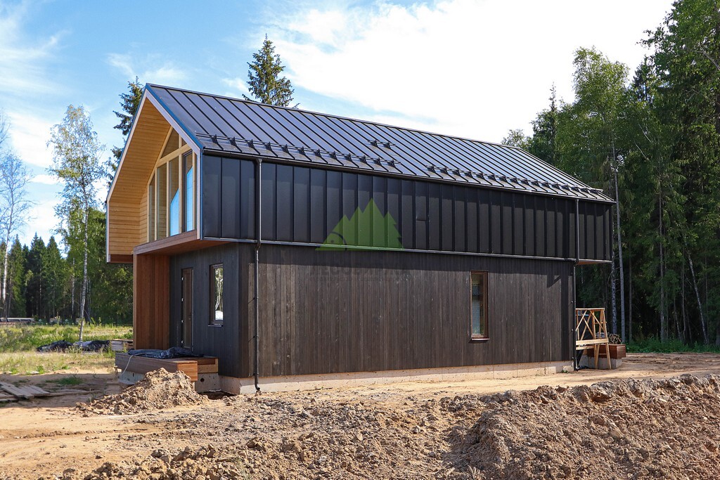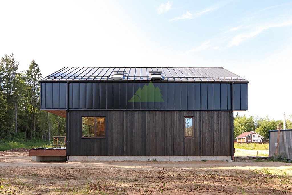 Важной частью "многослойного пирога" фасада является диффузионная мембрана, которая укладывается под планкен. Ее основная функция – надежная защита слоя утеплителя от проникновения влаги и паров, исходящих как извне, так и изнутри помещения. В данном проекте была использована высококачественная трехслойная дышащая мембрана "Brasta Roof" 150. Этот материал не только обладает высокой устойчивостью к перепадам влажности и температур, что крайне важно для климата Ленинградской области, но и является экологически безопасным. Она позволяет утеплителю оставаться сухим и эффективно выполнять свои функции на протяжении всего срока службы дома, обеспечивая комфортный микроклимат внутри и дополнительную энергоэффективность.