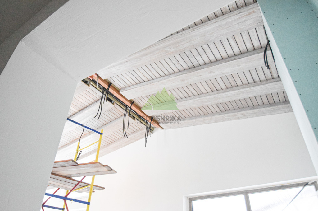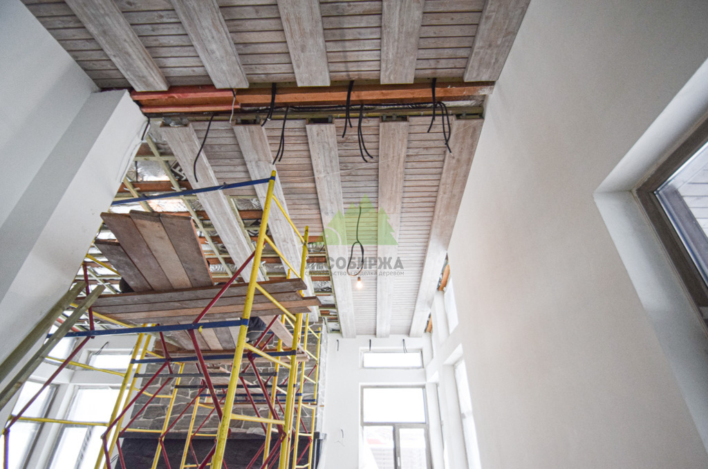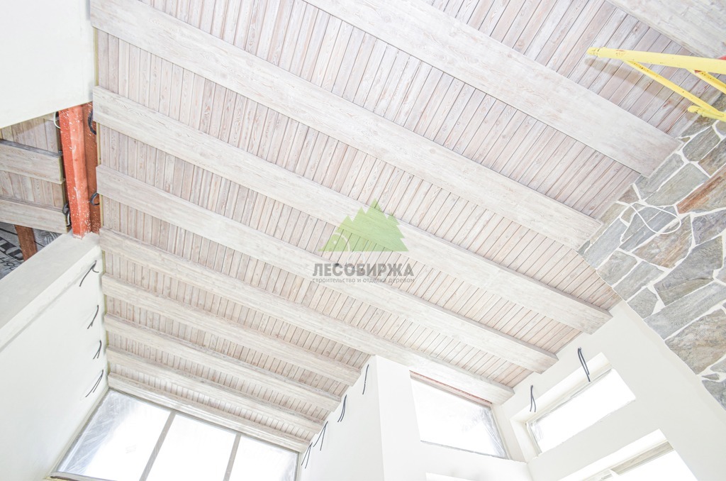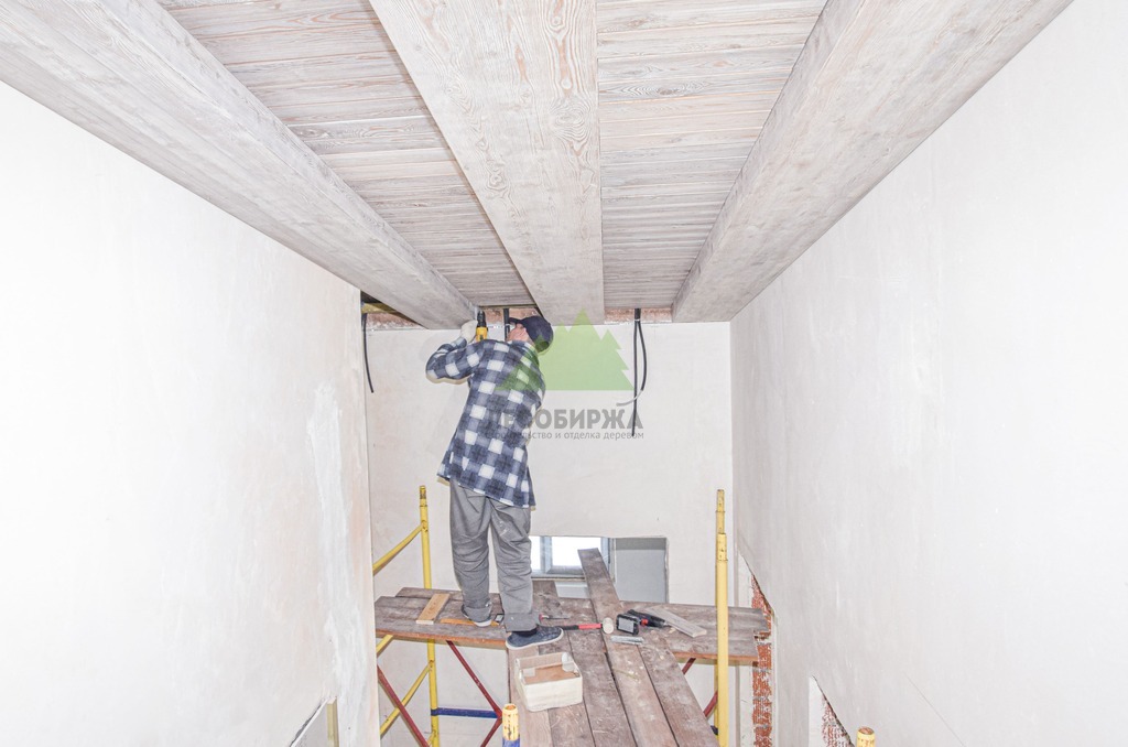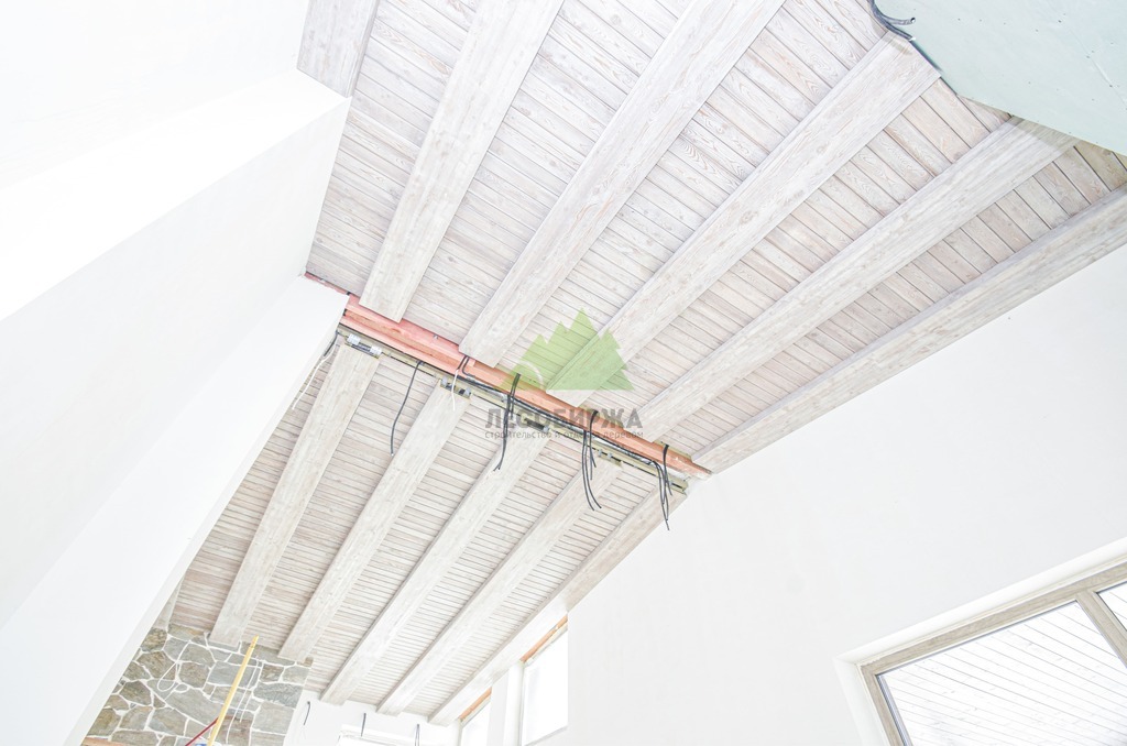 Завершающий этап – художественная отделка. Потолок был обработан специальными составами для патинирования, цвет которых был разработан индивидуально и точно подобран под каменные элементы интерьера. Процесс патинирования, дополненный ручной брашировкой, подчеркнул уникальный рисунок волокон лиственницы, придав ей благородный, состаренный вид. Финальное покрытие защитными маслами и восками не только продлило срок службы древесины, но и усилило глубину цвета, придав поверхности легкое матовое сияние. Результат превзошел все ожидания заказчика: потолок стал настоящим произведением искусства, гармонично вписавшись в общий дизайн дома и придав ему неповторимый шарм. Клиент был в восторге от того, как точно Лесобиржа-Спб смогла воплотить его самые смелые идеи, даже те, что казались технически невыполнимыми. Этот проект в Оредеже еще раз подтвердил высокую квалификацию и способность нашей компании реализовывать самые сложные и эксклюзивные интерьерные решения из дерева в Санкт-Петербурге и Ленинградской области.
