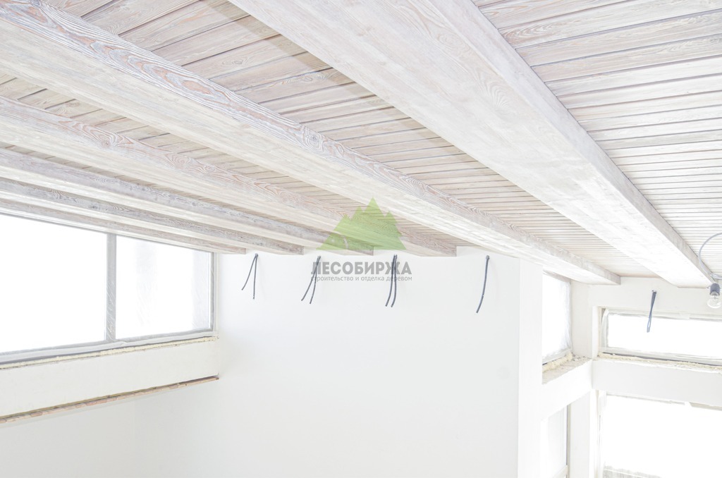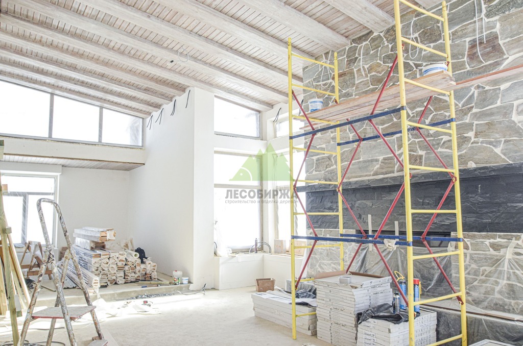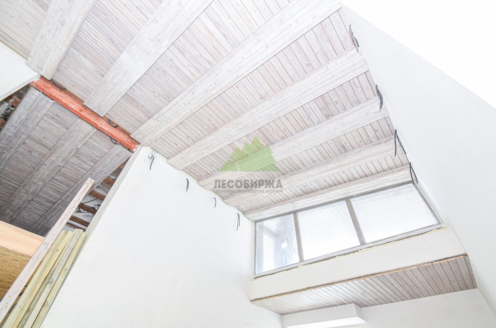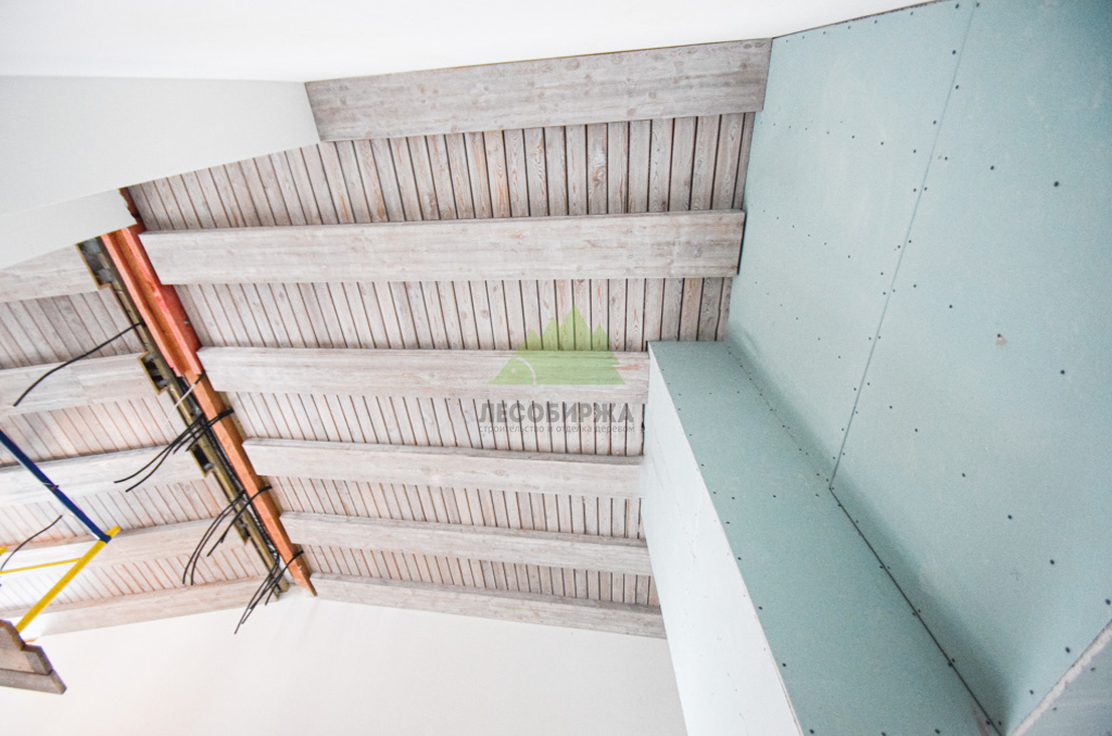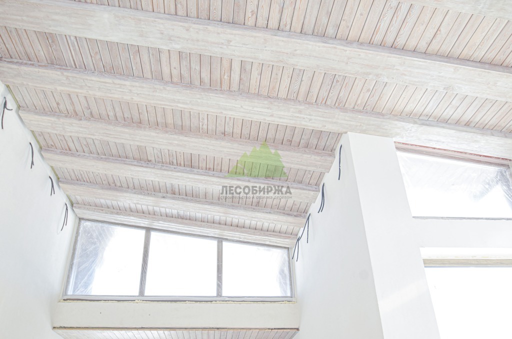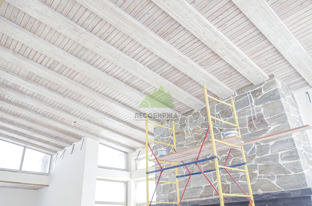 Завершающий этап – художественная отделка. Потолок был обработан специальными составами для патинирования, цвет которых был разработан индивидуально и точно подобран под каменные элементы интерьера. Процесс патинирования, дополненный ручной брашировкой, подчеркнул уникальный рисунок волокон лиственницы, придав ей благородный, состаренный вид. Финальное покрытие защитными маслами и восками не только продлило срок службы древесины, но и усилило глубину цвета, придав поверхности легкое матовое сияние. Результат превзошел все ожидания заказчика: потолок стал настоящим произведением искусства, гармонично вписавшись в общий дизайн дома и придав ему неповторимый шарм. Клиент был в восторге от того, как точно Лесобиржа-Спб смогла воплотить его самые смелые идеи, даже те, что казались технически невыполнимыми. Этот проект в Оредеже еще раз подтвердил высокую квалификацию и способность нашей компании реализовывать самые сложные и эксклюзивные интерьерные решения из дерева в Санкт-Петербурге и Ленинградской области.