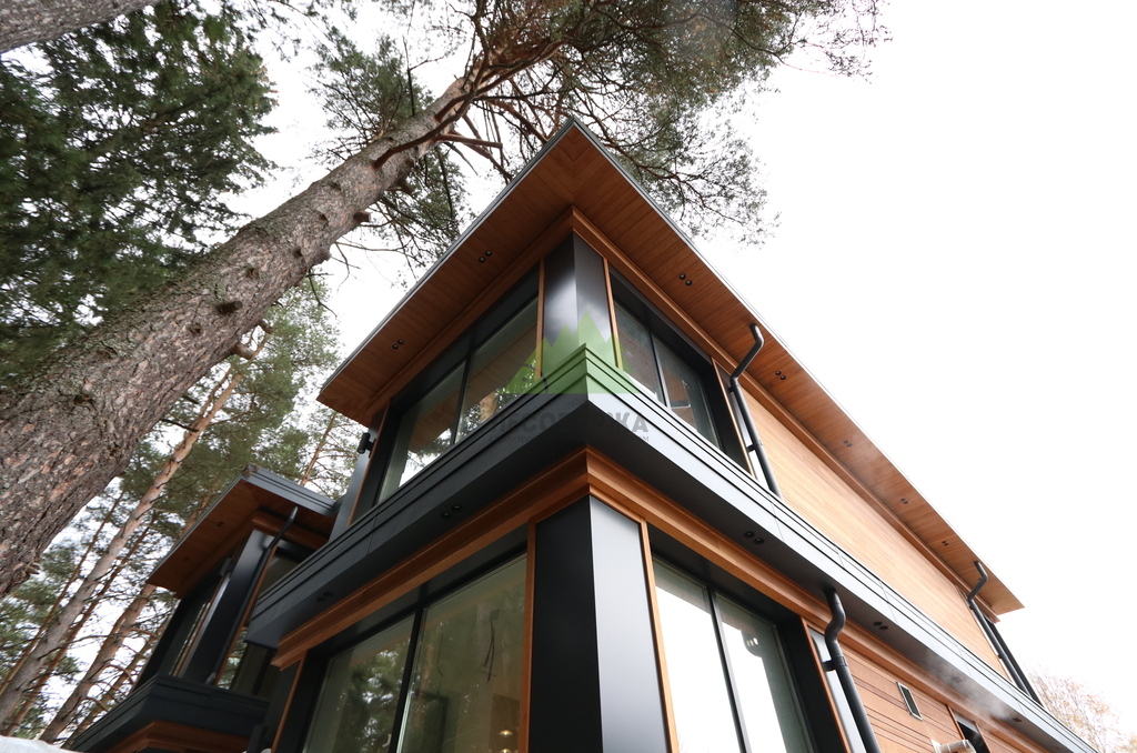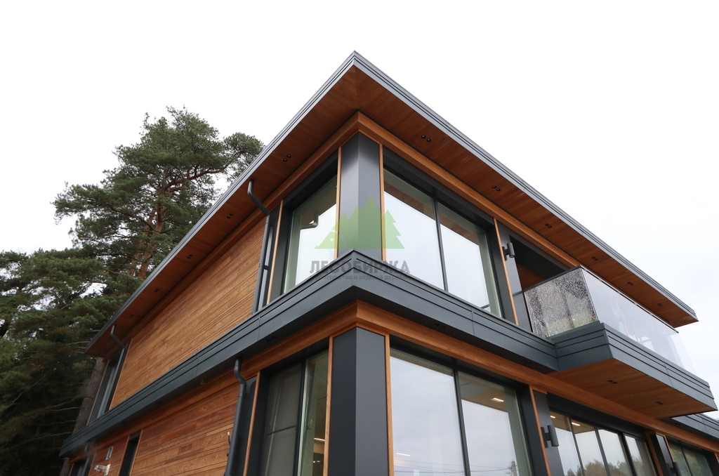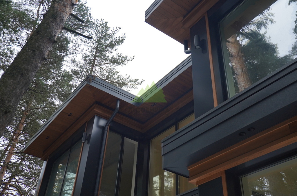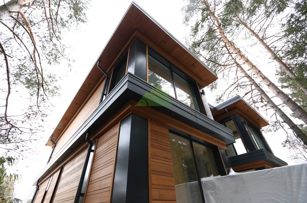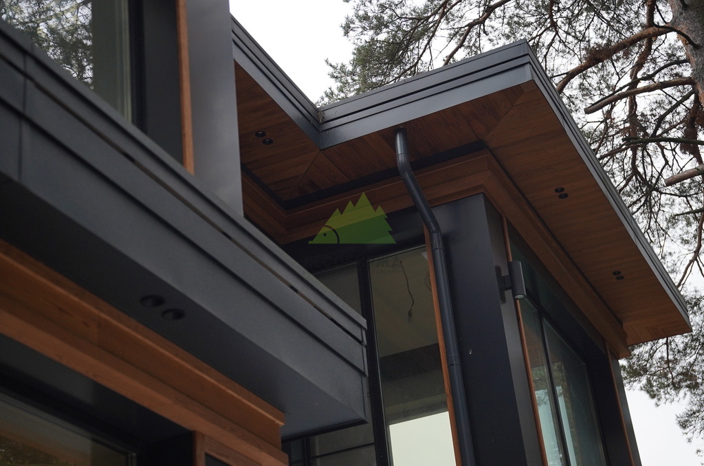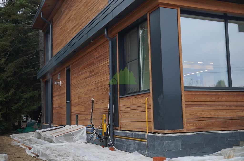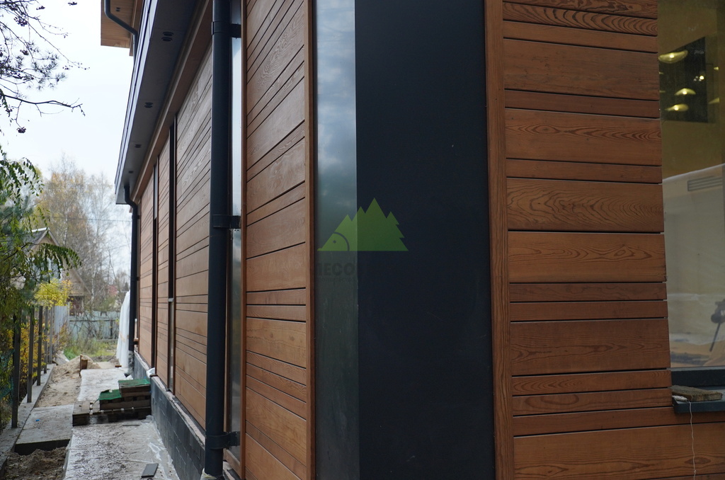 Взгляните на фотографии с данного объекта. Насколько достойно выглядит планкен из термососны в сорте «АВ». Все те особенности доски, которые считаются «дефектами», на самом деле только подчеркивают натуральность происхождения материала. Несомненно, свою роль в этом сыграло качественное лакокрасочное покрытие.