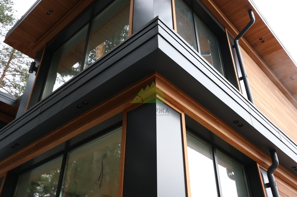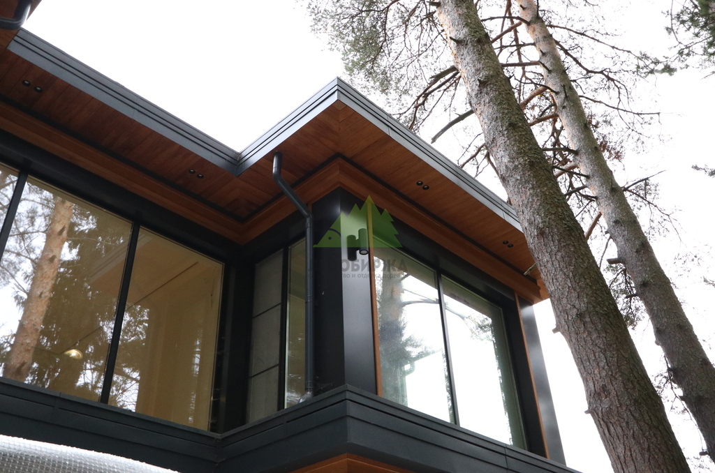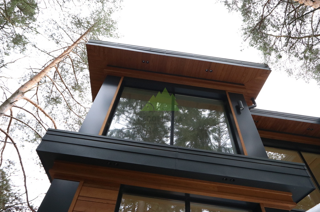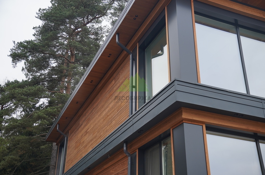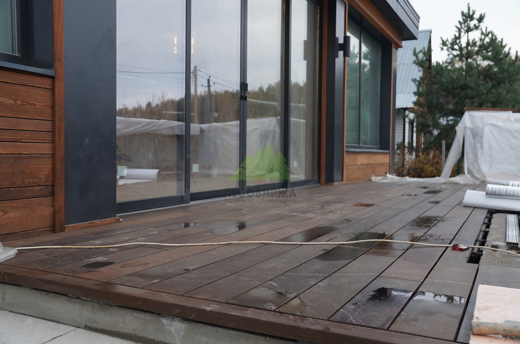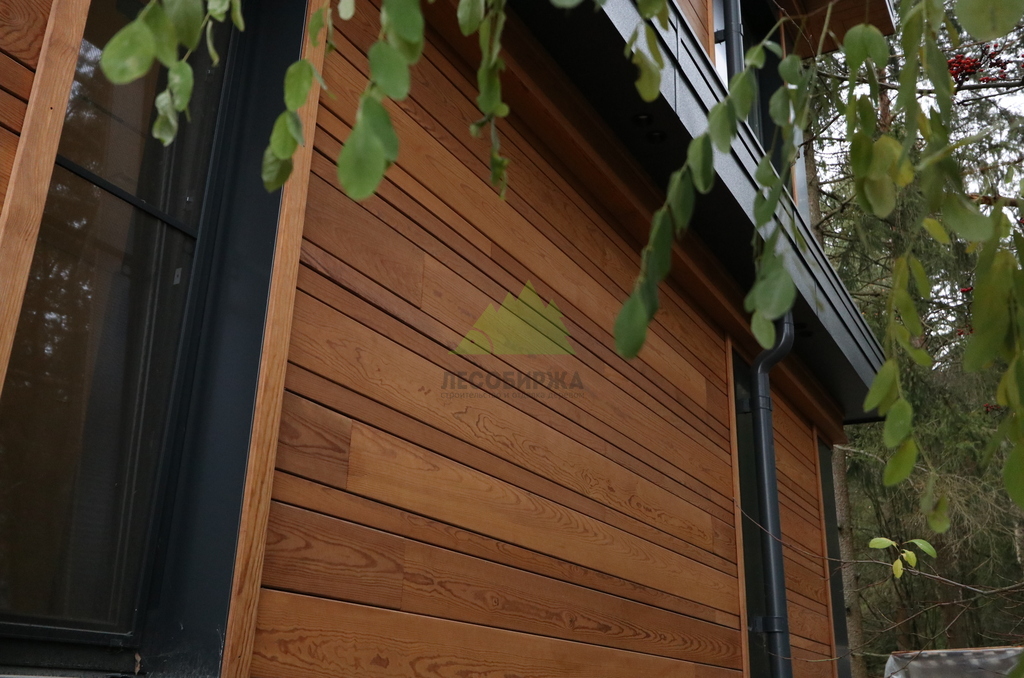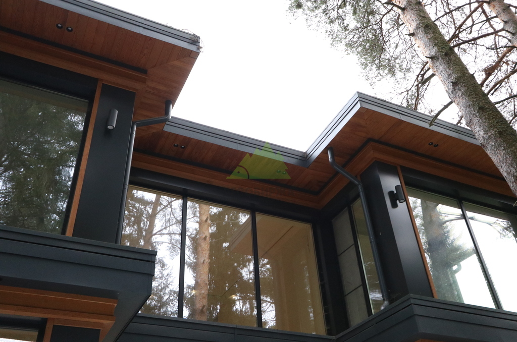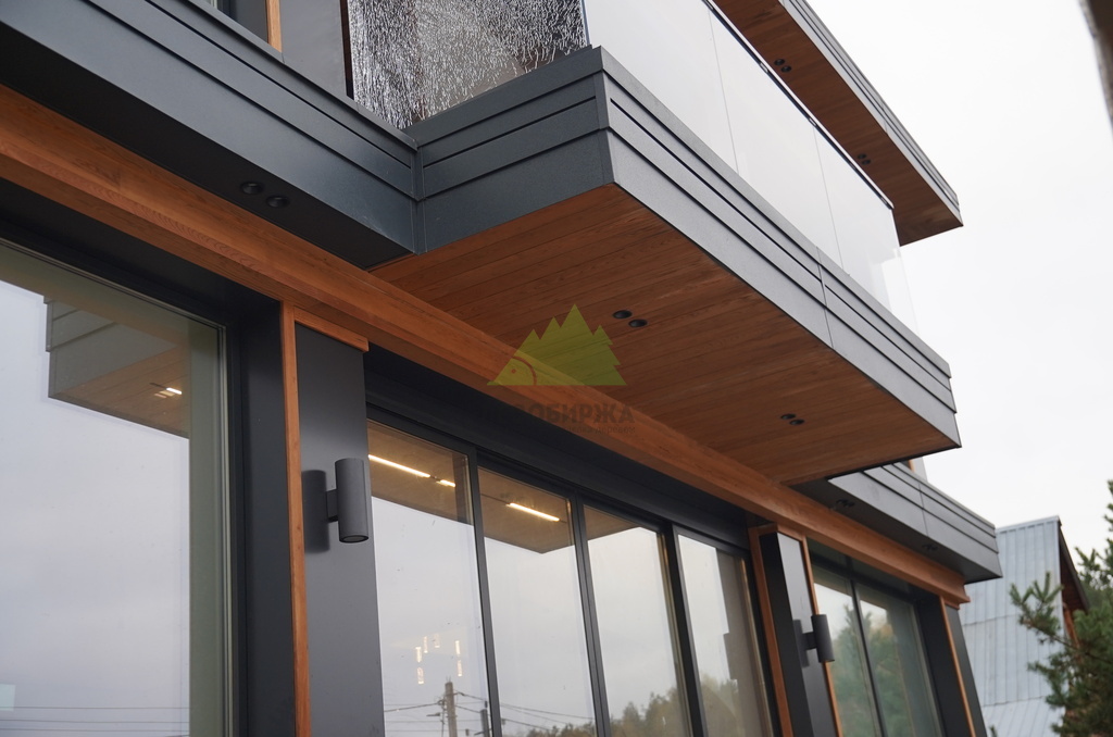 Взгляните на фотографии с данного объекта. Насколько достойно выглядит планкен из термососны в сорте «АВ». Все те особенности доски, которые считаются «дефектами», на самом деле только подчеркивают натуральность происхождения материала. Несомненно, свою роль в этом сыграло качественное лакокрасочное покрытие.