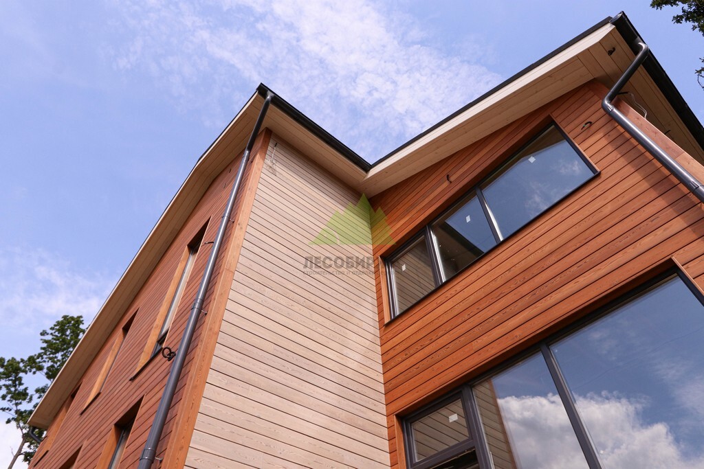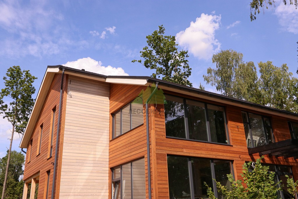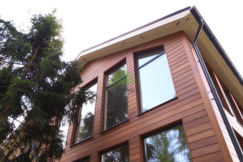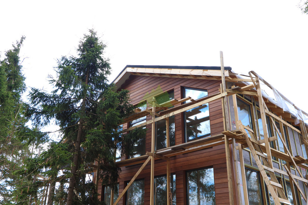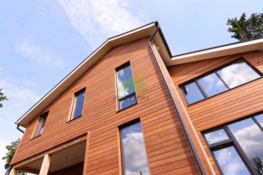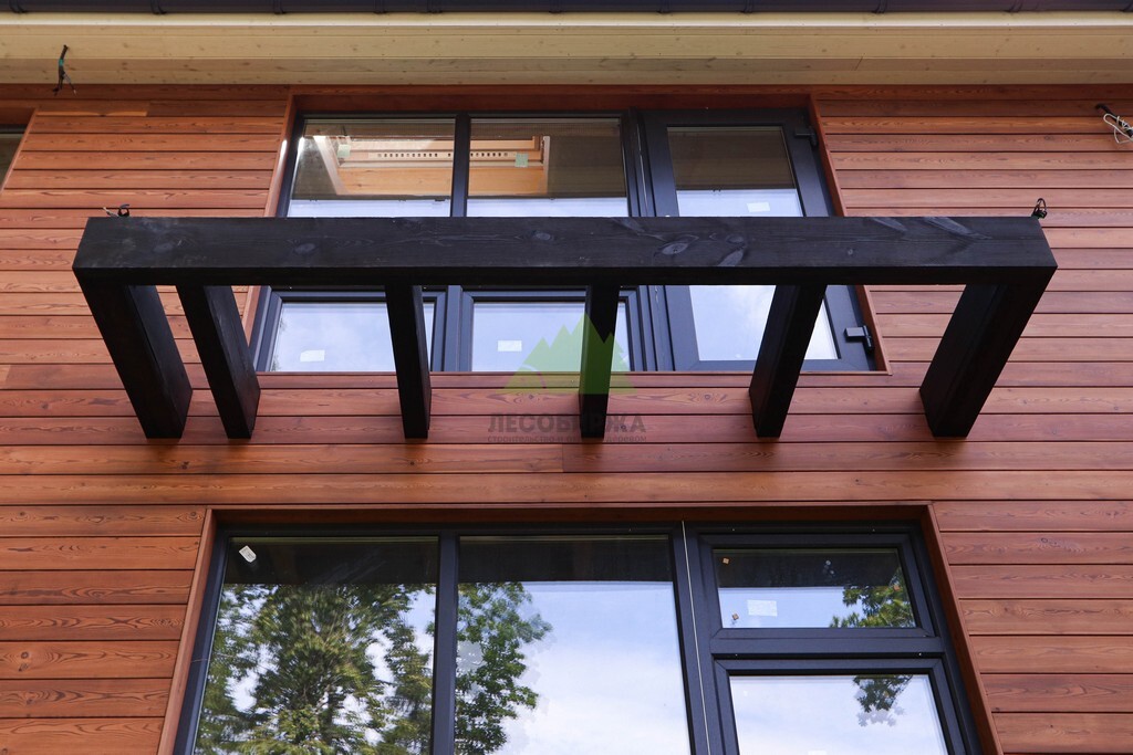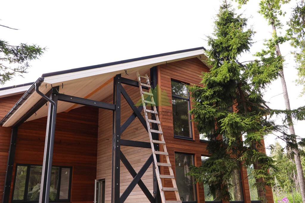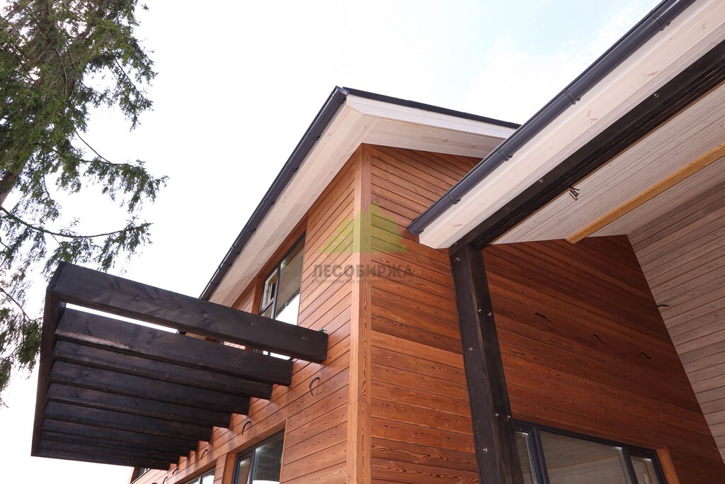 Помимо основной обшивки фасада, не менее важной частью работы был монтаж свесов кровли. Для этой задачи мы выбрали прямой планкен из северной сосны. Несмотря на свою относительно невысокую стоимость по сравнению с термолиственницей, северная сосна является прекрасным материалом для таких элементов благодаря своей высокой прочности, устойчивости к деформациям и хорошим эксплуатационным характеристикам. Важно отметить, что даже такой материал, как сосна, получает от наших специалистов максимальное внимание к защите. Все панели были тщательно обработаны высокоэффективными антисептическими составами, что значительно продлевает срок их службы, защищая от влаги, грибка и насекомых, а также сохраняет их первоначальный вид на долгие годы.