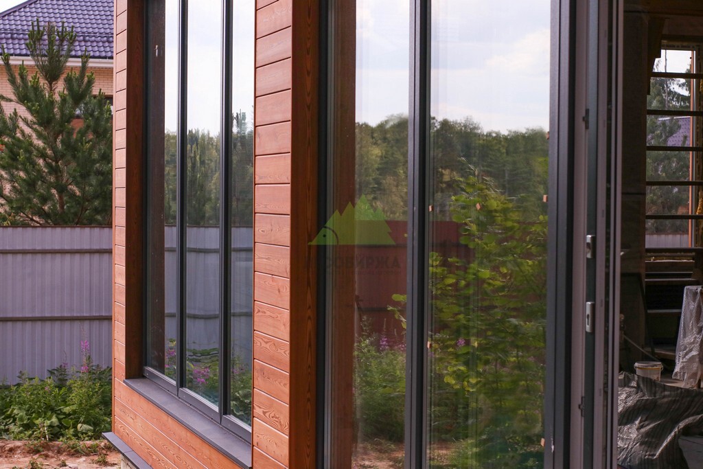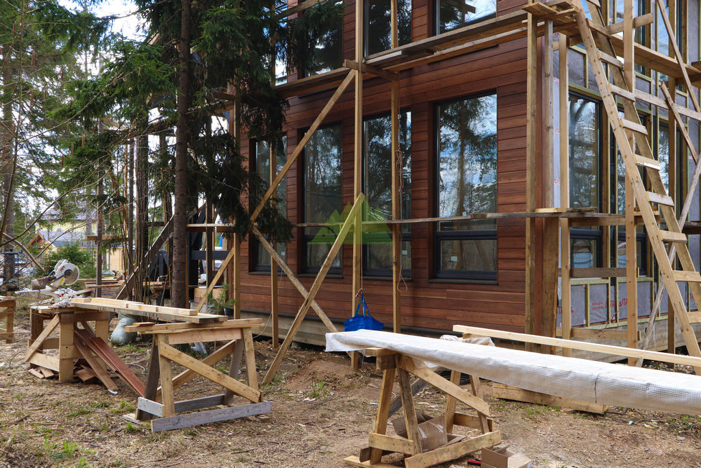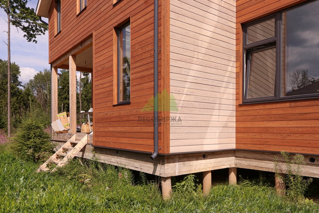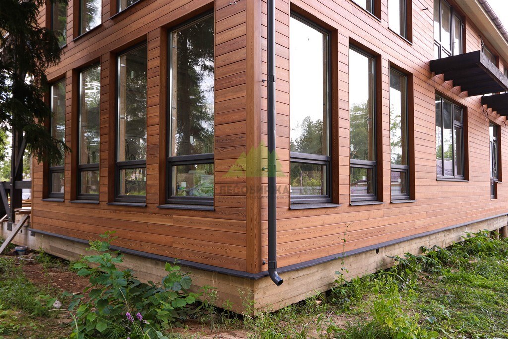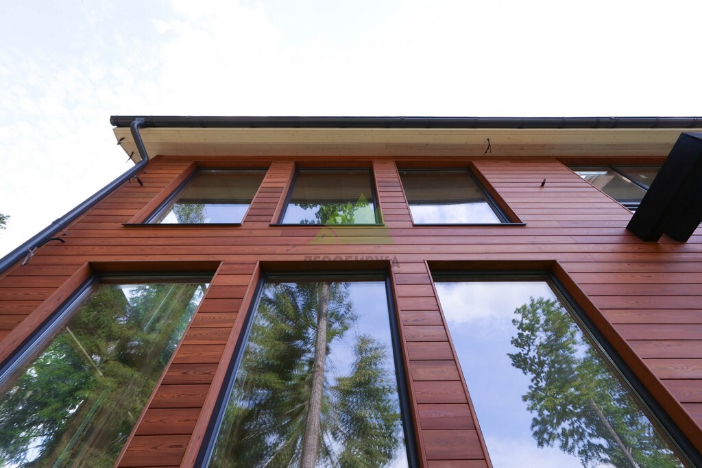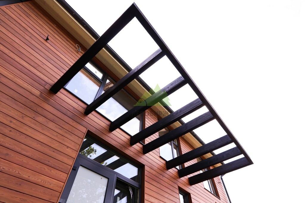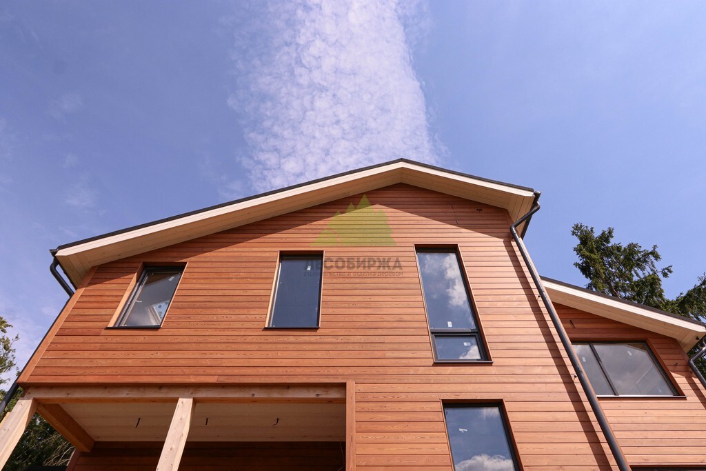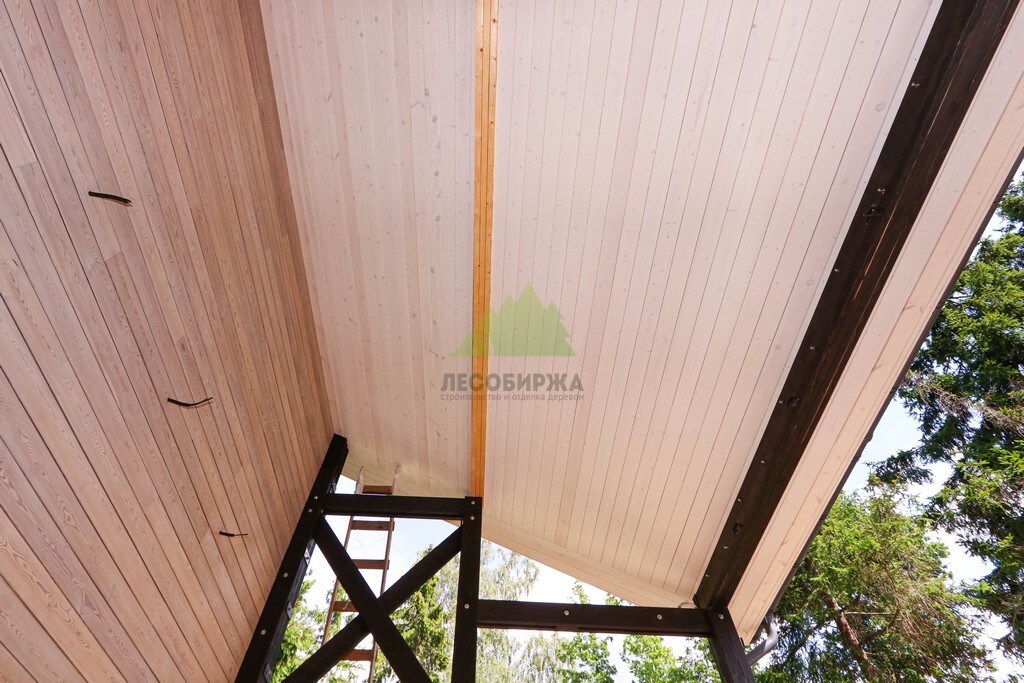 Помимо основной обшивки фасада, не менее важной частью работы был монтаж свесов кровли. Для этой задачи мы выбрали прямой планкен из северной сосны. Несмотря на свою относительно невысокую стоимость по сравнению с термолиственницей, северная сосна является прекрасным материалом для таких элементов благодаря своей высокой прочности, устойчивости к деформациям и хорошим эксплуатационным характеристикам. Важно отметить, что даже такой материал, как сосна, получает от наших специалистов максимальное внимание к защите. Все панели были тщательно обработаны высокоэффективными антисептическими составами, что значительно продлевает срок их службы, защищая от влаги, грибка и насекомых, а также сохраняет их первоначальный вид на долгие годы.