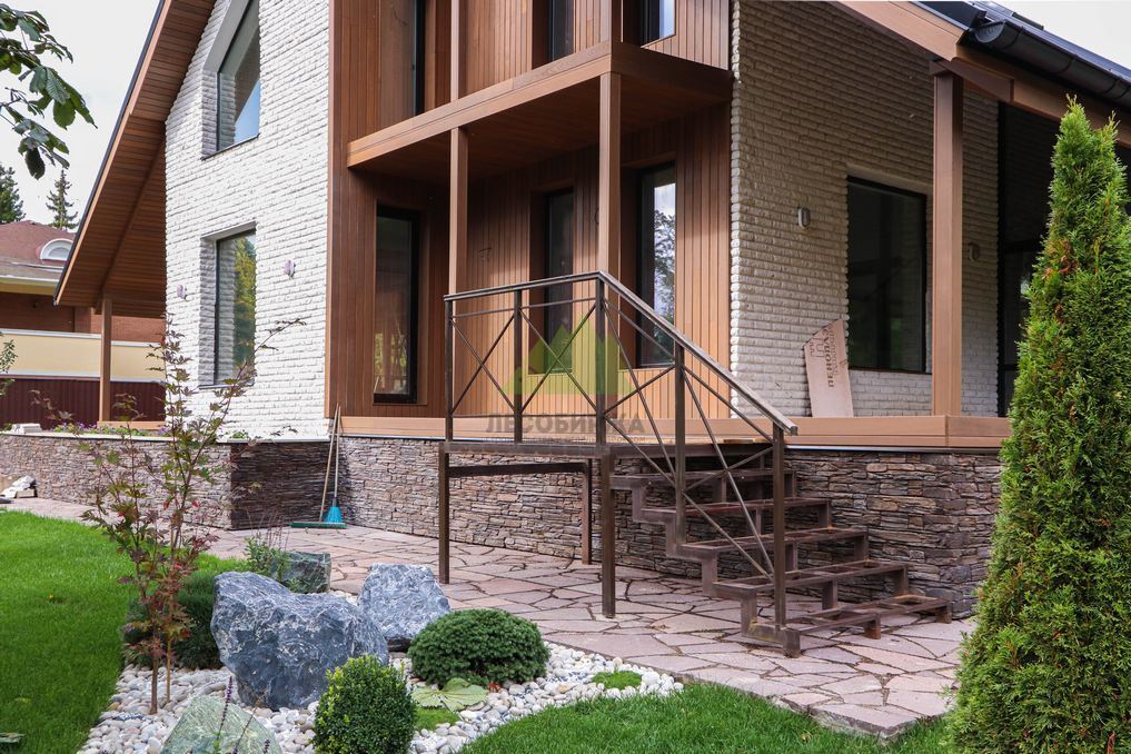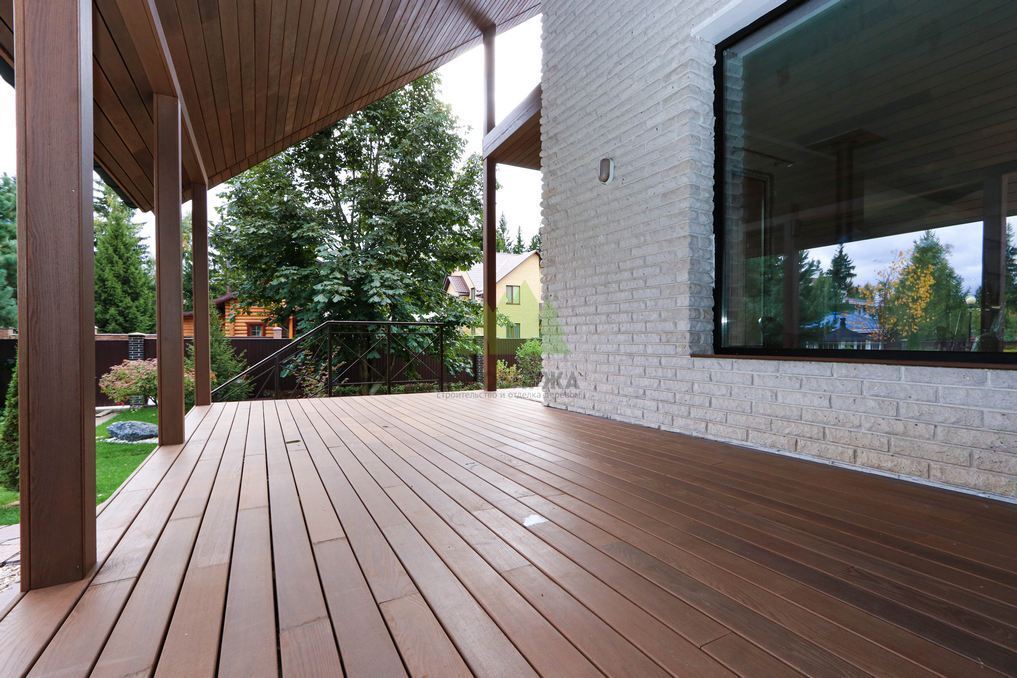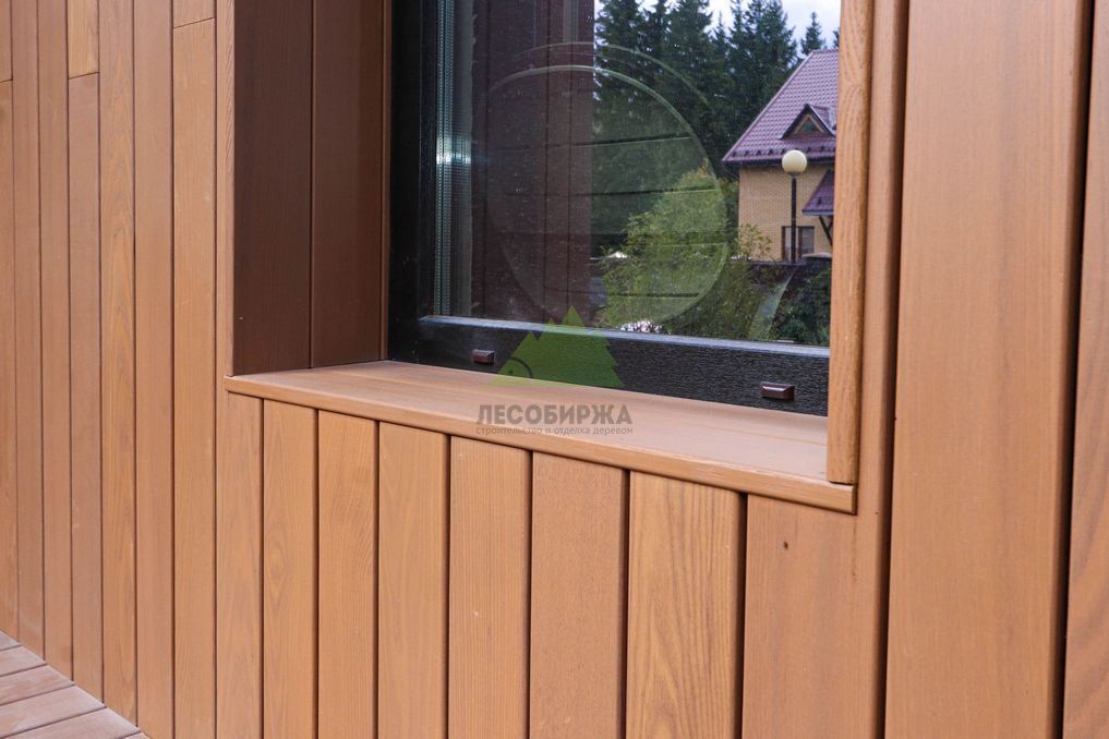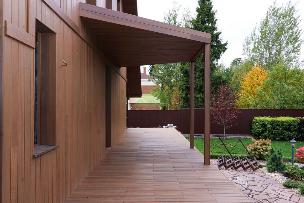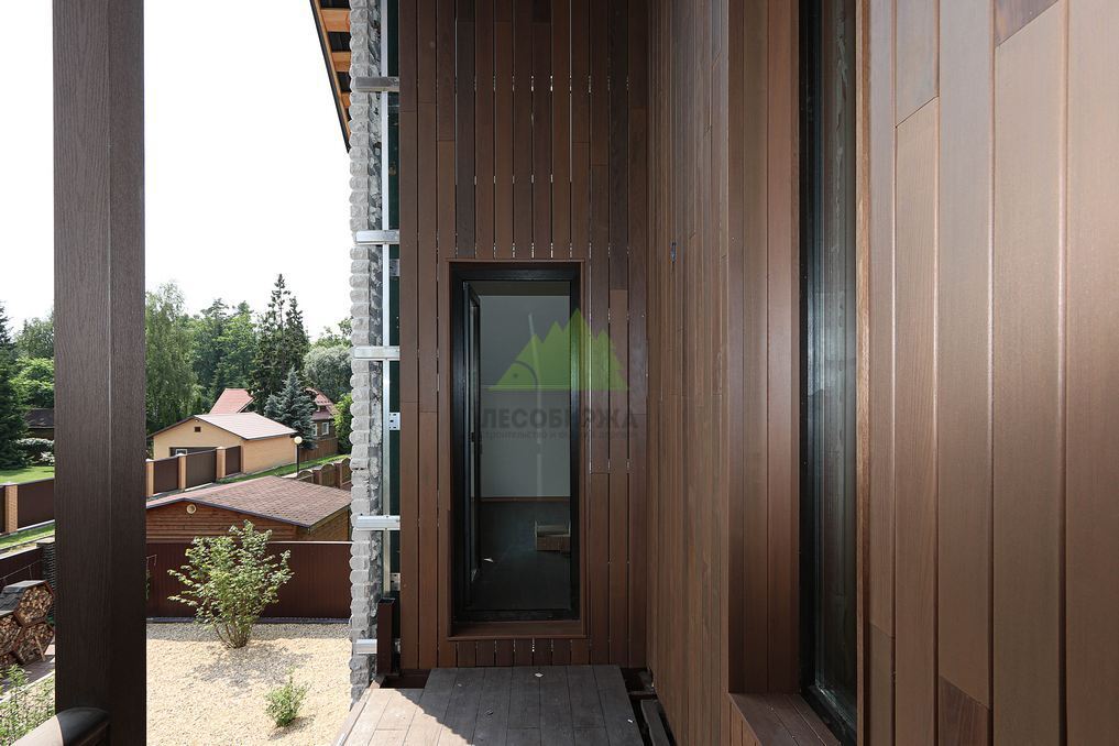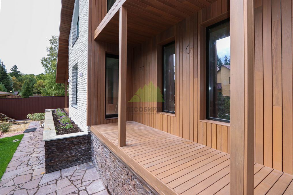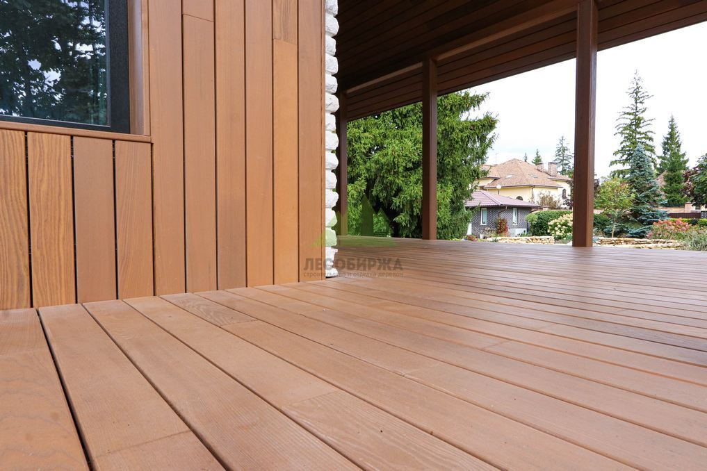 Помимо фасада, термопланкен был успешно применен для создания просторной террасы. Это решение позволило добиться единого стилистического ансамбля и визуально объединить экстерьер дома с окружающим пространством. На настиле террасы был выдержан одинаковый технологический зазор между досками, что обеспечивает не только эффективный отток дождевой воды, но и отличную вентиляцию. Это критически важно для предотвращения скопления влаги, гниения и увеличения срока службы террасного покрытия. Такой подход демонстрирует наше стремление к комплексному решению задач и вниманию к функциональности каждого элемента конструкции. Клиент остался в восторге от того, как гармонично и продуманно удалось оформить не только стены, но и зону отдыха, создав идеальное место для семейных вечеров и встреч с друзьями.