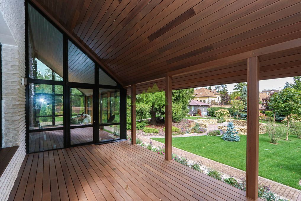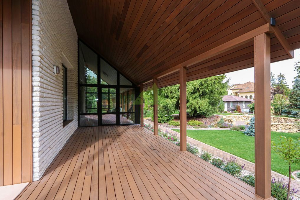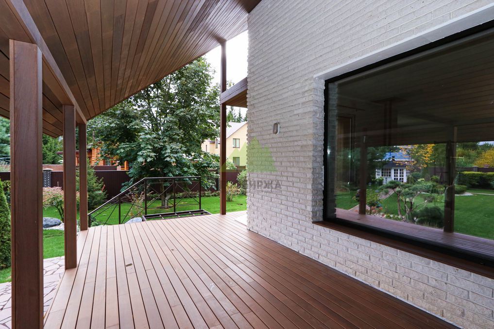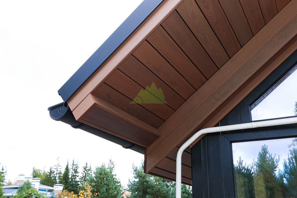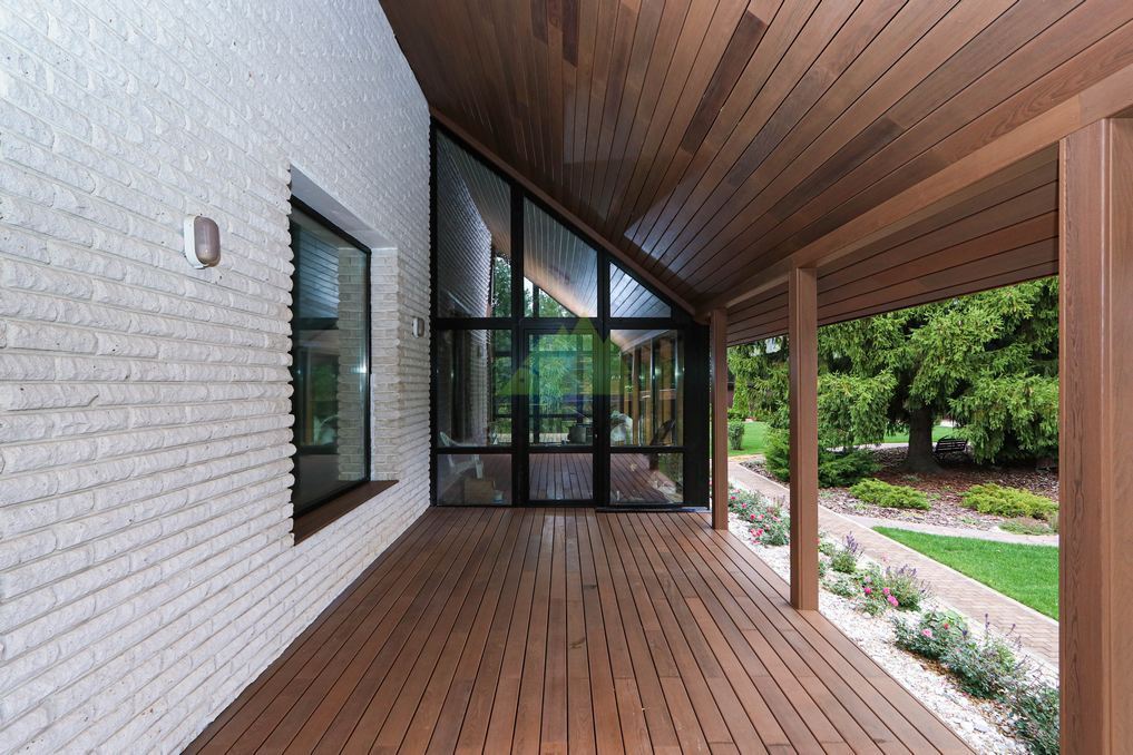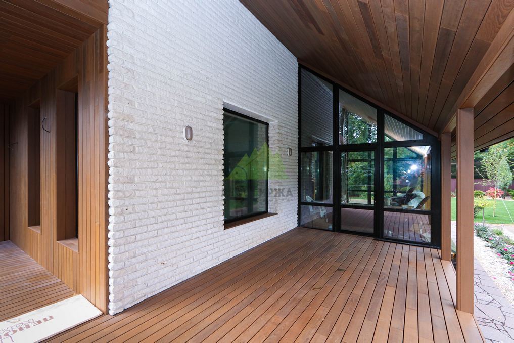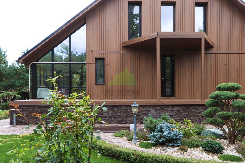 Помимо фасада, термопланкен был успешно применен для создания просторной террасы. Это решение позволило добиться единого стилистического ансамбля и визуально объединить экстерьер дома с окружающим пространством. На настиле террасы был выдержан одинаковый технологический зазор между досками, что обеспечивает не только эффективный отток дождевой воды, но и отличную вентиляцию. Это критически важно для предотвращения скопления влаги, гниения и увеличения срока службы террасного покрытия. Такой подход демонстрирует наше стремление к комплексному решению задач и вниманию к функциональности каждого элемента конструкции. Клиент остался в восторге от того, как гармонично и продуманно удалось оформить не только стены, но и зону отдыха, создав идеальное место для семейных вечеров и встреч с друзьями.