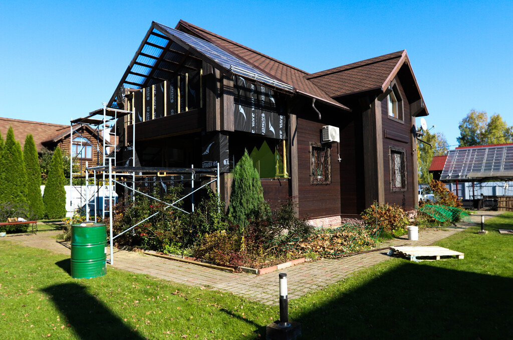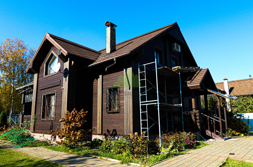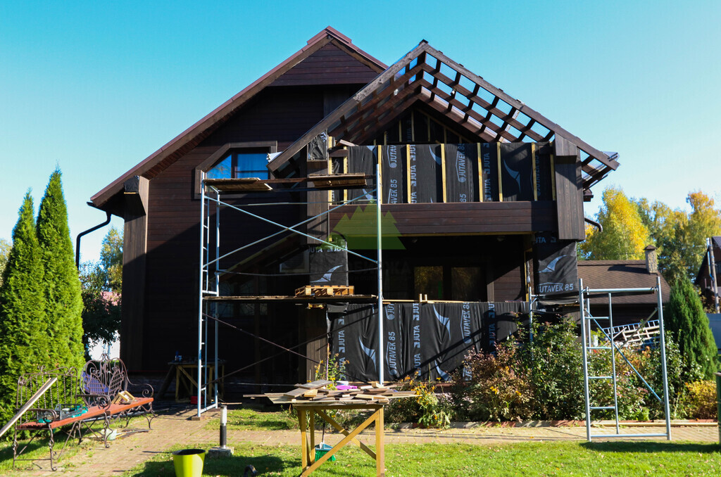 Основной задачей, поставленной перед Лесобиржей-Спб, было комплексное обновление фасада: от фундаментального утепления до финишной обшивки и декоративных элементов. Это требовало не только глубоких знаний в области строительных материалов и технологий, но и внимательного подхода к эстетике, а также понимания долгосрочных перспектив эксплуатации дома. Клиент выбрал для обшивки фасада скошенный планкен из лиственницы сорта АВ, который необходимо было окрасить гидромаслом Renner А300 в выразительный цвет Тм 1830 на нашей производственной базе. Кроме того, требовалось выполнить перекрестное утепление дома с последующей установкой гидро-ветрозащитной мембраны Ютавек 85, что является критически важным этапом для домов, эксплуатируемых в условиях повышенной влажности и ветровых нагрузок Ленинградской области. Отделка угловых, дверных и оконных проемов предполагалась тем же гидромаслом Renner А300, но уже в контрастном цвете Tv 5088, чтобы придать фасаду завершенный и гармоничный вид.