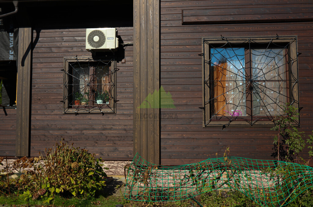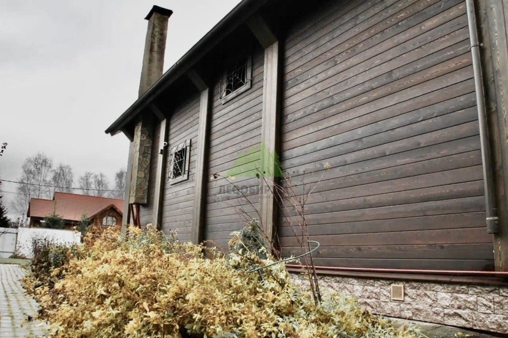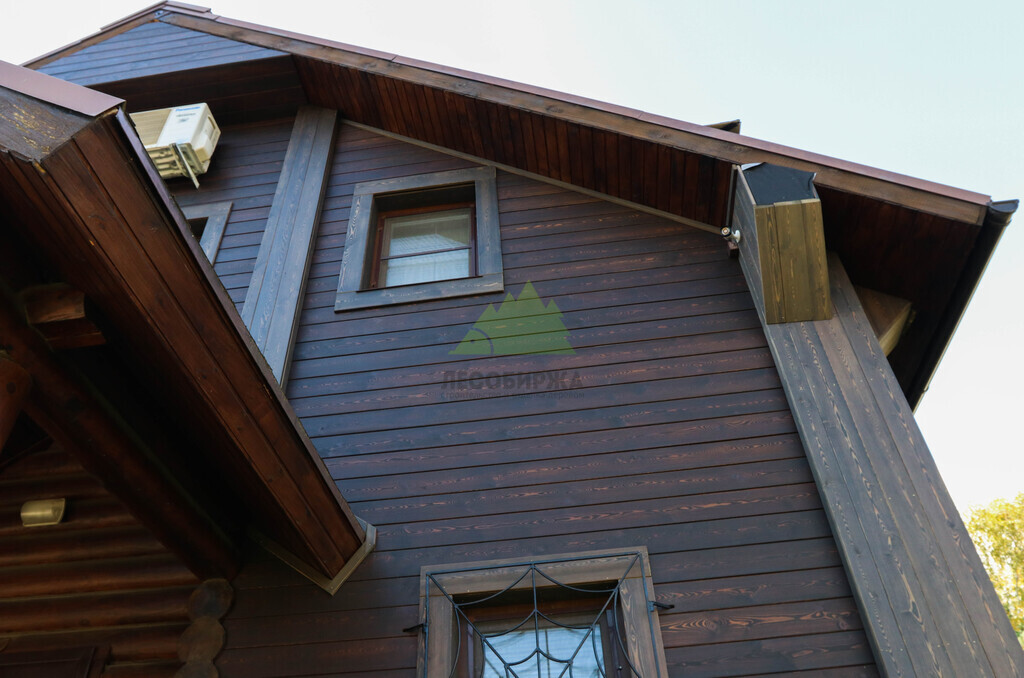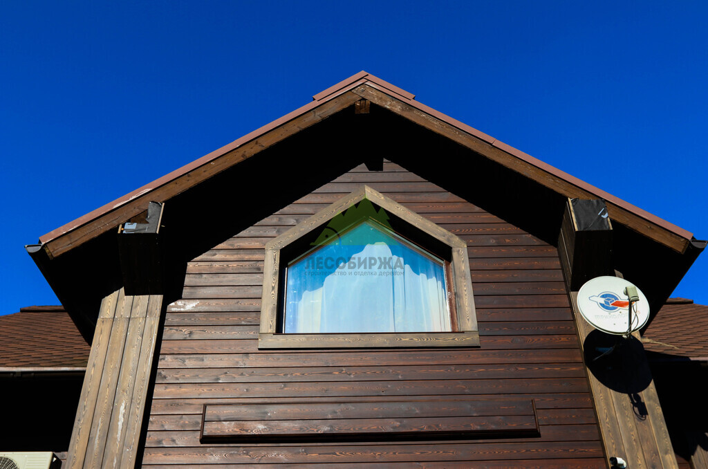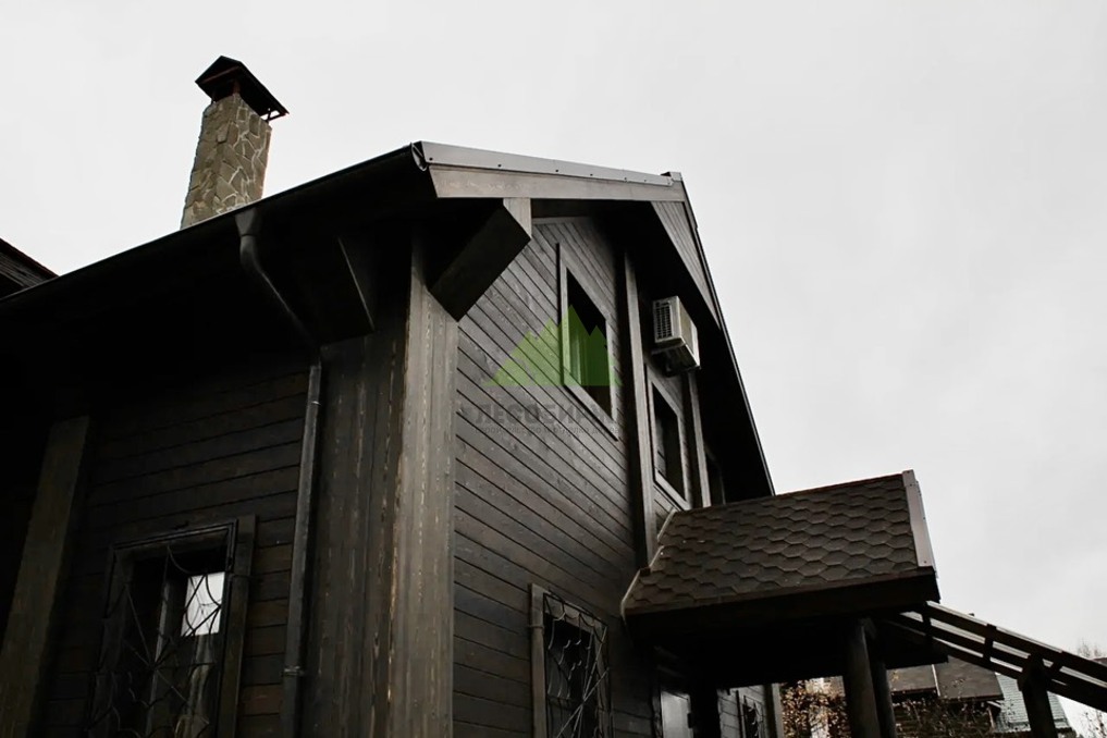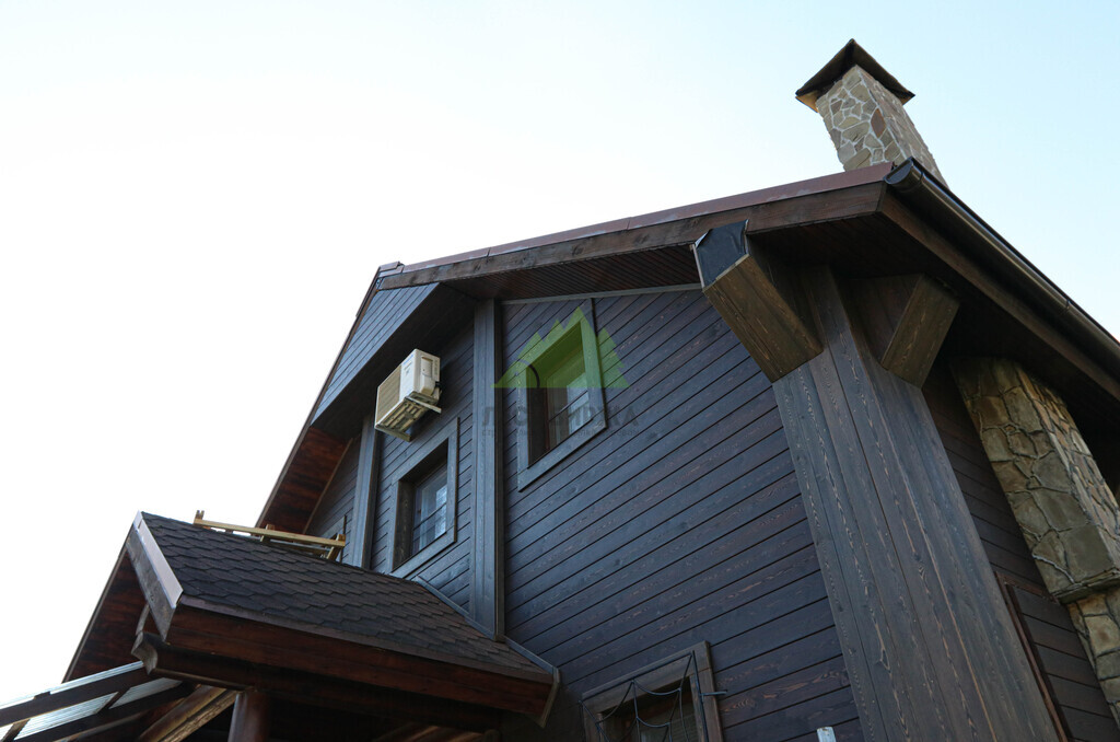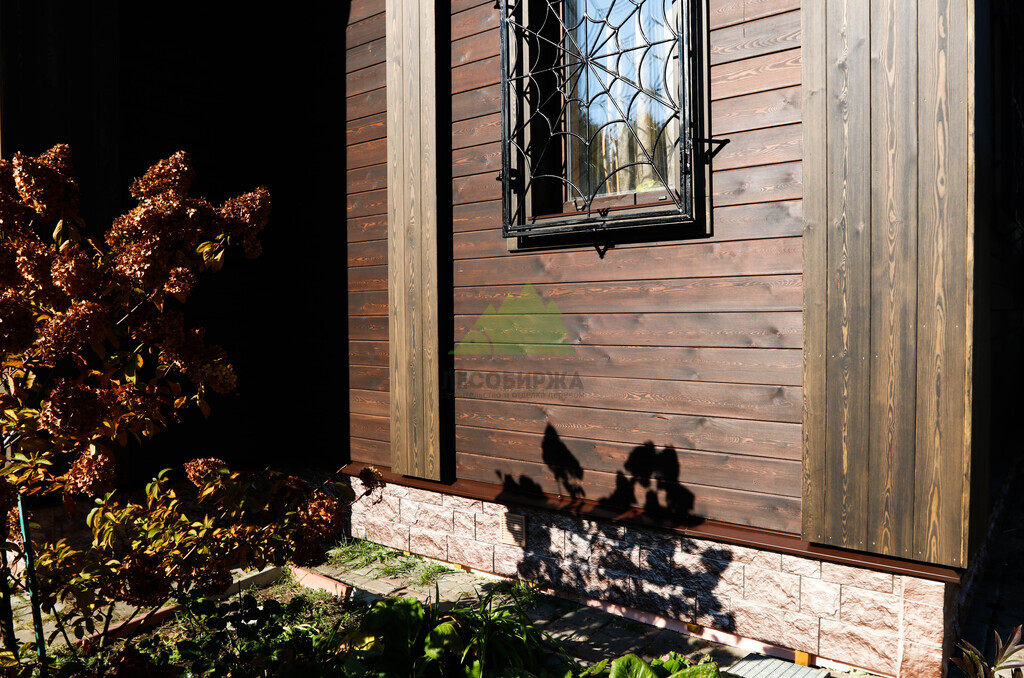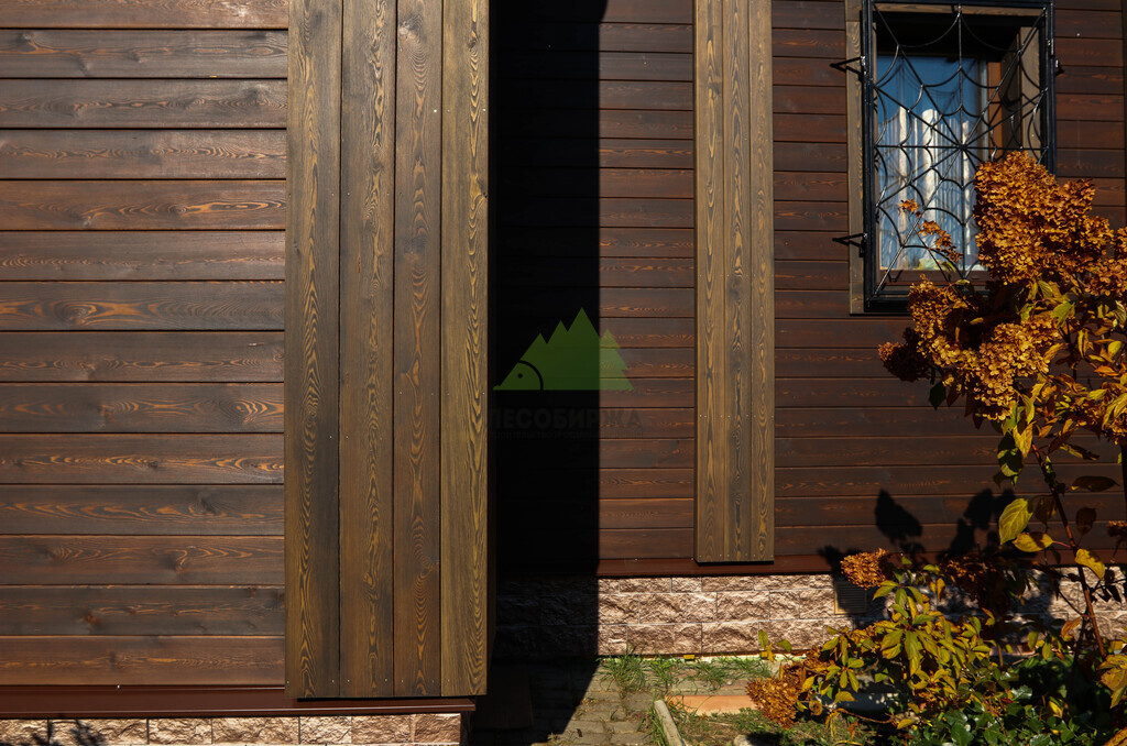 Для чистовой обшивки фасада был выбран скошенный планкен из сибирской лиственницы сорта АВ. Выбор лиственницы не случаен: это древесина, известная своей исключительной прочностью, устойчивостью к гниению, влаге и вредителям. Эти качества делают ее идеальным материалом для наружной отделки в нашем климате, где деревянные конструкции подвергаются серьезным испытаниям. Скошенный профиль планкена позволяет монтировать его внахлест, создавая эффектный, объемный фасад с четкими линиями и глубокими тенями, что придает дому современный и динамичный вид. Кроме того, такая конструкция способствует более эффективному стоку воды, что дополнительно защищает стены от осадков.