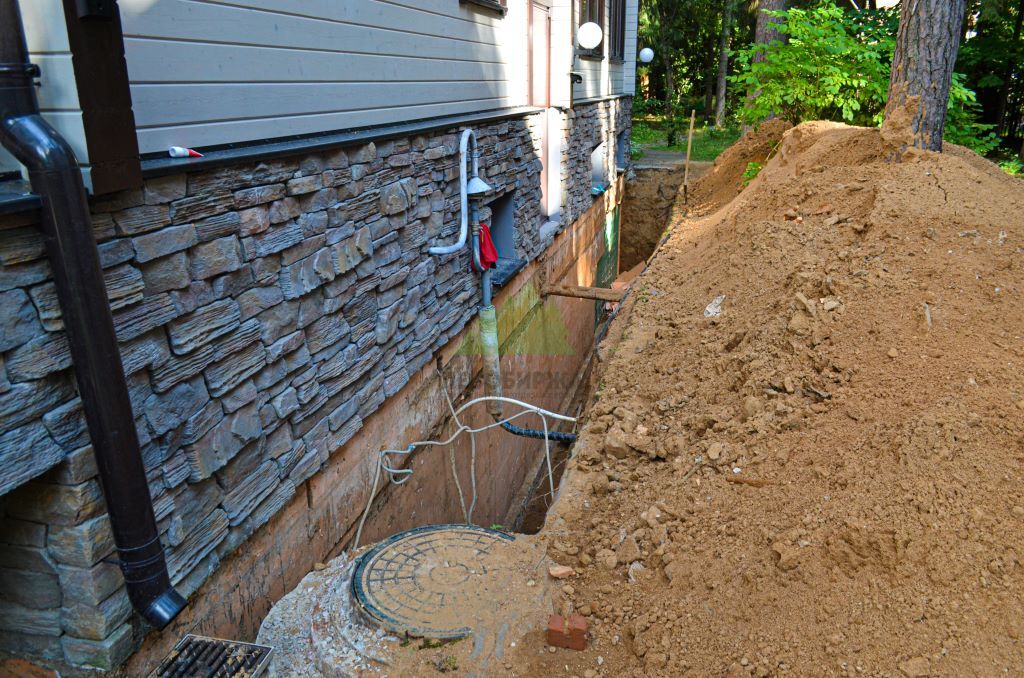 Снять отмостку вокруг дома, с сохранением плитки, Откопать цокольный этаж, сделать нижний дренаж фундамента, гидроизолировать цокольный этаж снаружи, утеплить цокольный этаж снаружи 100 мм., забетонировать отмостку вокруг дома, установить дождеприемники, уложить плитку. Основные характеристики объекта: