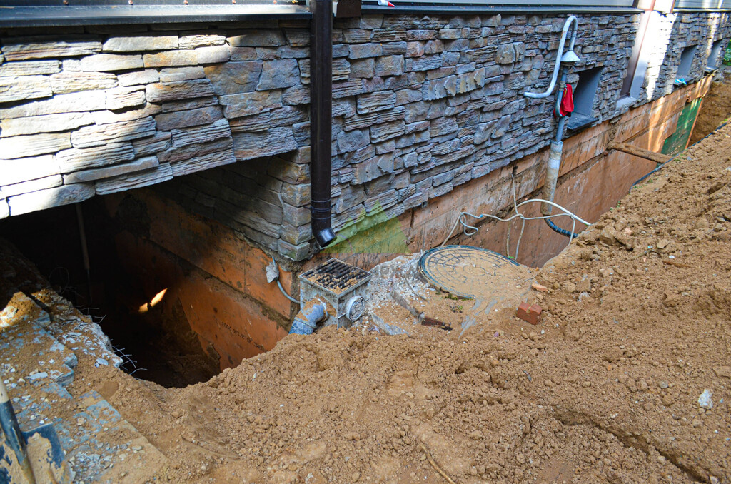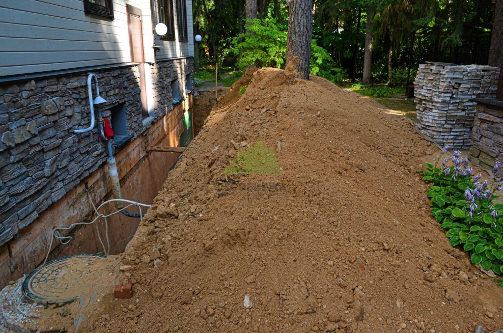 1. Аккуратный демонтаж старой отмостки и земляные работы. Первым делом наши специалисты приступили к демонтажу существующей отмостки. Важно было не просто убрать старое покрытие, но и бережно сохранить декоративную плитку, которую клиент планировал использовать повторно. Этот этап требовал предельной аккуратности и опыта, чтобы избежать повреждений. После демонтажа отмостки мы тщательно откопали цокольный этаж по всему периметру дома. Глубина выемки грунта рассчитывалась исходя из необходимости создания полноценной дренажной системы и обеспечения доступа для нанесения гидроизоляционных и теплоизоляционных материалов. Весь извлеченный грунт был временно складирован таким образом, чтобы не мешать дальнейшим работам и быть готовым к обратному засыпанию.
