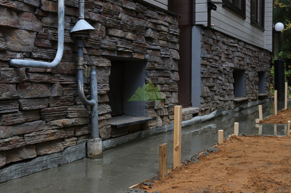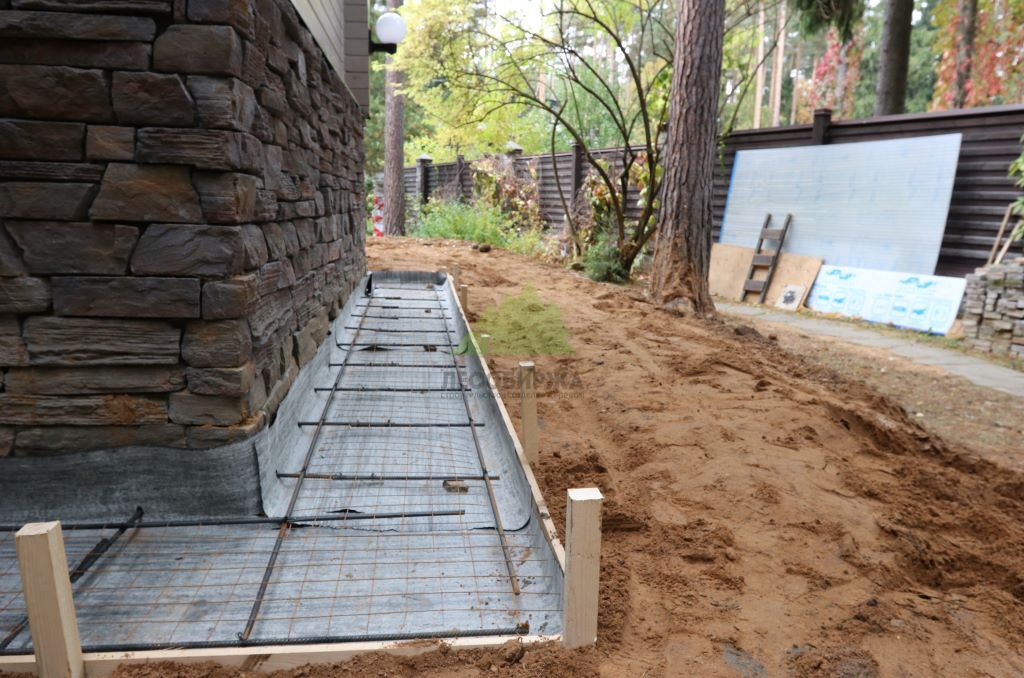 5. Заливка новой отмостки и монтаж дождеприемников. После завершения работ по гидроизоляции и утеплению, а также обратной засыпки грунта с послойным трамбованием, мы приступили к формированию новой отмостки. Была подготовлена песчано-щебеночная подушка, на которую уложили гидроизоляционный материал, а затем смонтировали опалубку. Для придания конструкции максимальной прочности и долговечности, а также предотвращения образования трещин, отмостка была армирована металлической сеткой. Бетон для заливки готовился с соблюдением всех технологических требований: контроль водоцементного соотношения, тщательное перемешивание и своевременная вибрация для удаления воздушных пузырей. Наши мастера особенно внимательно следили за ровностью и гладкостью поверхности, ведь это залог правильного отвода воды. Одновременно с заливкой отмостки были установлены дождеприемники, интегрированные в ливневую канализацию, что исключает скопление воды у фундамента.