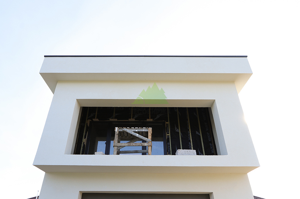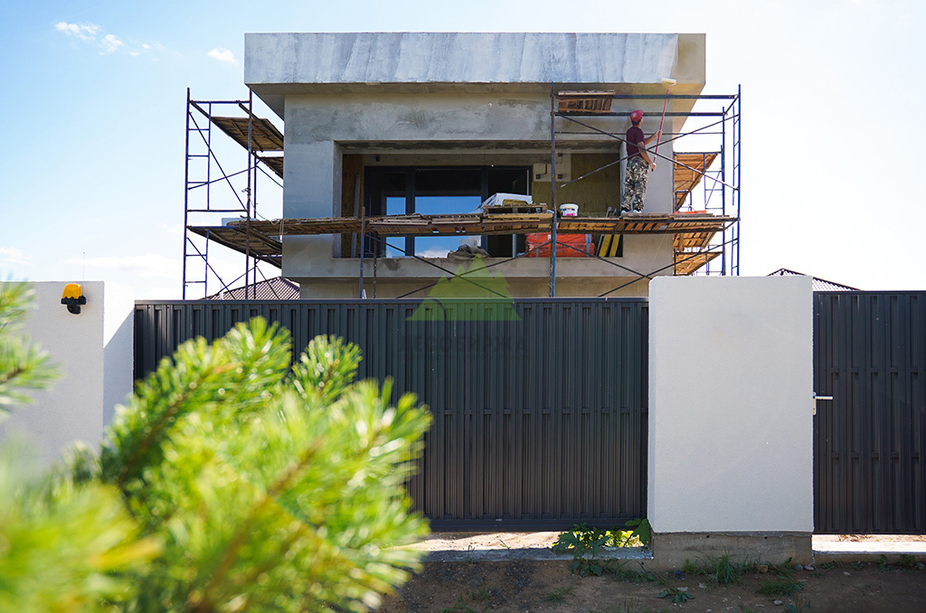 Далее, поверх армирующей сетки, последовательно наносились выравнивающий и финишный слои штукатурки. Цвет финишного покрытия был заранее тщательно подобран в соответствии с дизайн-проектом, что позволило избежать необходимости последующей окраски и обеспечило равномерность тона и текстуры по всей площади фасада. Благодаря этой технологии, вся застройка участка – дом, баня и гараж – мгновенно обрела стильный и респектабельный вид, соответствующий высоким стандартам "хай-тек".