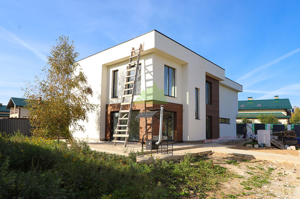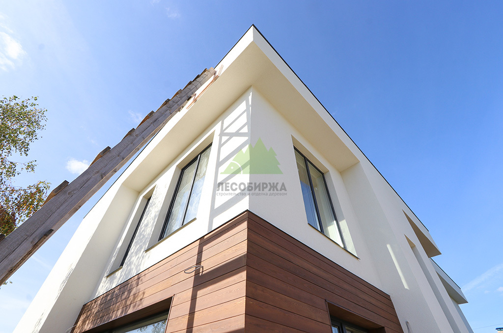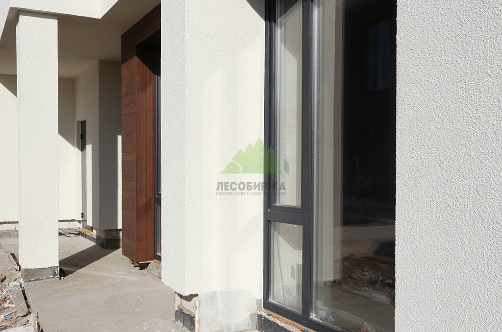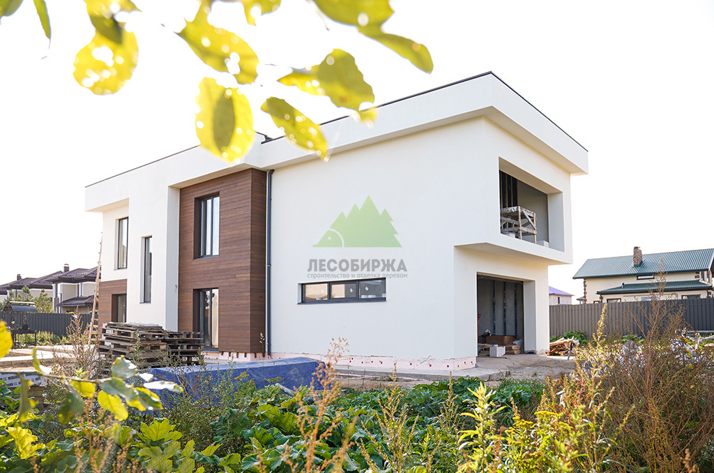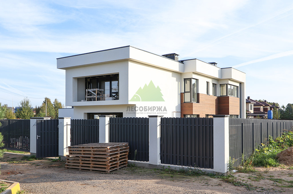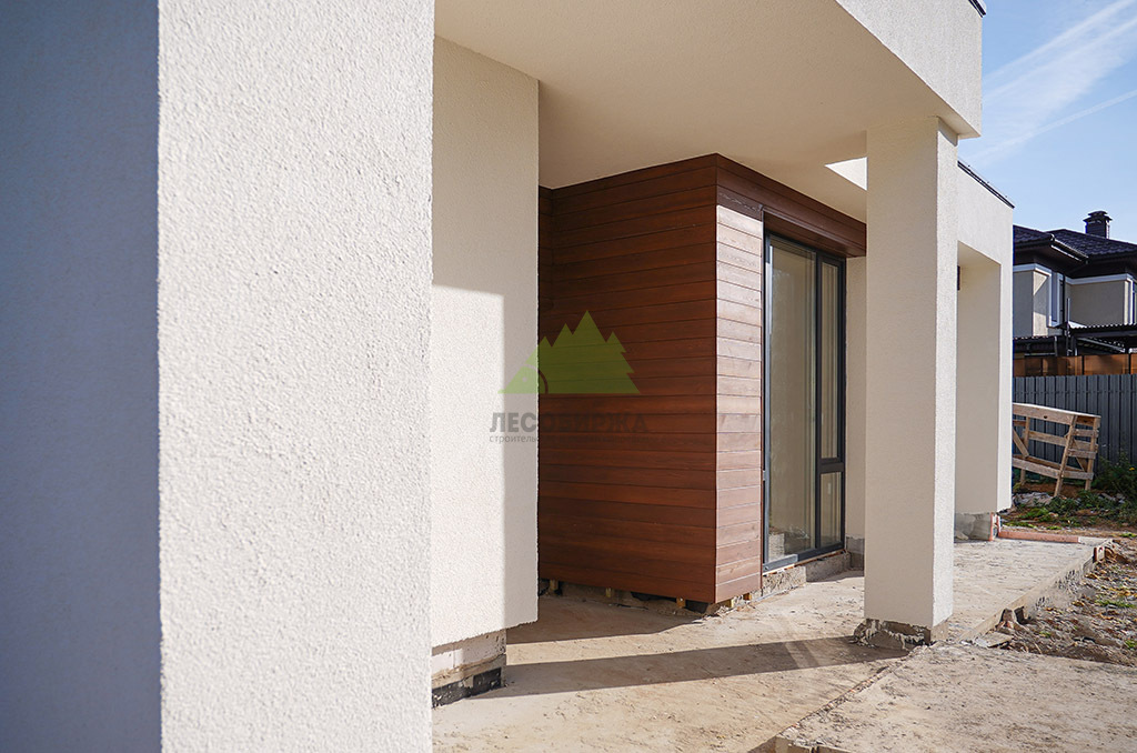 В живописном уголке коттеджного поселка Лес и Пляж в Ленинградской области, перед нашей компанией "Лесобиржа-Спб" была поставлена увлекательная задача по преображению современного дома из газобетона. Владелец усадьбы стремился к созданию уникального и функционального экстерьера, выполненного в современном стиле "хай-тек", который бы гармонично сочетался с окружающей природой и при этом демонстрировал передовые технологии в строительстве. Основной акцент делался на утепленный комбинированный фасад, где штукатурка и натуральное дерево должны были создать выразительный и долговечный облик.