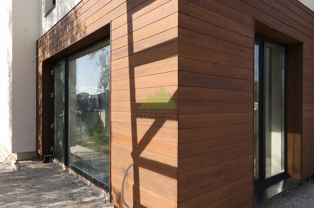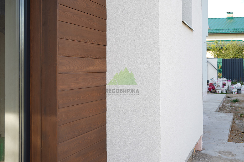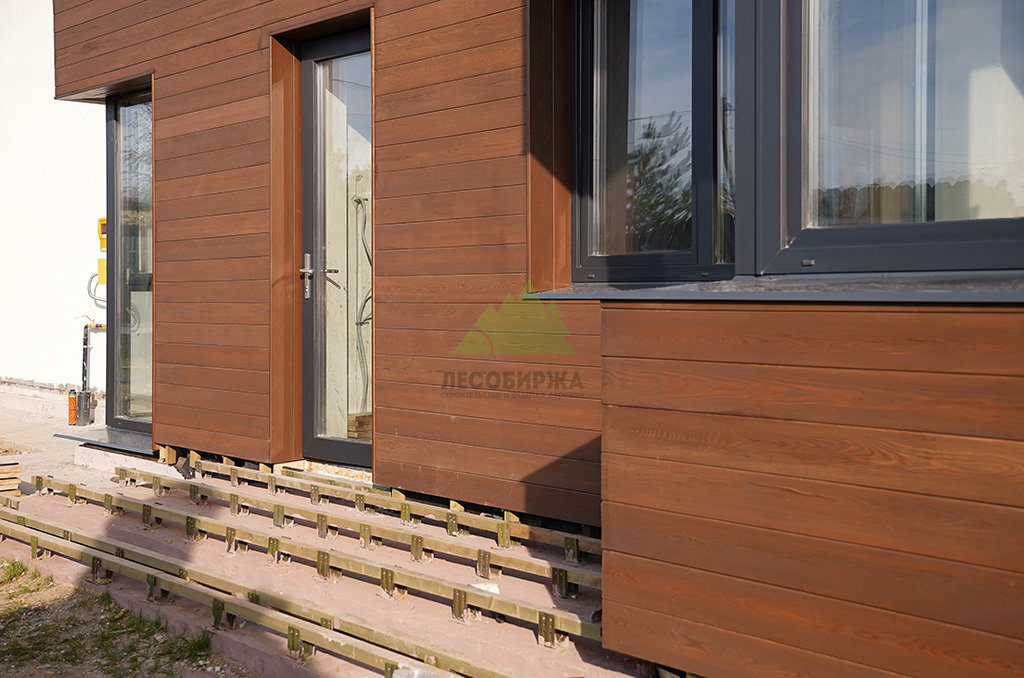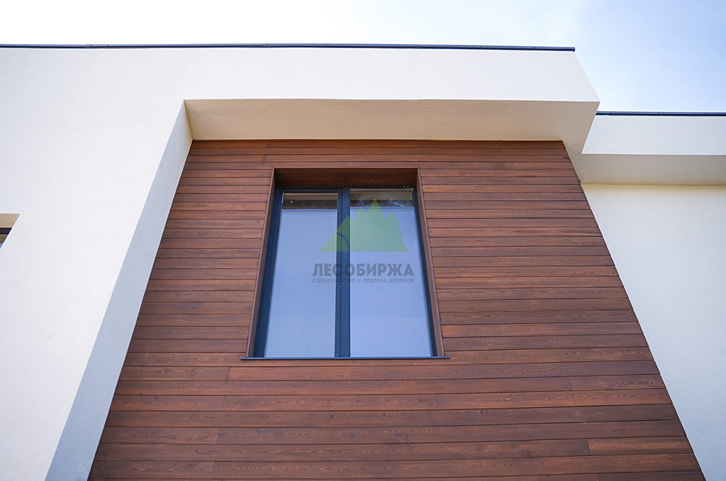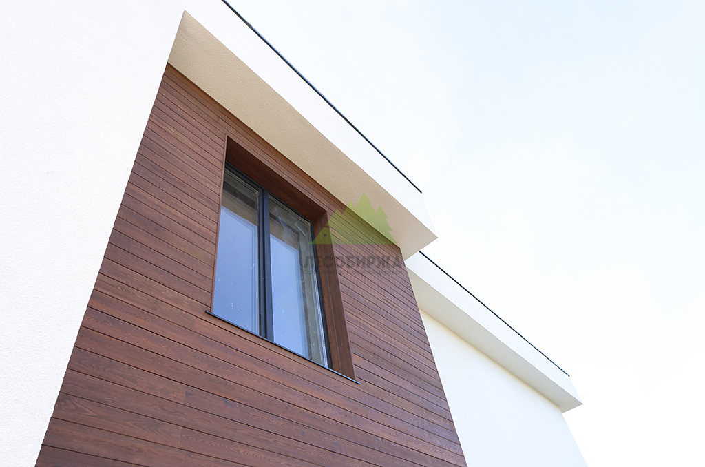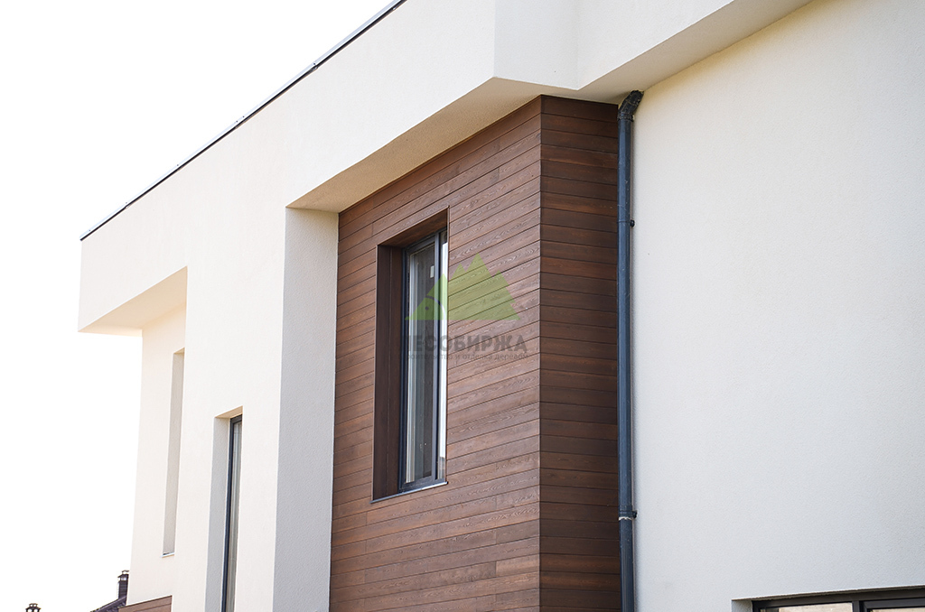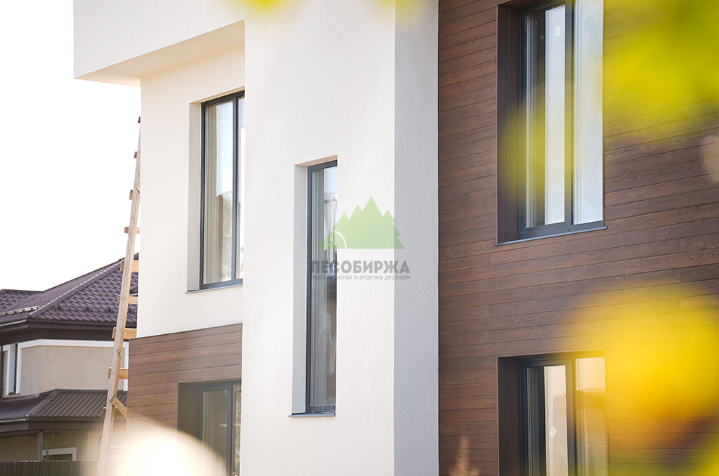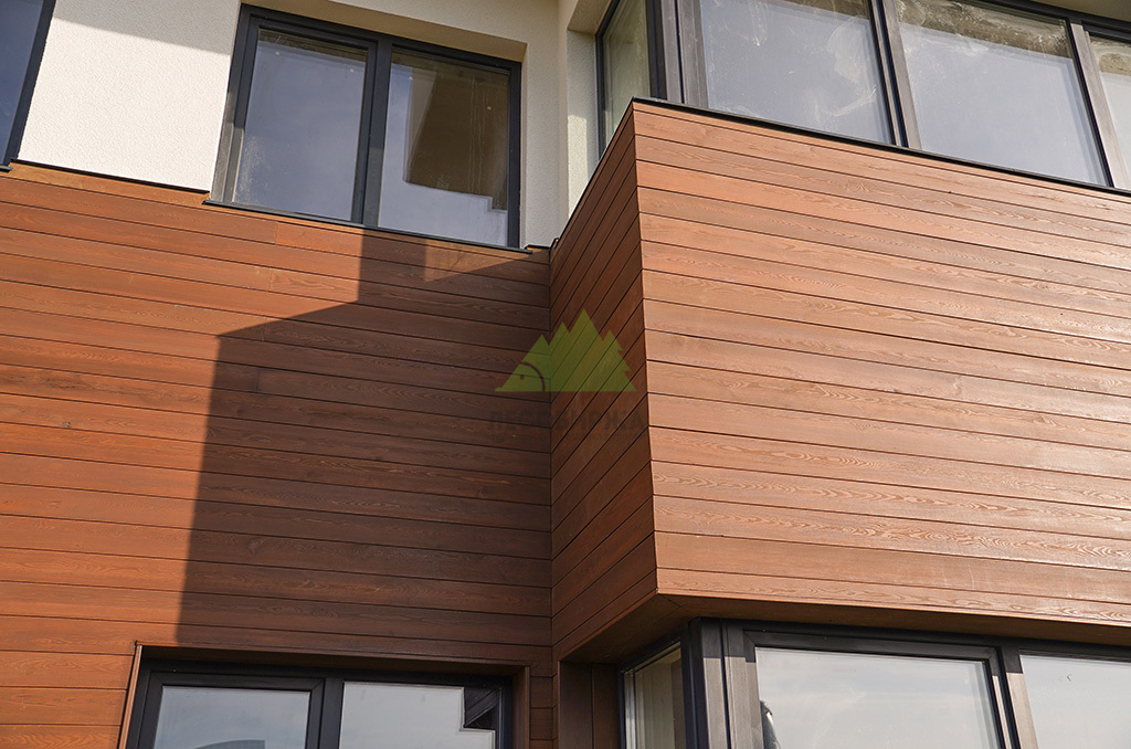 Особую роль в создании комбинированного фасада играют деревянные вставки из термопланкена лиственницы. Для этих элементов была выбрана сибирская лиственница – порода, известная своей исключительной прочностью, устойчивостью к влаге и гниению, что делает ее идеальным выбором для использования в условиях переменчивого климата Санкт-Петербурга и Ленинградской области. Термическая обработка (термопланкен) дополнительно повышает стабильность и долговечность древесины, предотвращая ее деформацию.