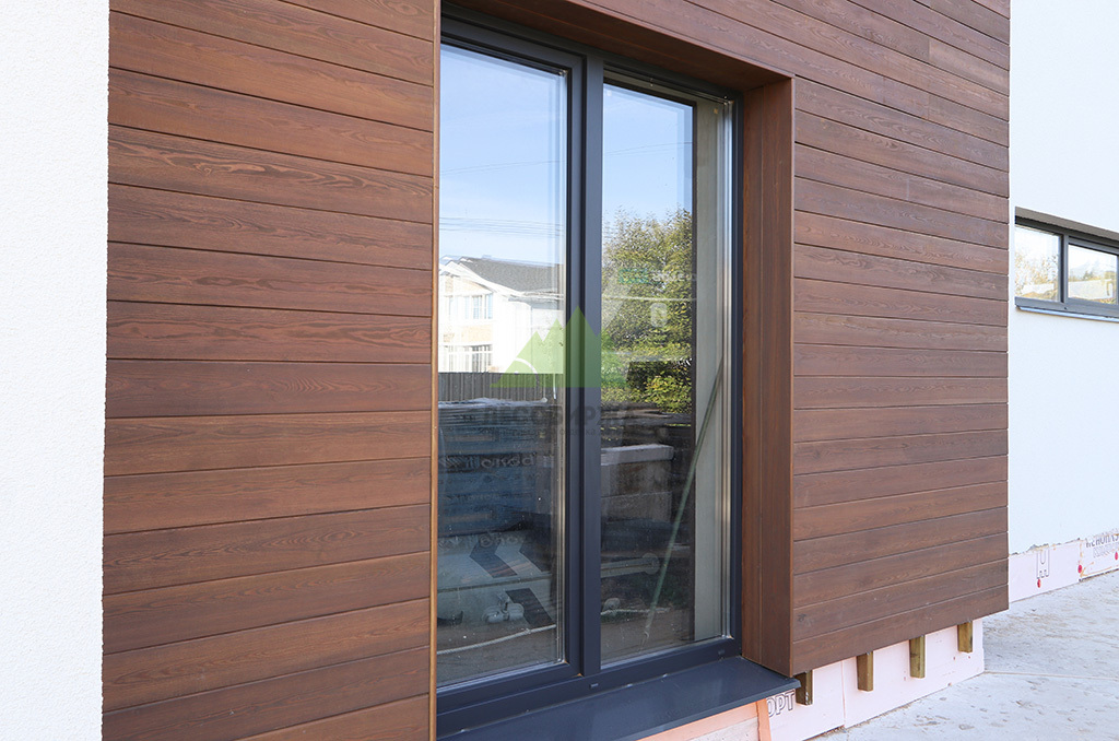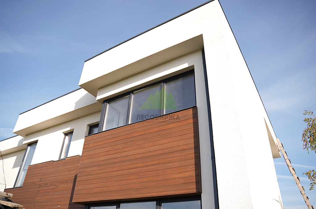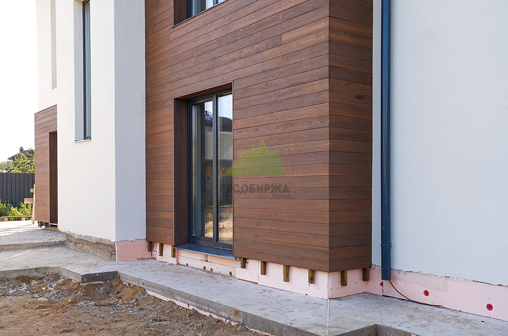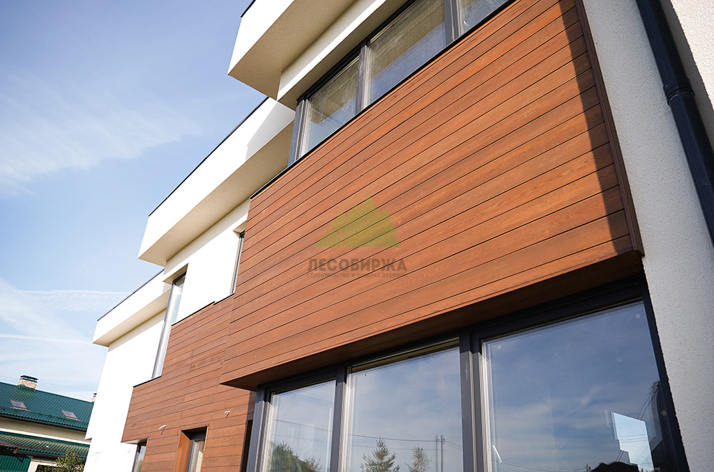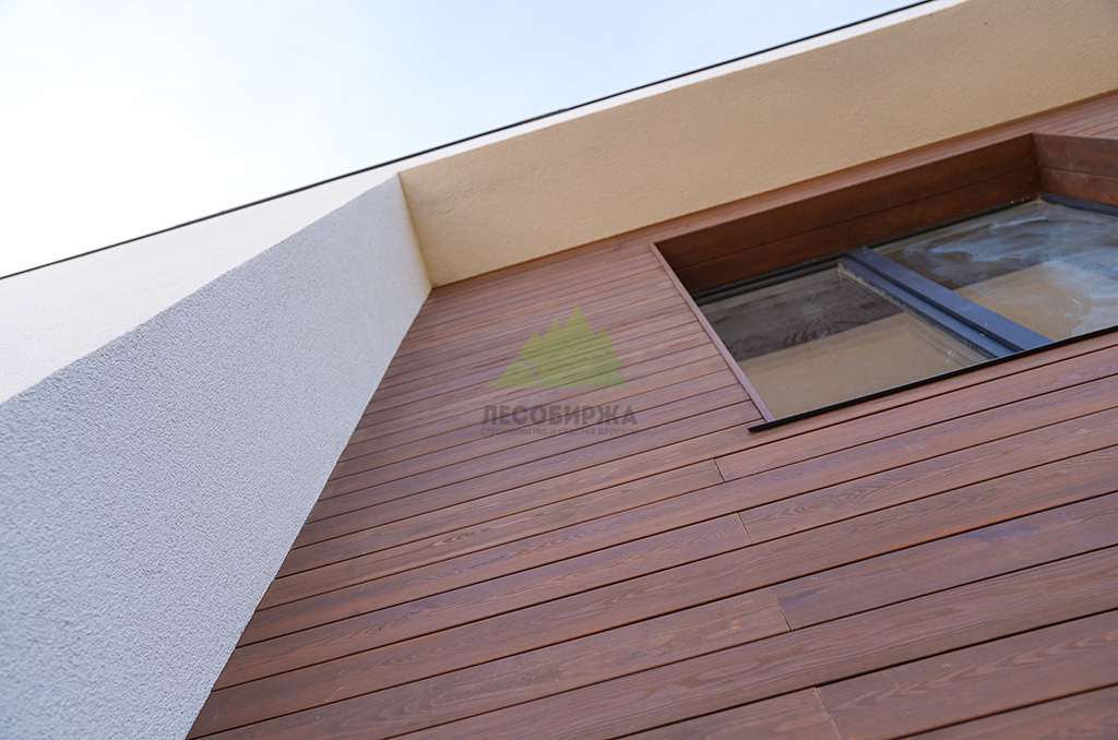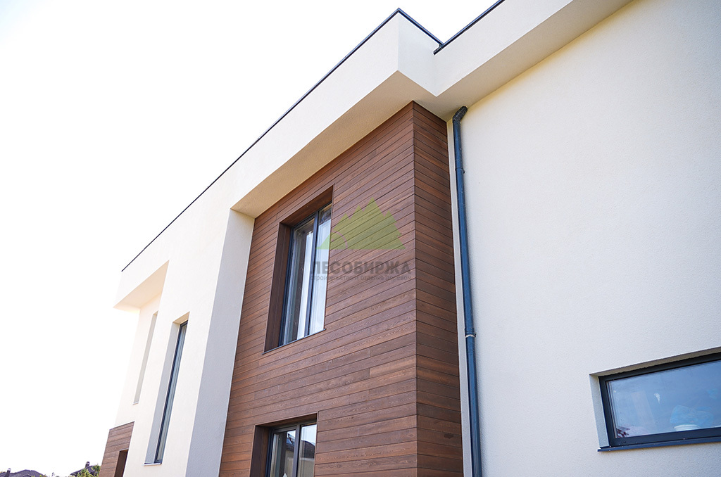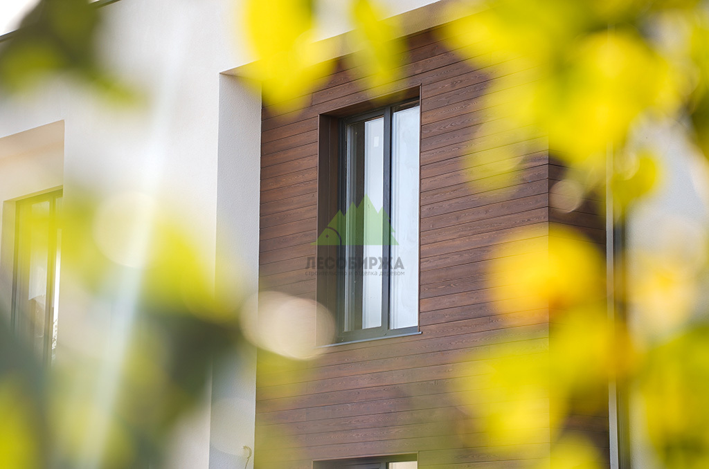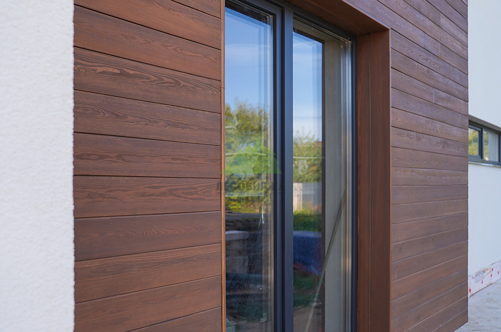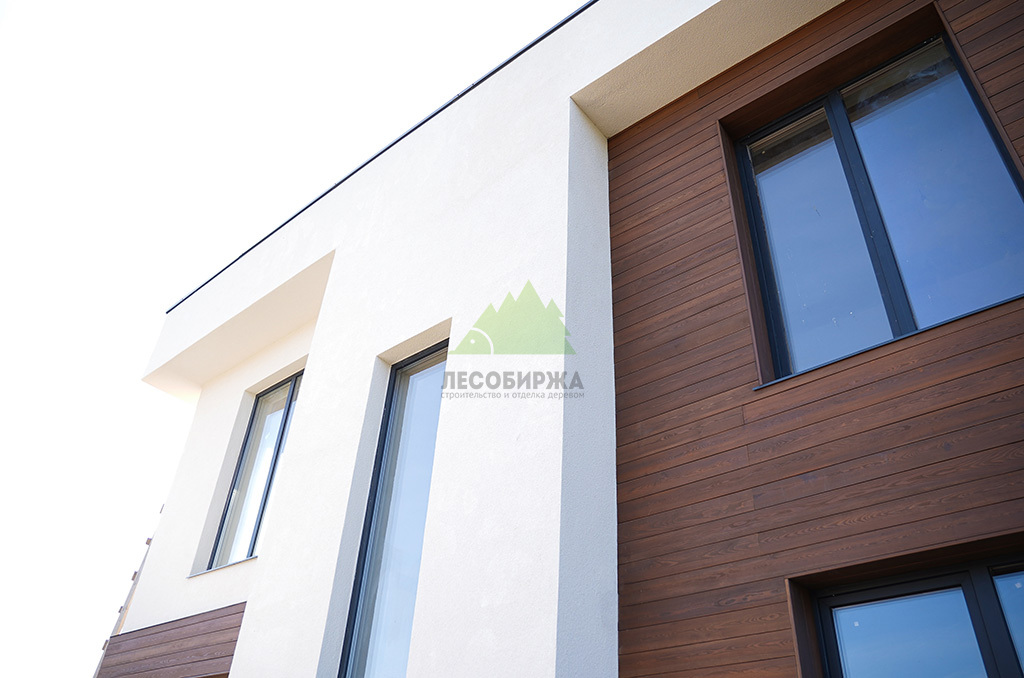 Особую роль в создании комбинированного фасада играют деревянные вставки из термопланкена лиственницы. Для этих элементов была выбрана сибирская лиственница – порода, известная своей исключительной прочностью, устойчивостью к влаге и гниению, что делает ее идеальным выбором для использования в условиях переменчивого климата Санкт-Петербурга и Ленинградской области. Термическая обработка (термопланкен) дополнительно повышает стабильность и долговечность древесины, предотвращая ее деформацию.