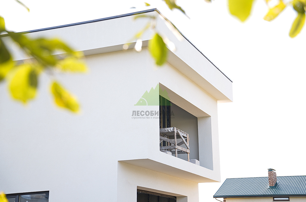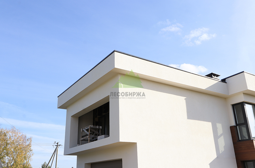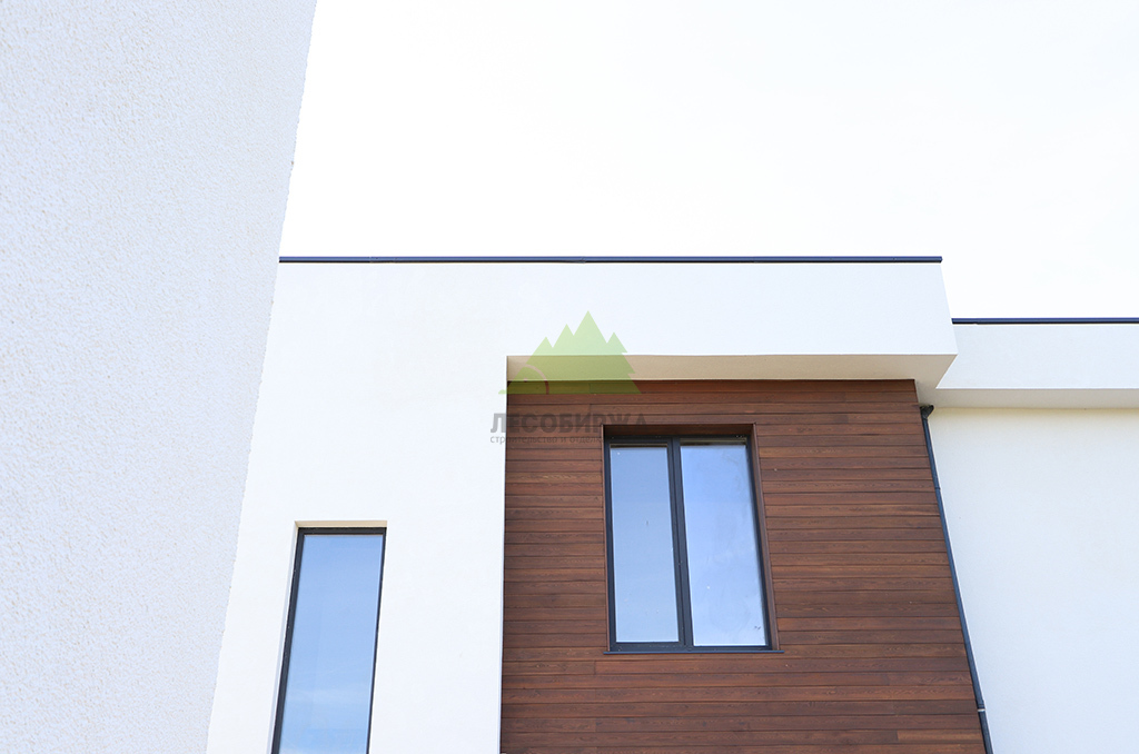 Отдельного внимания заслуживает преображение бани, которая была выполнена в едином стиле с основным домом. Фасад бани также получил комбинированную отделку с использованием штукатурки и термопланкена из лиственницы, окрашенного в тот же цвет, что и на доме. Это создало единый архитектурный ансамбль, подчеркивающий целостность и продуманность дизайн-проекта. Внутренняя отделка бани также была продумана до мелочей, обеспечивая функциональность и эстетику, присущие высококлассному объекту. На эксплуатируемых плоских кровлях, парапетные крышки, тоже ставят – это обеспечивает дополнительную защиту и завершенный вид.