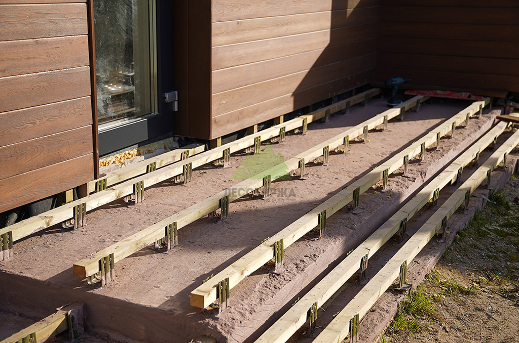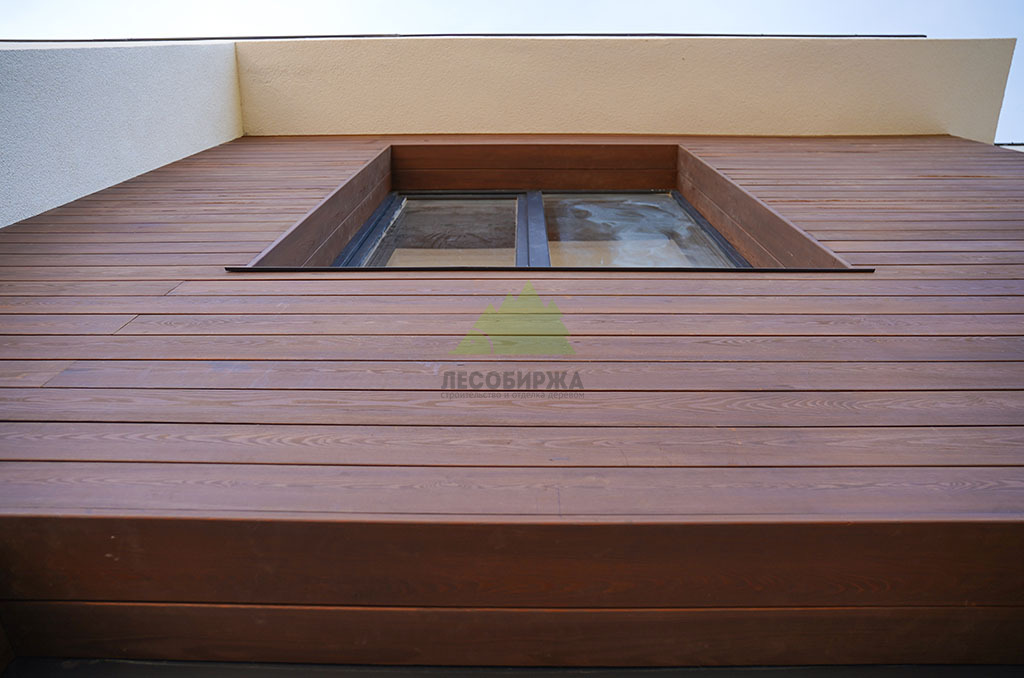 На террасе была уложена палубная доска из лиственницы. Этот материал выбран не случайно: лиственница отличается высокой стойкостью к влаге, перепадам температур и механическим нагрузкам, что делает ее идеальным решением для открытых пространств в условиях Северо-Запада. Палубная доска не только обеспечивает долговечное и безопасное покрытие, но и придает террасе благородный и уютный вид, приглашая к отдыху и наслаждению природой. Каждая доска была уложена с соблюдением всех технологических требований, обеспечивая ровную поверхность и надежное крепление.