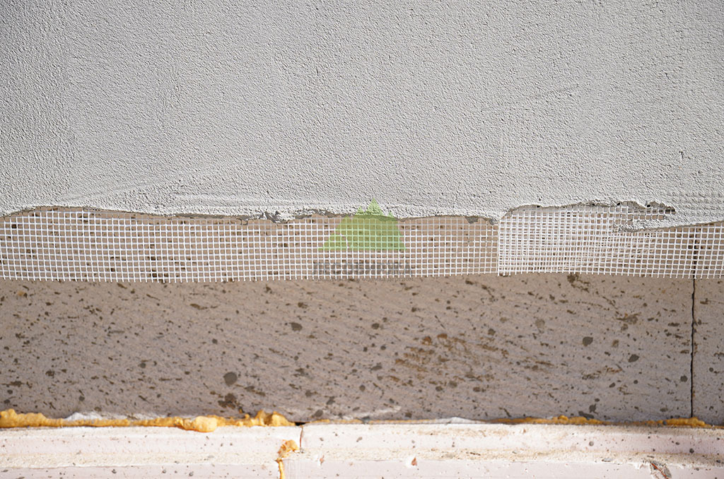 После полного высыхания клеевого и дюбельного крепления утеплителя, на минеральную вату был нанесен первый тонкий слой штукатурной смеси Ceresit 85. В этот свежий слой была аккуратно "утоплена" высокопрочная пластиковая армирующая сетка. Соседние полотна сетки монтировались с обязательным нахлестом в 10 см, что исключает появление трещин и придает фасаду дополнительную прочность. Особое внимание уделялось обработке внешних и внутренних углов дома, бани и гаража: сетка укладывалась таким образом, чтобы охватывать все стороны угла без стыков, создавая цельное и прочное армирование, что является ключевым для долговечности штукатурного покрытия.