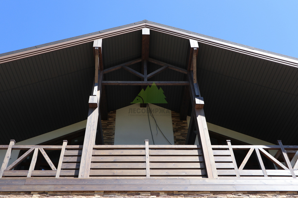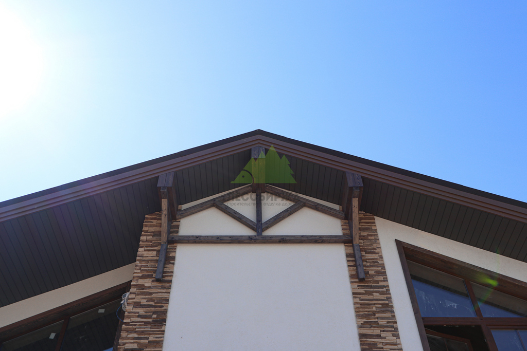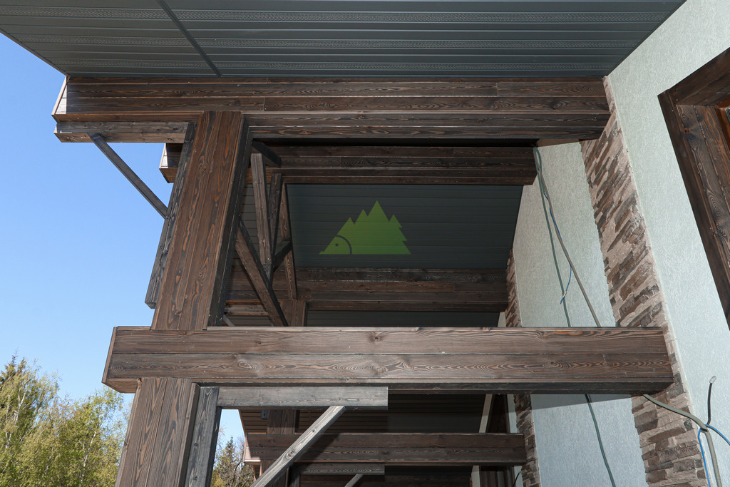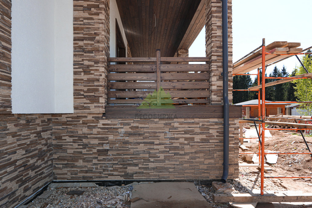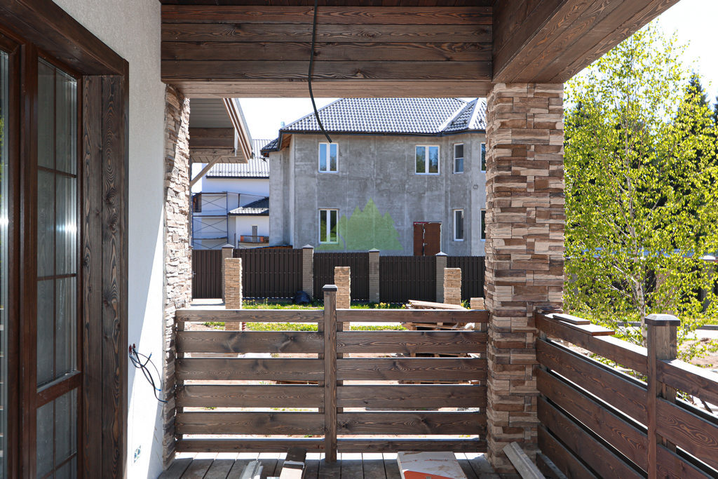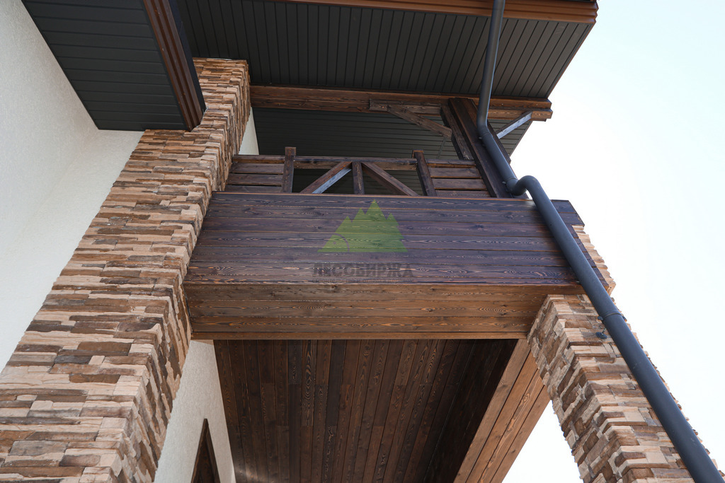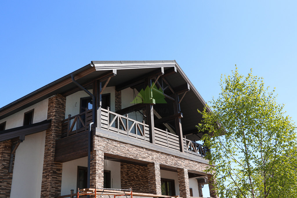 Перед нами стояла задача не просто выполнить отделочные работы, а создать целостный и долговечный архитектурный ансамбль. Клиент ясно обозначил свои пожелания: на первом этаже необходимо было обустроить пол из высококачественной лиственницы, смонтировать элегантные декоративные ограждения, обшить потолок, ригели, откосы и наличники планкеном. Балкон второго этажа требовал обшивки вертикальными балками, а также оформления декоративными элементами, откосами и наличниками в едином стиле. Особое внимание уделялось сочетанию натуральных материалов – дерева и уже имеющейся каменной отделки, чтобы достичь истинной атмосферы Шале.