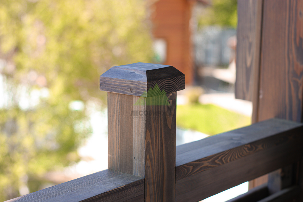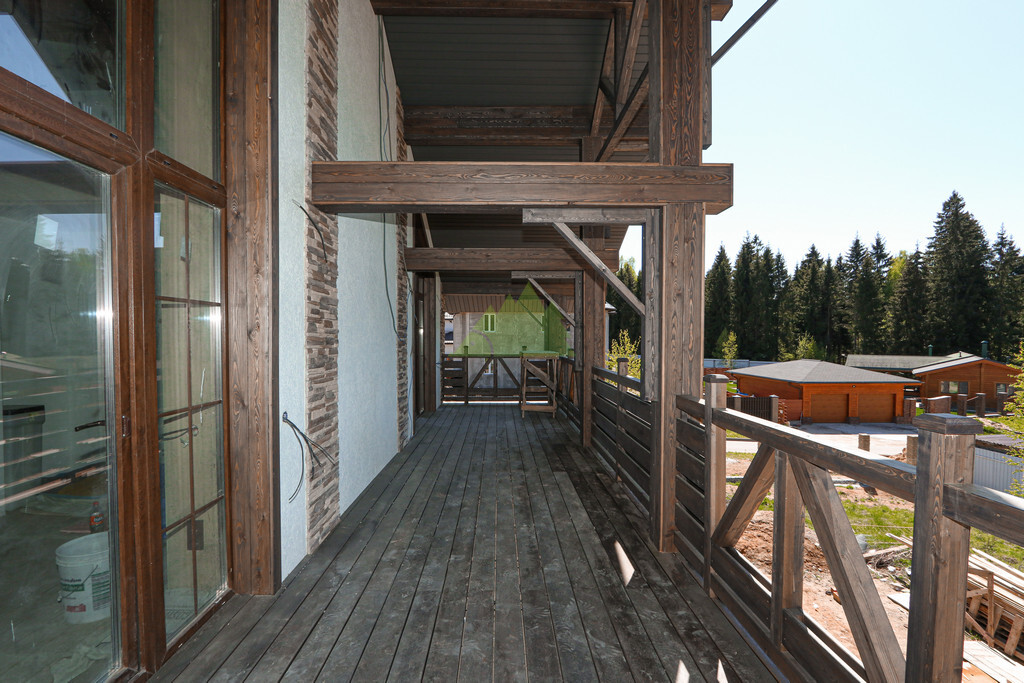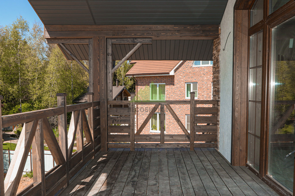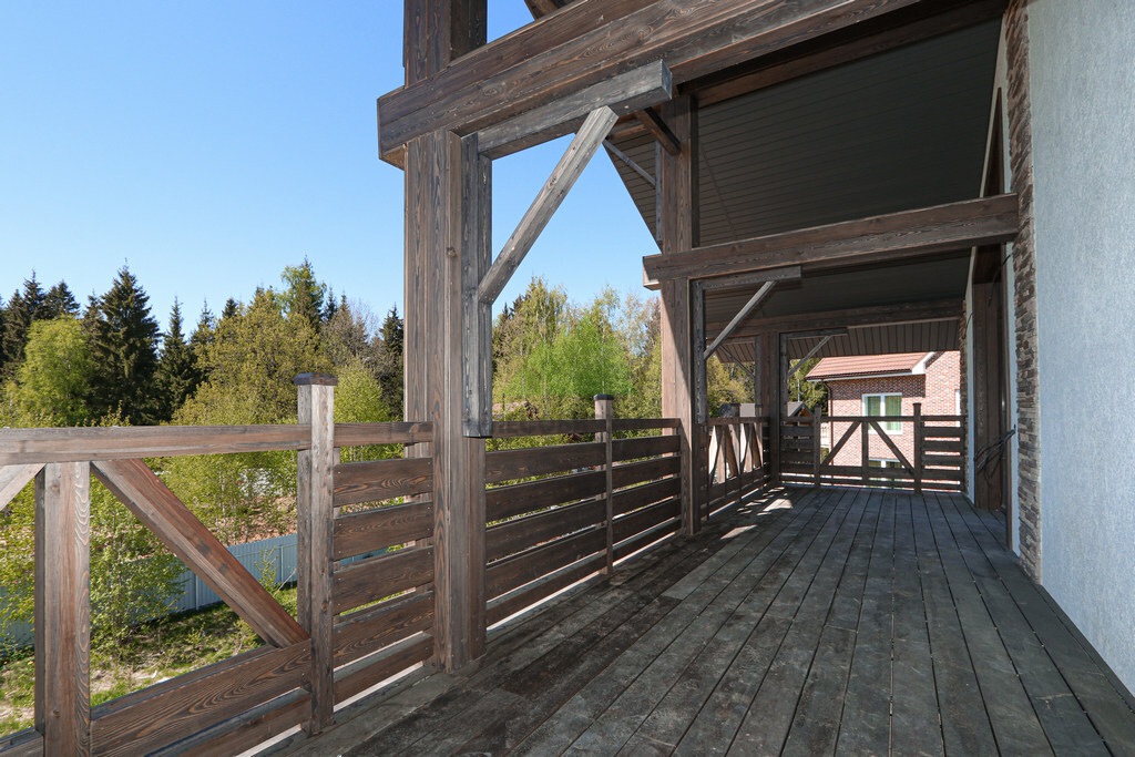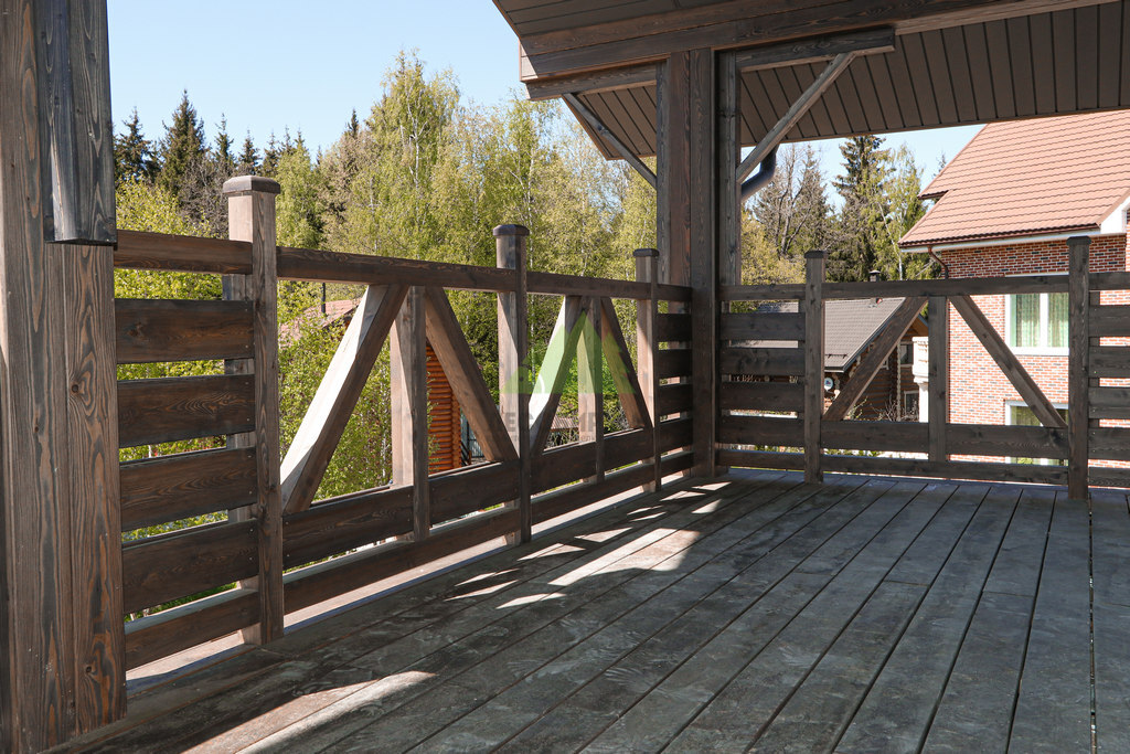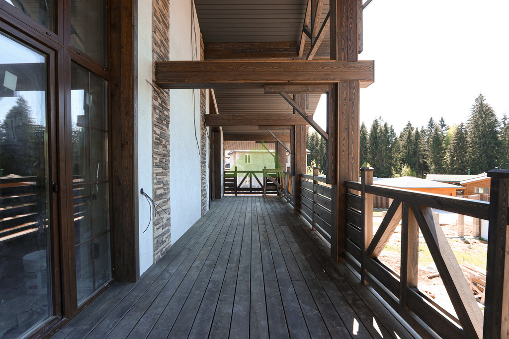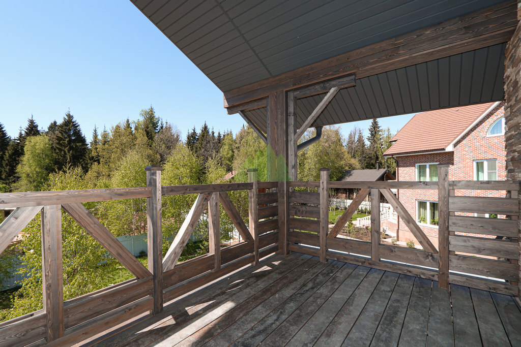 Реализация проекта проходила в несколько этапов. На первом этаже мы тщательно подготовили основание для террасы и уложили палубную доску из лиственницы, создав прочное и красивое покрытие, которое будет радовать владельцев многие годы. Затем, следуя стилистике Шале, наши мастера приступили к монтажу декоративных ограждений, которые не только обеспечивают безопасность, но и служат важным элементом дизайна. Потолок, ригели, дверные откосы и наличники были искусно обшиты планкеном из лиственницы, создавая единое гармоничное пространство.