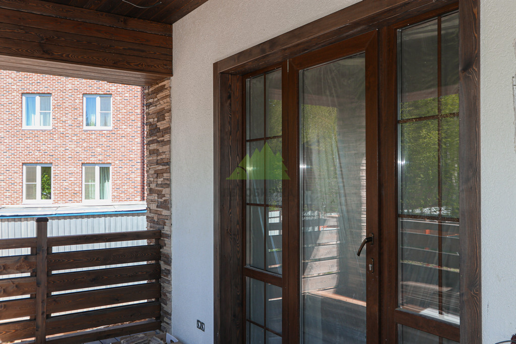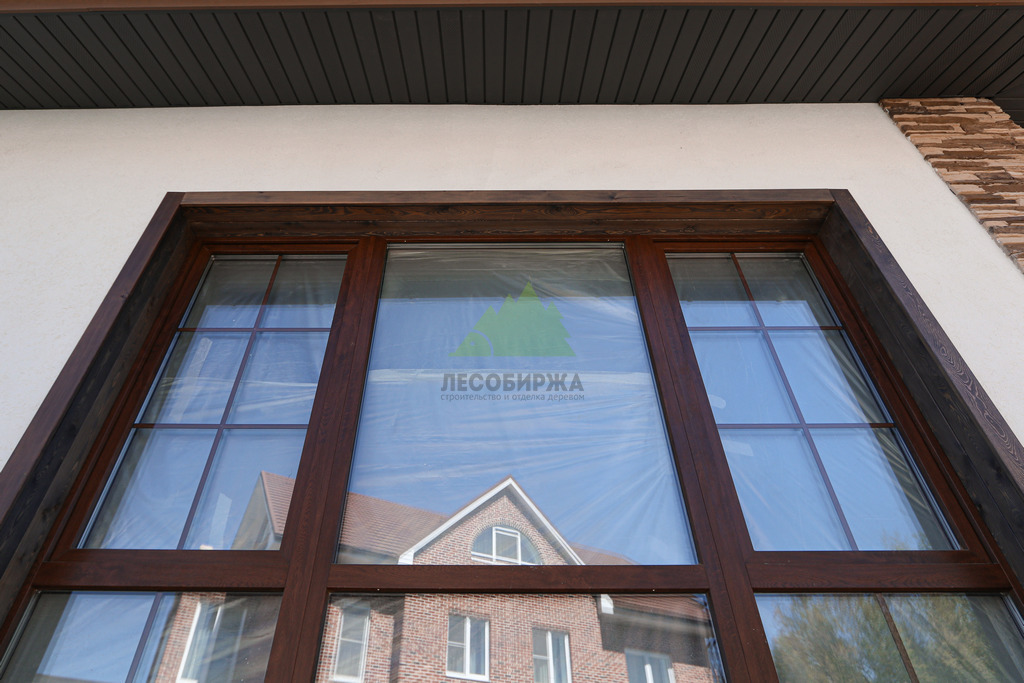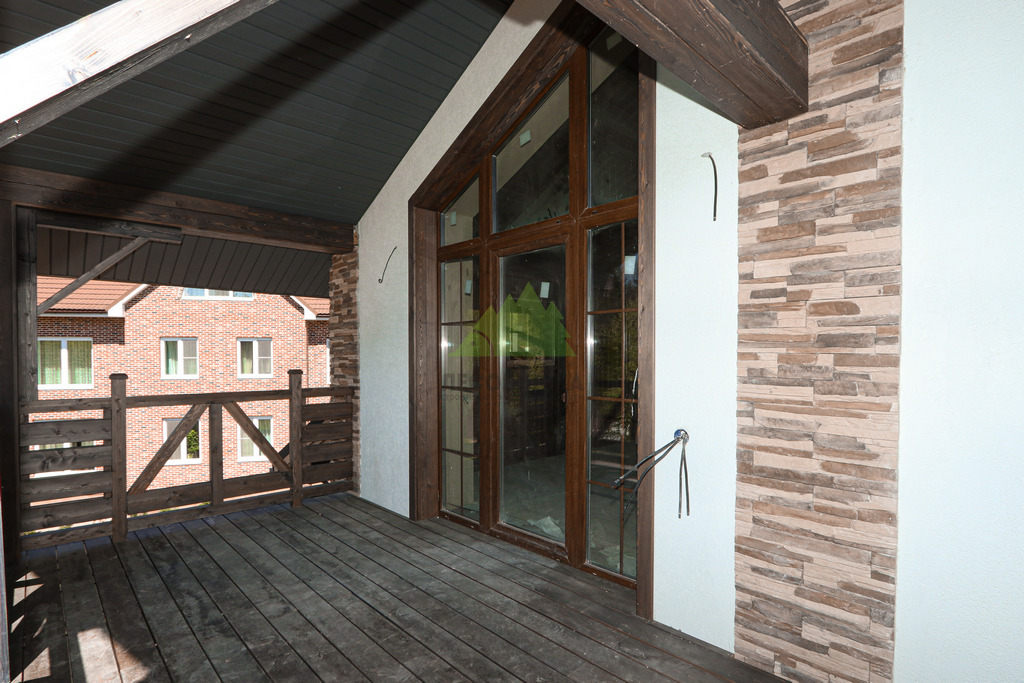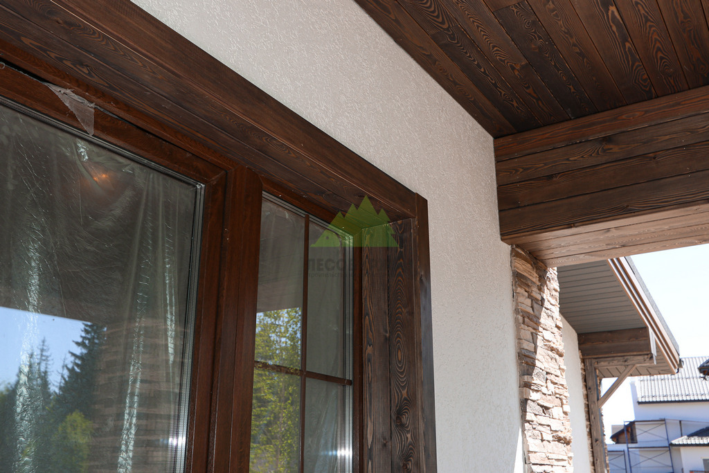 Особое внимание было уделено балкону второго этажа. Здесь мы воплотили в жизнь задумку клиента, обшив его вертикальными балками, которые придают строению характерный для Шале облик. Декоративные элементы, откосы и наличники балкона также выполнены из лиственничного планкена, обеспечивая визуальную целостность всего фасада. Благодаря предварительно выполненной отделке камнем, которую уже имел коттедж, наши деревянные элементы идеально дополнили существующий дизайн, подчеркнув многообразие фактур и материалов, столь свойственное альпийскому стилю.