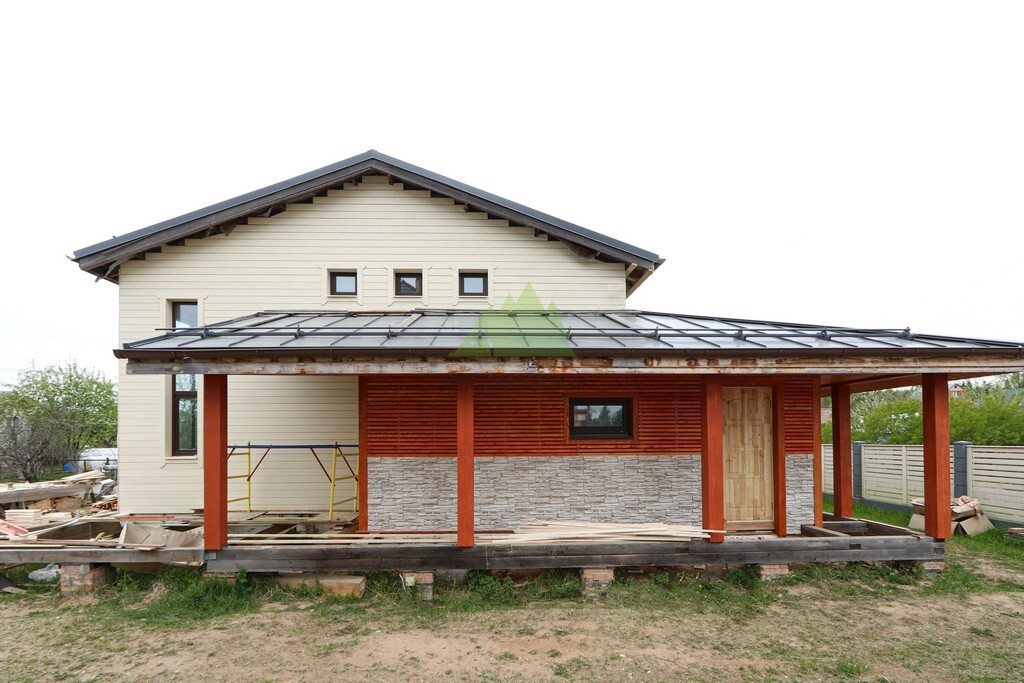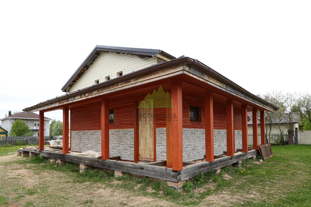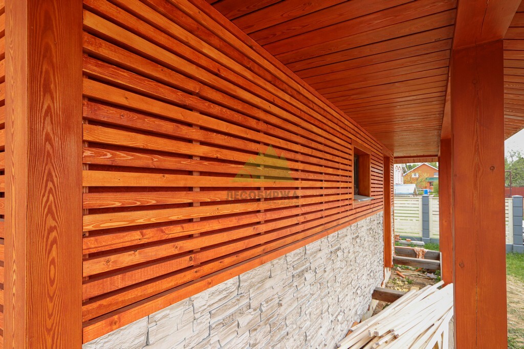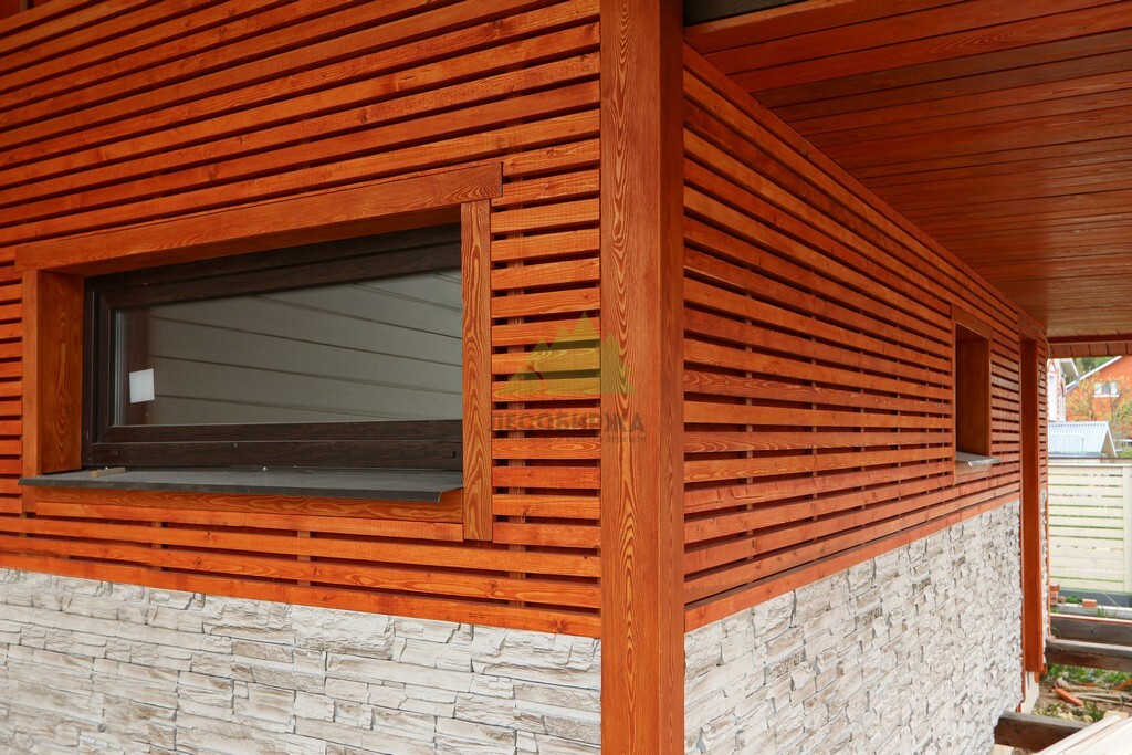 - Изысканный внешний вид: Скошенный планкен из сосны создаёт на фасаде неповторимый рельефный узор, который виртуозно сочетается с другими отделочными материалами. В этом проекте гармония дерева и имитации камня на террасе достигла высшей точки, вызвав восхищение у заказчика и наших специалистов.