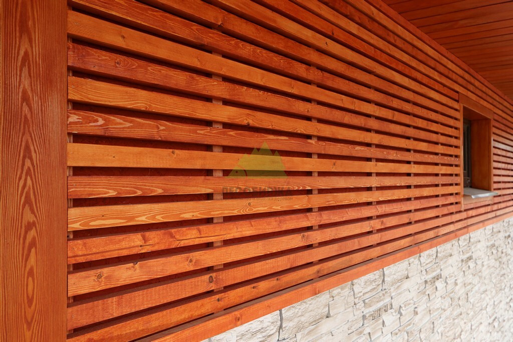- Неповторимая эстетика: Лиственница обладает выразительной текстурой и благородным янтарным оттенком, который со временем приобретает ещё более глубокий и насыщенный вид. При правильной обработке и защитном покрытии фасад из лиственницы становится настоящим произведением искусства, притягивающим взгляды.