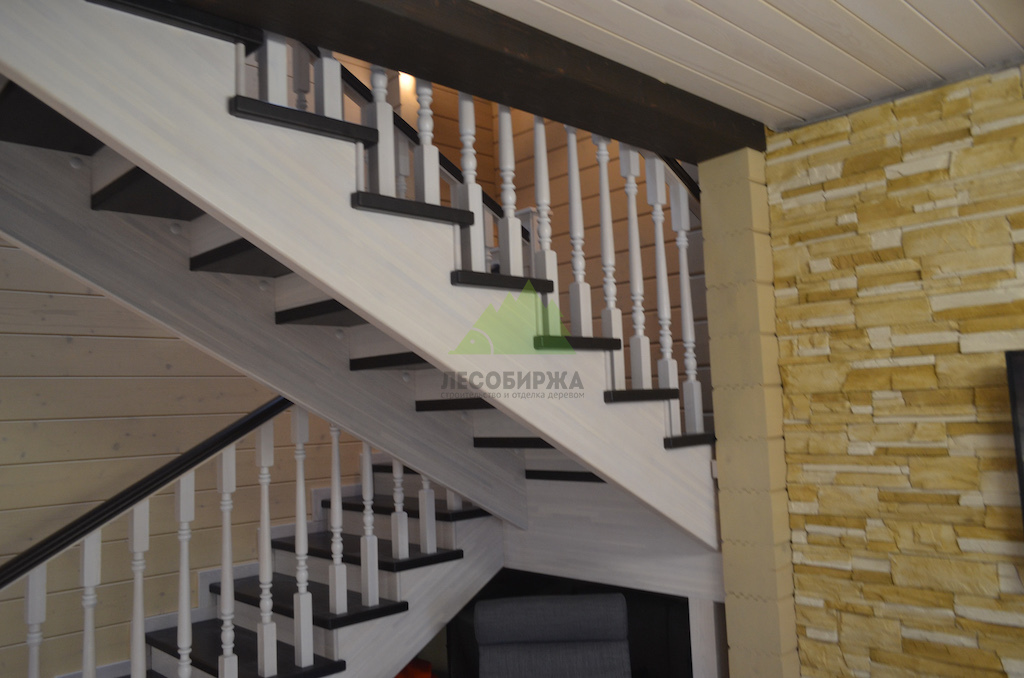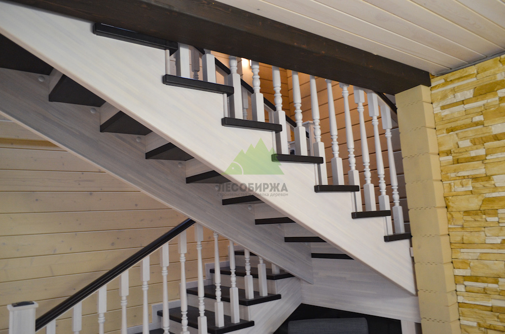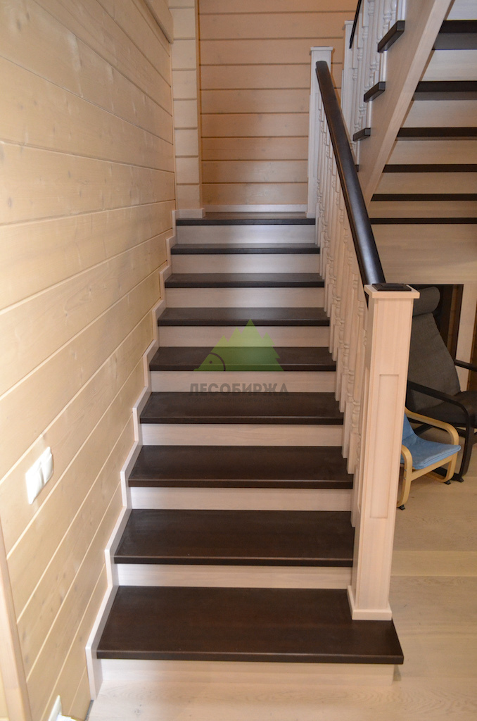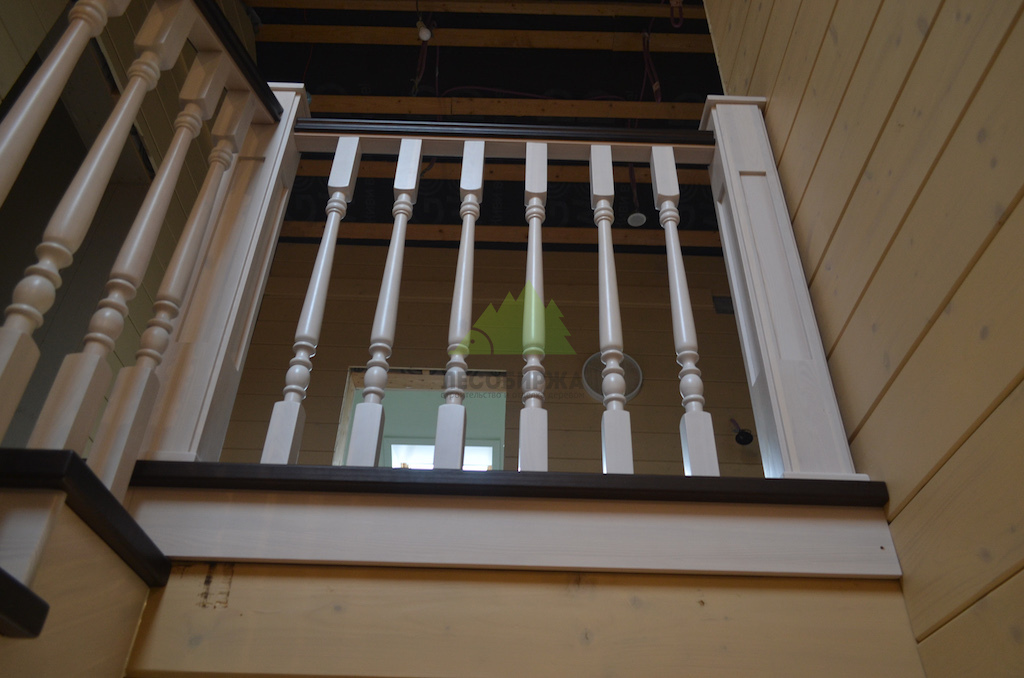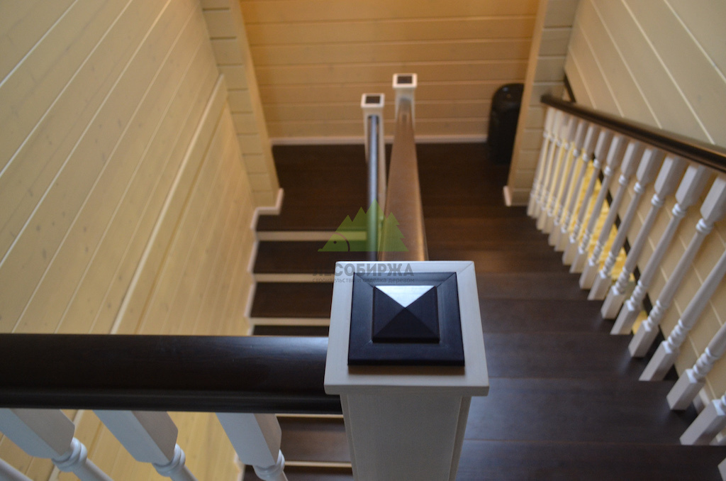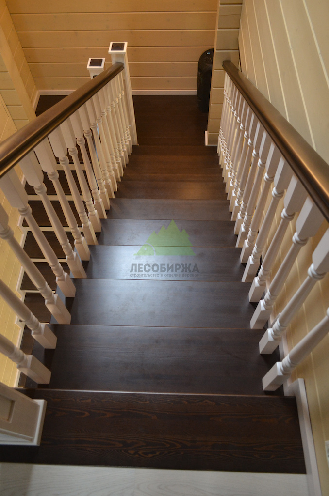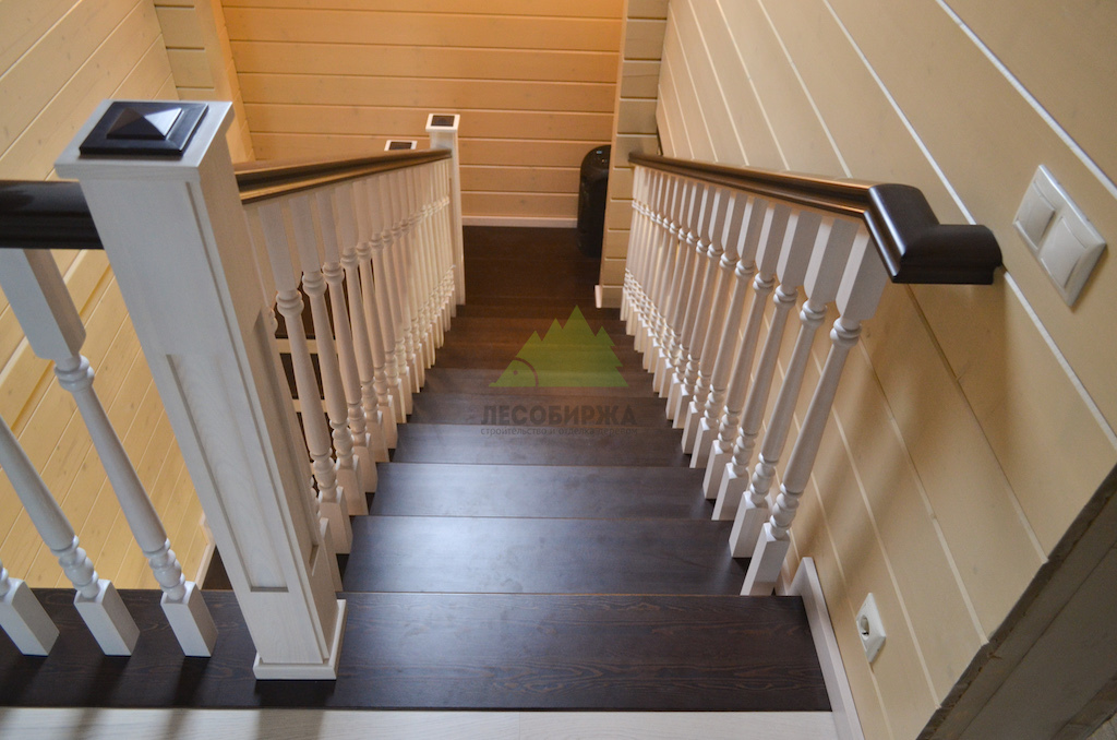 Вопрос безопасности был решен с присущим Лесобирже-Спб вниманием к деталям. На втором марше было выполнено двойное ограждение – это не только оригинальное дизайнерское решение, но и целенаправленная мера по усилению конструкции и обеспечению максимальной безопасности на этом участке. Наши специалисты после тщательных расчетов предложили этот вариант, и он был с одобрением принят заказчиком как наиболее удачный и функциональный. Ограждение лестничных маршей оформлено с большим вкусом: точеные, фигурные балясины и оригинальной формы столбы создают впечатление прочности и основательности.