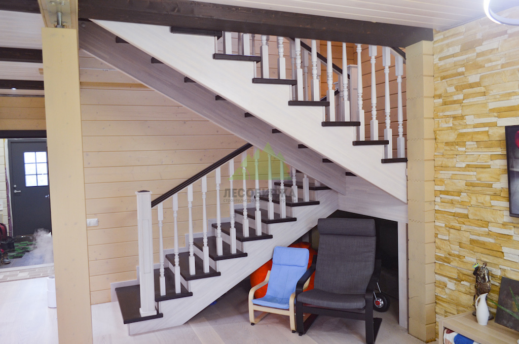 Особое внимание было уделено цветовому решению и финишной отделке. Вся конструкция лестницы, включая балясины, столбы, подступенки и уникальные пирамидальные оголовки, была окрашена в изумительное сочетание двух цветов: насыщенного темного шоколада и чистого белого, создавая эффектный контраст. Использование полупрозрачного оттенка "шоколад" позволило подчеркнуть природную текстуру древесины, придав конструкции особую глубину и благородство. Этот контраст выгодно выделяет изящество и утонченность линий, подчеркивая современный стиль интерьера. Темный оттенок идеально перекликается с цветом декоративных фальшбалок на потолке, объединяя пространство в единую концепцию и создавая впечатление целостности и продуманности.