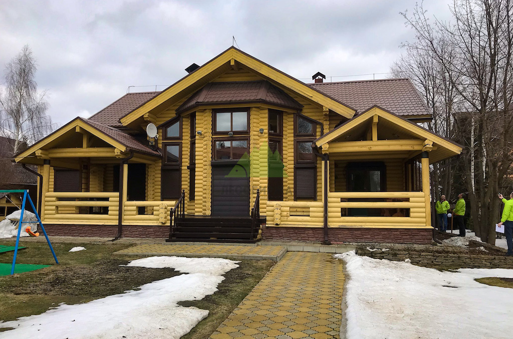 К нам обратилась заказчица Ангелина с серьезной проблемой: фасады двух ее домов, построенных в 2003 году, и терраса нуждались в срочной реставрации. Один дом был выполнен из оцилиндрованного бревна, другой — облицован блок-хаусом. Предыдущее покрытие фасадов, к сожалению, не выдержало испытание временем и было нанесено без соблюдения технологических норм, что привело к быстрому разрушению и обнажению древесины. Покраска террасы, проведенная обычным укрывным пленочным составом, прослужила всего четыре года, после чего краска начала отслаиваться, пузыриться и шелушиться, а настил из сосны на террасе практически превратился в труху. Перед нами стояла амбициозная задача: не просто перекрасить, а полностью восстановить строения, обеспечив им защиту на срок не менее 15 лет.