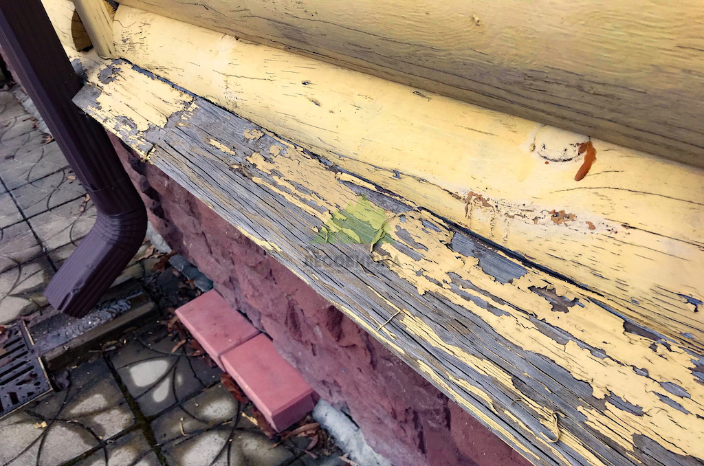 - Значительное посерение древесины на фасадах обоих домов, особенно в местах отслоения старой краски, что свидетельствовало о разрушении лигнина под воздействием УФ-излучения и влаги.