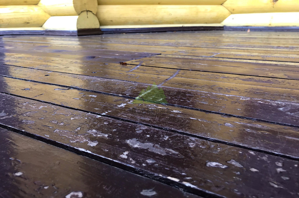 - Полное разрушение защитного слоя на террасе, с гниением и деформацией досок настила.