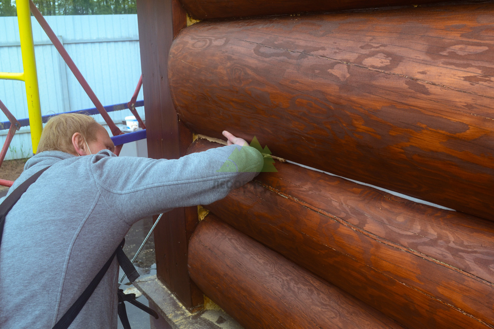 1. Подготовка швов. Все межвенцовые пространства и трещины были тщательно очищены от пыли, грязи и мелкого сора, что обеспечило идеальную адгезию герметика.