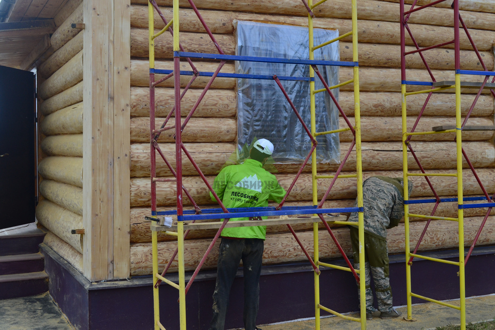 3. Нанесение герметика. С помощью профессионального пистолета герметик Remmers равномерно распределялся по межвенцовым швам, заполняя все полости. Затем, используя специализированные шпатели, мастера Лесобиржи-Спб "ювелирно" формировали аккуратные и ровные швы, придавая фасаду завершенный и эстетичный вид.