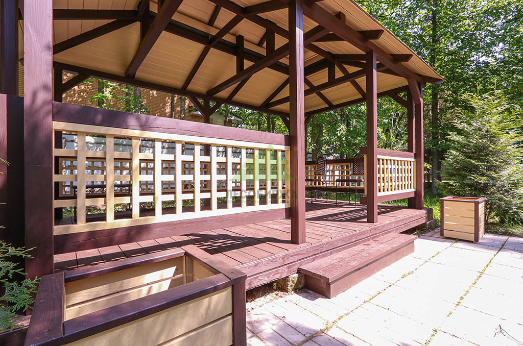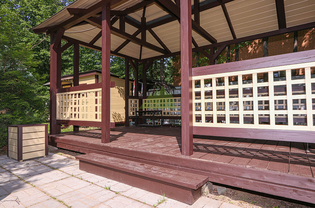 Отдельного внимания заслуживает роскошная беседка из бруса, а также элегантные кашпо нашего собственного производства, которые также подверглись преображению. Для них мы выбрали элитную систему окрашивания на основе гибридного масла "Renner" M300 в комплексе с грунтом "Renner" M101. Процесс подготовки беседки был аналогично тщательным: мы выполнили шлифовку всей поверхности, как снаружи, так и внутри, включая пол, используя абразивы P80 и P120 для достижения идеальной гладкости и открытости пор древесины.