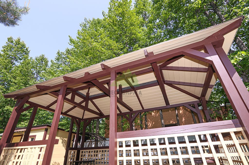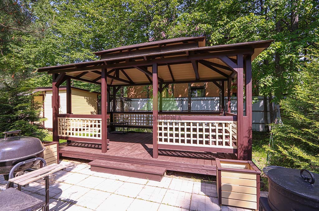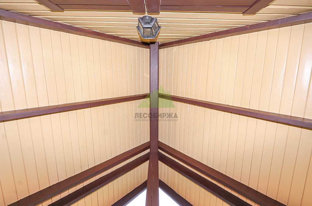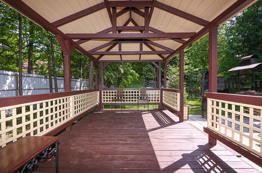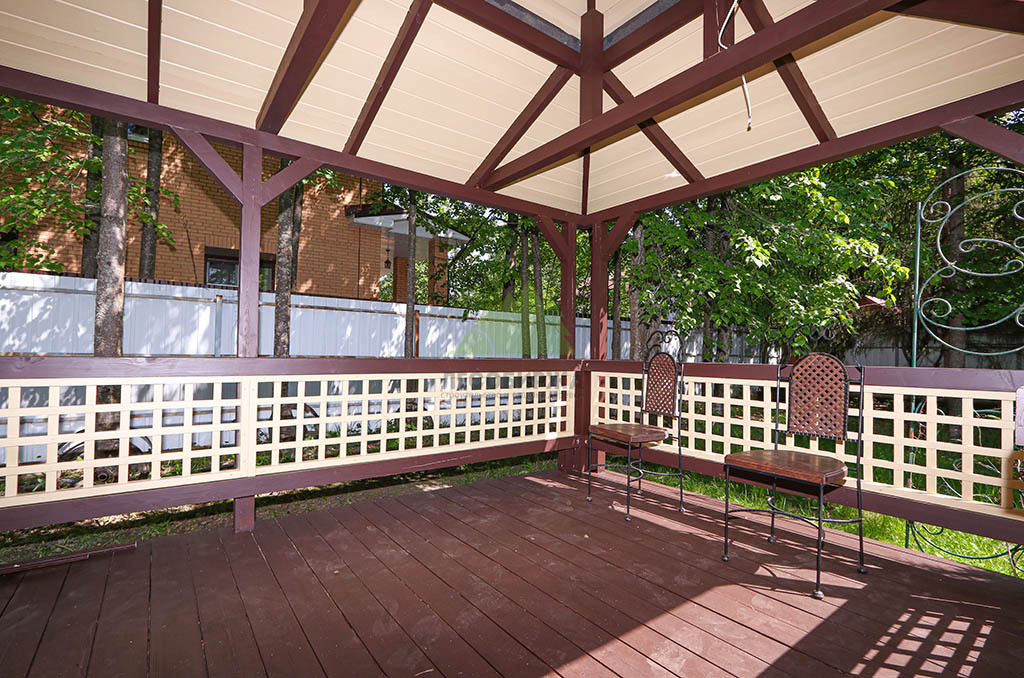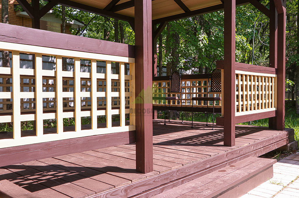 После шлифовки был нанесен грунт "Renner" M101, который глубоко пропитал древесину, подготовив ее к масляному покрытию. По его впитыванию мы так же бережно вышлифовали поверхность, удаляя поднятые пигментом древесные волокна (ворс). Далее следовало нанесение первого слоя масла "Renner" M300. Излишки масла были аккуратно удалены ветошью, чтобы избежать образования пленки и обеспечить глубокое проникновение состава. После высыхания гидромасла, которое происходило в условиях контролируемой влажности, мы провели еще одну промежуточную шлифовку абразивом P200 для устранения мельчайших неровностей и повышения адгезии. Завершающим аккордом стало нанесение второго, финишного слоя масла "Renner" M300, который придал беседке глубокий, благородный коричневый оттенок и надежную защиту.