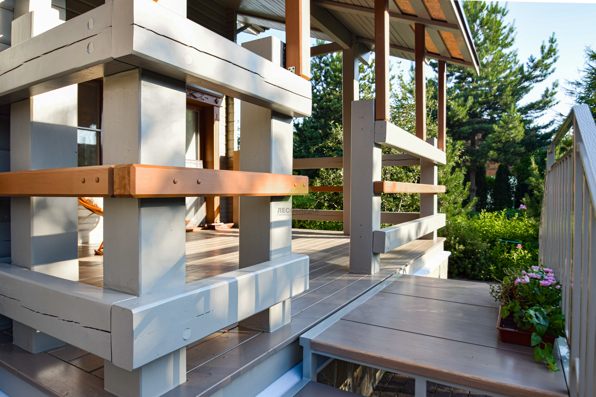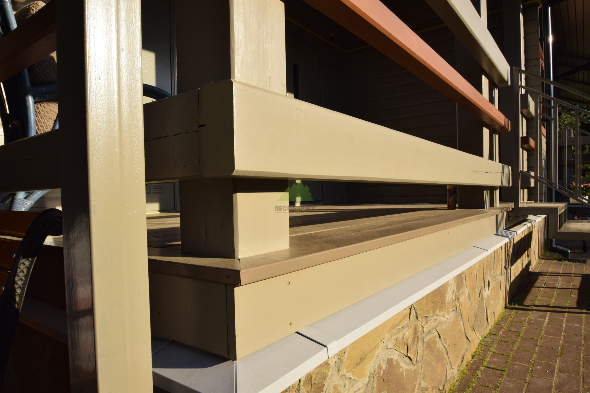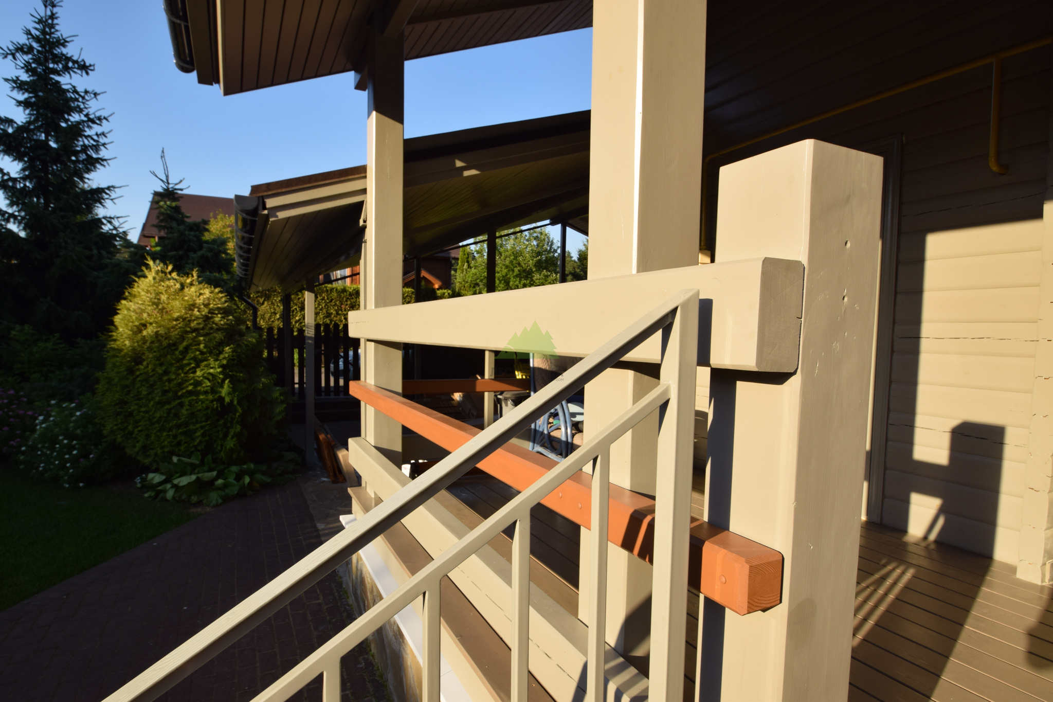 Следующим шагом стала глубокая обработка древесины. В условиях высокой влажности Санкт-Петербурга и Ленинградской области дерево подвержено риску поражения биоорганизмами. Поэтому мы применили антисептические составы глубокого проникновения от Tikkurila, которые надежно защищают древесину от грибка, плесени и насекомых. Выбор продукции Tikkurila не случаен – этот бренд зарекомендовал себя как производитель высококачественных и экологически безопасных материалов, идеально подходящих для наших климатических условий. Антисептическая обработка создает барьер, продлевая срок службы всей конструкции. После этого этапа поверхность была загрунтована специализированным адгезионным грунтом. Грунтовка выравнивает впитывающую способность древесины, улучшает сцепление между деревом и финишным покрытием, а также сокращает расход краски, обеспечивая более равномерное и насыщенное окрашивание. Каждый слой наносился с соблюдением всех технологических пауз, необходимых для полного высыхания.