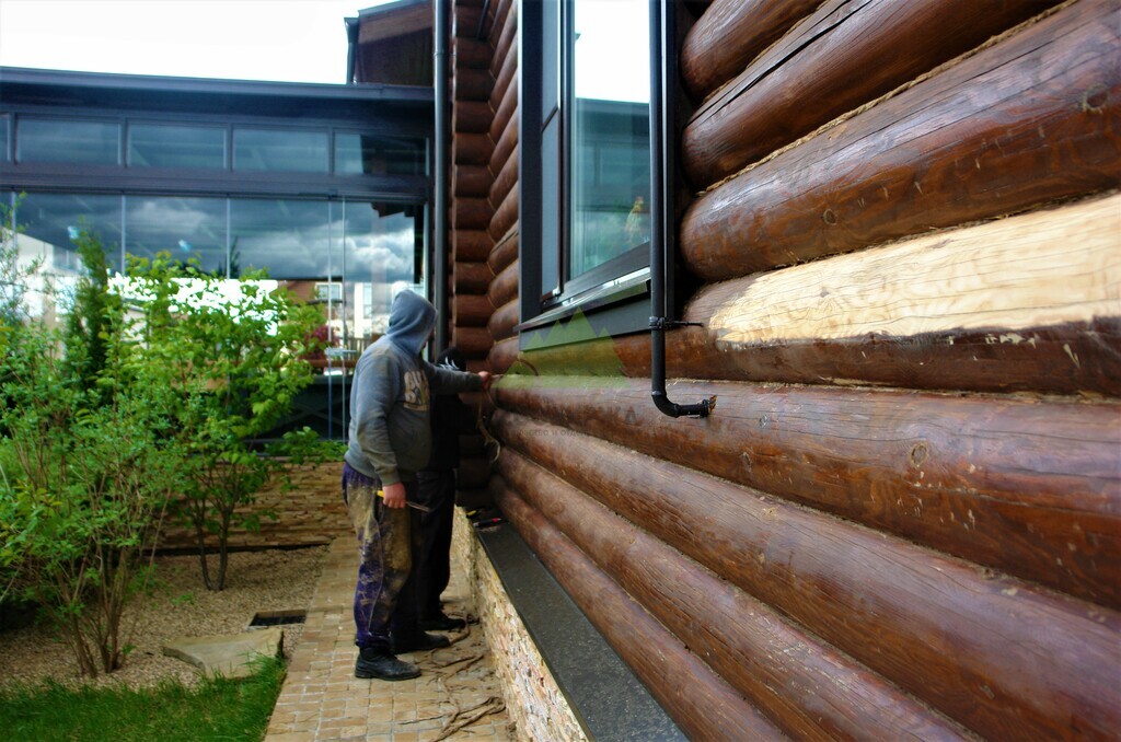 Особое внимание мы уделили торцевым частям дома, которые являются наиболее уязвимыми для воздействия влаги и температурных перепадов. Глубокие трещины в бревнах не только портили внешний вид, но и создавали риски для всей конструкции. После тщательной шлифовки торцы были обработаны торцевым герметиком Renner AY M422. Этот продукт, также от итальянского производителя, эффективно заполняет трещины, предотвращая проникновение влаги и загнивание древесины, тем самым существенно продлевая срок службы сруба. Его эластичность позволяет компенсировать естественные движения древесины, исключая повторное растрескивание герметика.