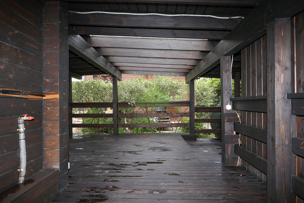 - Нанесение финишного слоя гидромасла Renner YS M300: заключительный слой масла обеспечивает максимальную защиту и придает фасаду бани и террасе глубокий, насыщенный цвет. Именно на этом этапе проявляется вся красота древесины под новым, благородным оттенком, подобранным в тон к основному дому.