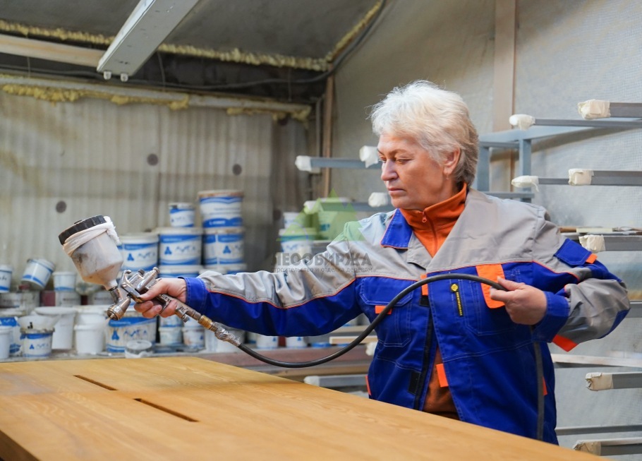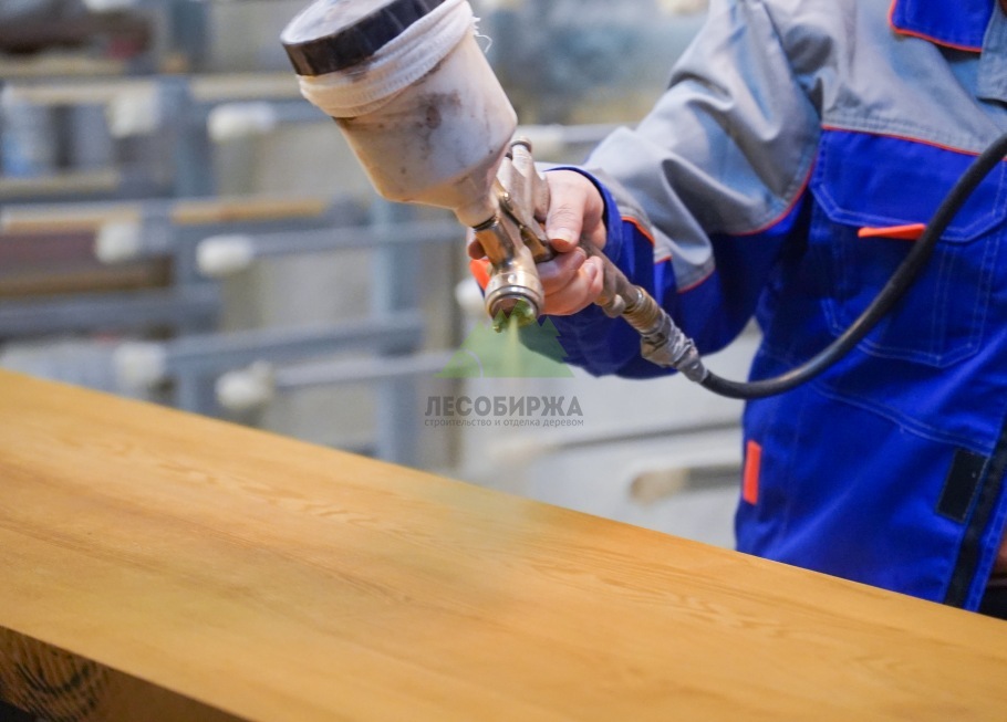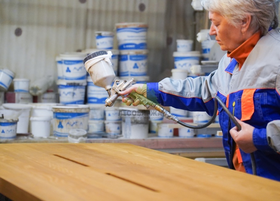 После подготовки поверхности наступил черед грунтования. Грунтовка служит нескольким целям: она запечатывает поры древесины, предотвращая избыточное впитывание лака и обеспечивая равномерность последующего слоя. Кроме того, качественный грунт улучшает адгезию, то есть сцепление лака с деревом, что является залогом долговечности покрытия. В Лесобиржа-Спб мы используем только проверенные составы, которые идеально совместимы с финишными материалами. Нанесение грунта также производилось с применением безвоздушного распыления, что гарантировало тонкий, равномерный слой без подтеков и разводов.