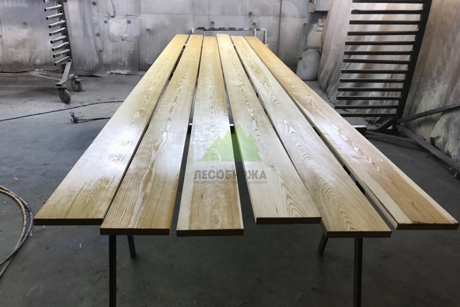 - Предварительная шлифовка: Каждая доска планкена прошла тщательную шлифовку на станке двумя лентами с последовательным использованием зерна 80 и 150. Это обеспечило идеально гладкую поверхность, удаление ворса и максимальное раскрытие пор древесины для лучшего проникновения защитных составов.