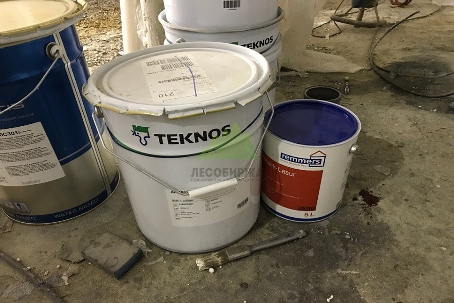- Нанесение первого слоя лака на лицевую сторону (161,2 м2): После высыхания грунта был нанесен первый слой финишного лака Teknos. Этот слой начал формирование защитной пленки и придал древесине желаемый оттенок.