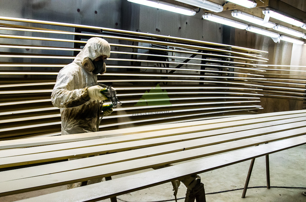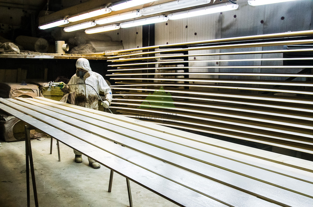 - Равномерное и глубокое проникновение грунта: В условиях цеха мы можем гарантировать оптимальную температуру и влажность воздуха, а также отсутствие пыли и посторонних примесей. Грунтовка наносилась профессиональным оборудованием, что позволило добиться идеально равномерного слоя без потеков, пропусков или излишков. Глубокое проникновение грунта Teknos Teknol 1888 в поры древесины обеспечивает надежную защиту изнутри.