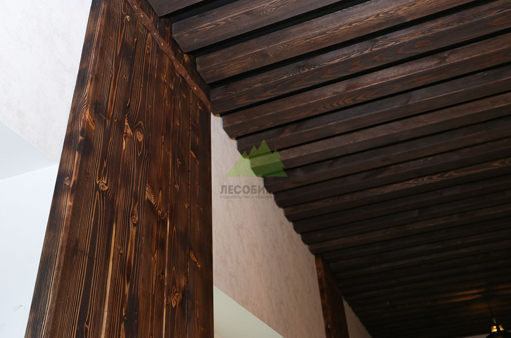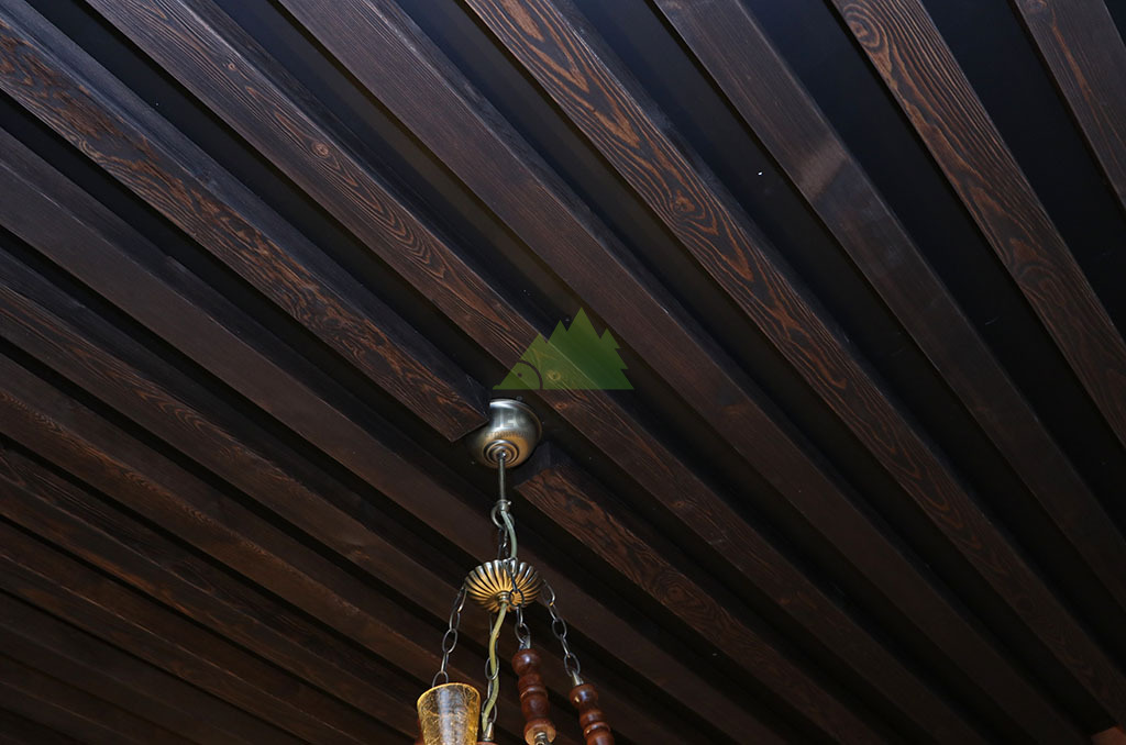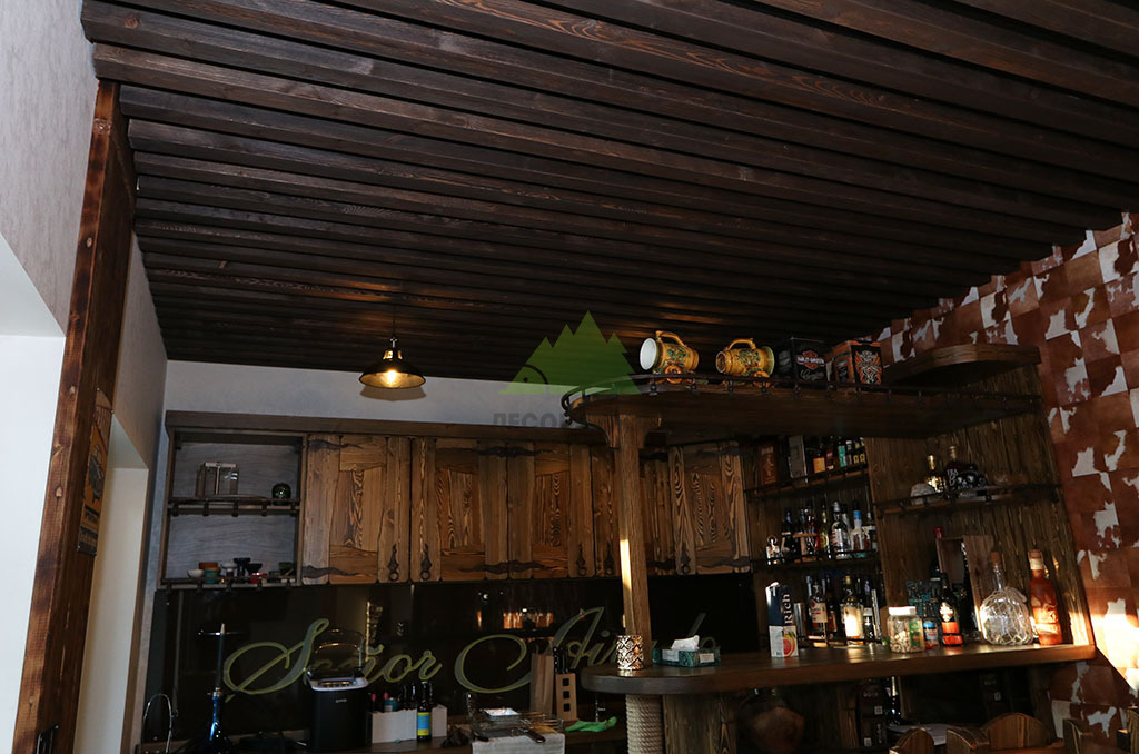 Выбор пал на фальшбалки из хвойных пород дерева, которые идеально подходят для создания теплой, естественной палитры. Хвоя обладает красивой текстурой, легка в обработке и окрашивании, что позволяет нашим специалистам добиваться именно того оттенка и степени состаривания, который идеально вписывается в общую концепцию дизайна. Наша команда в Лесобирже-Спб подошла к этому проекту с особой тщательностью, понимая, что каждая деталь будет работать на общую эстетику и функциональность будущего бара.