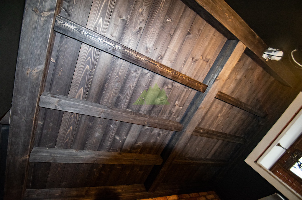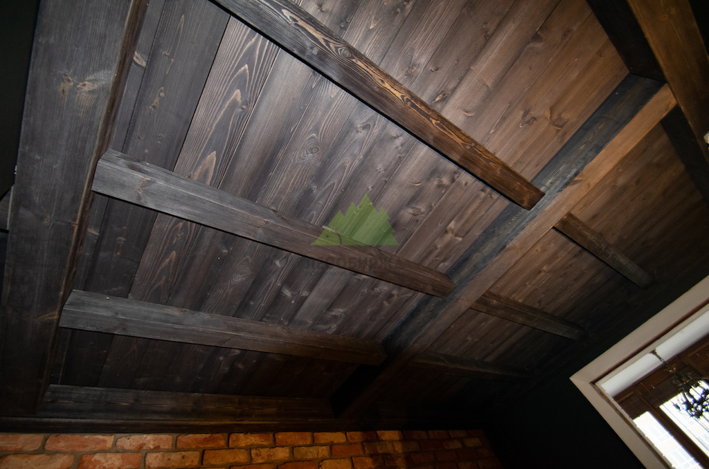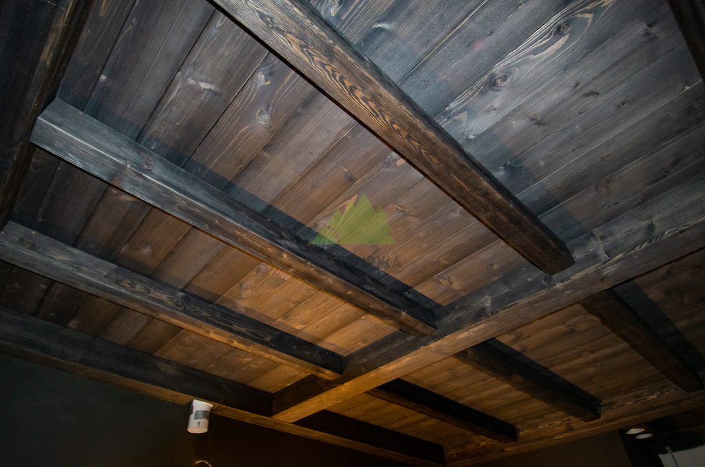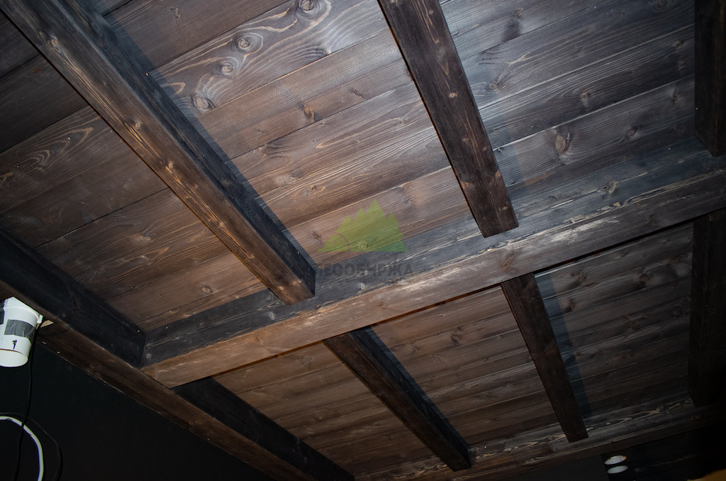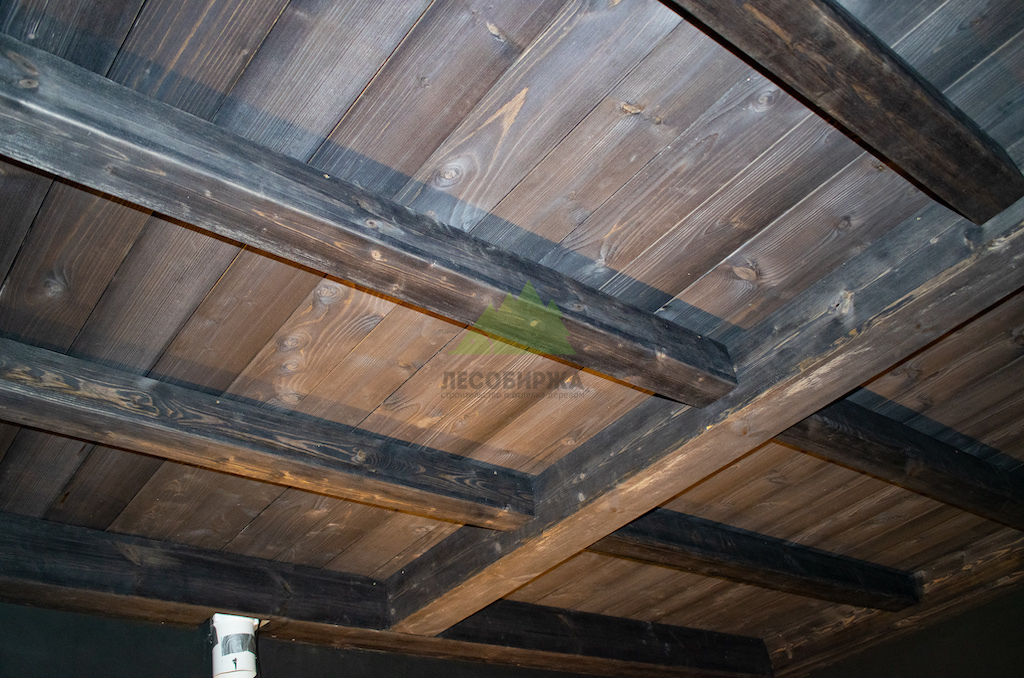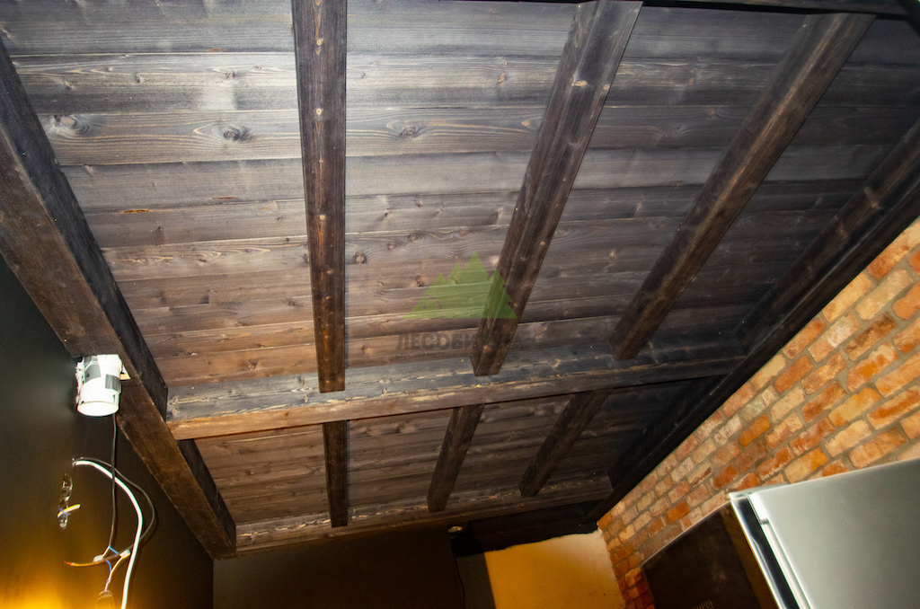 - Балки и планкен успешно скрыли мелкие неровности и дефекты базового потолка.